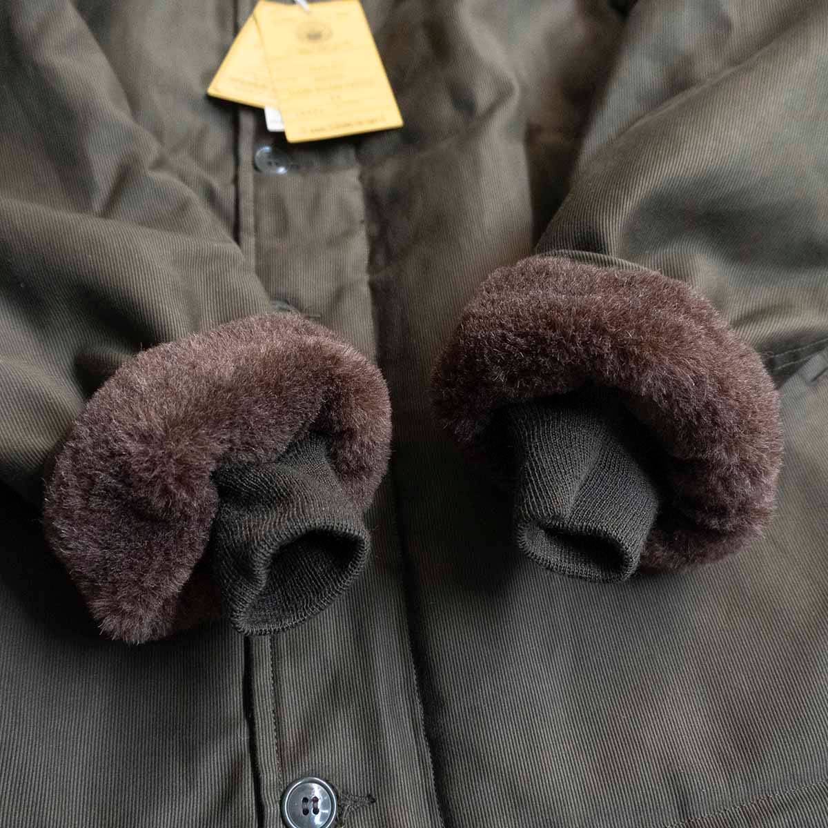 表地のジャングルクロスと裏地のアルパカライニングの間にフリーホイーラーズオリジナルのコットンフランネルを挟んだ3層構造にしており、より保温性と防風性を高めた作りになっています。勿論、袖もアルパカウールライニングとコットンフランネルによる3層構造になっています。