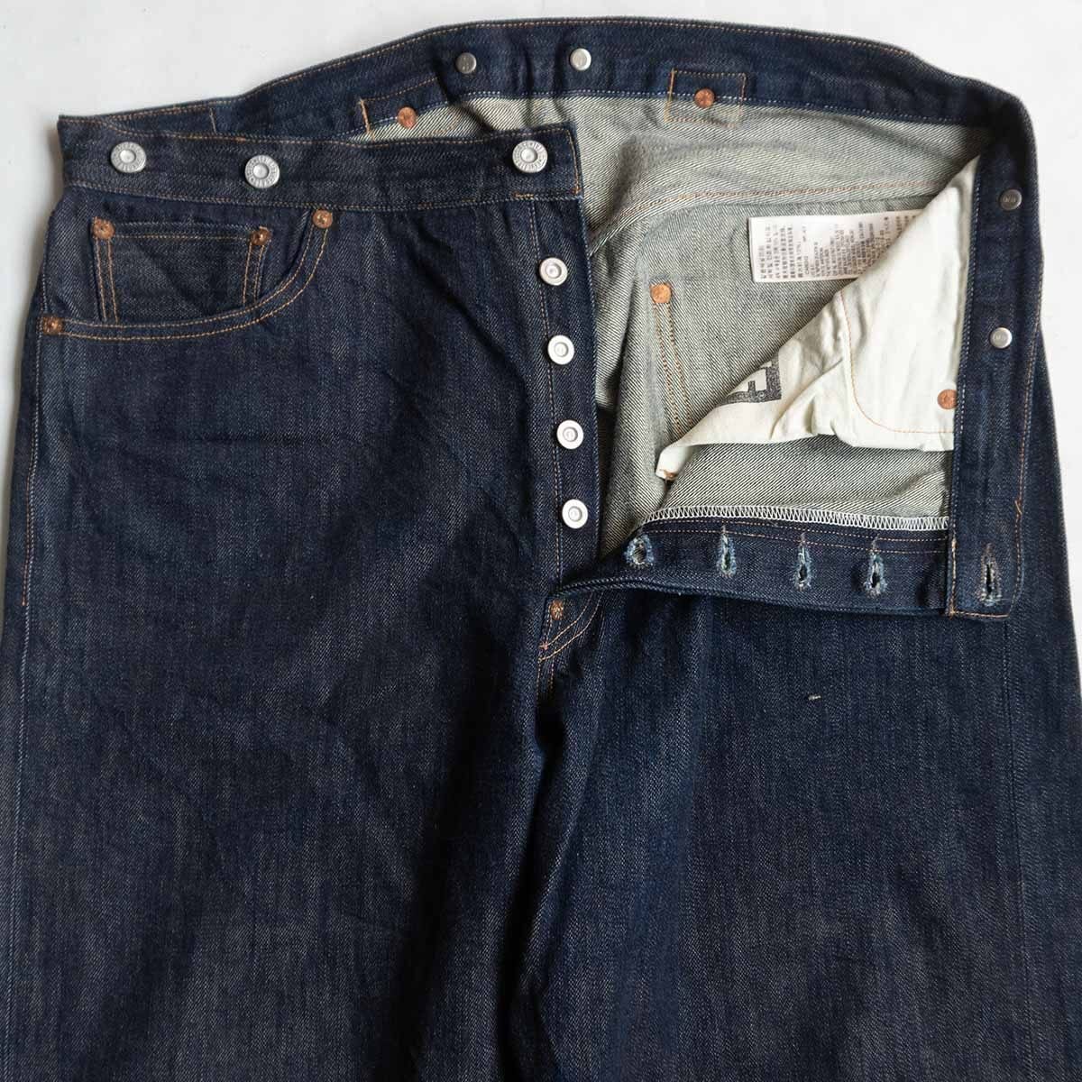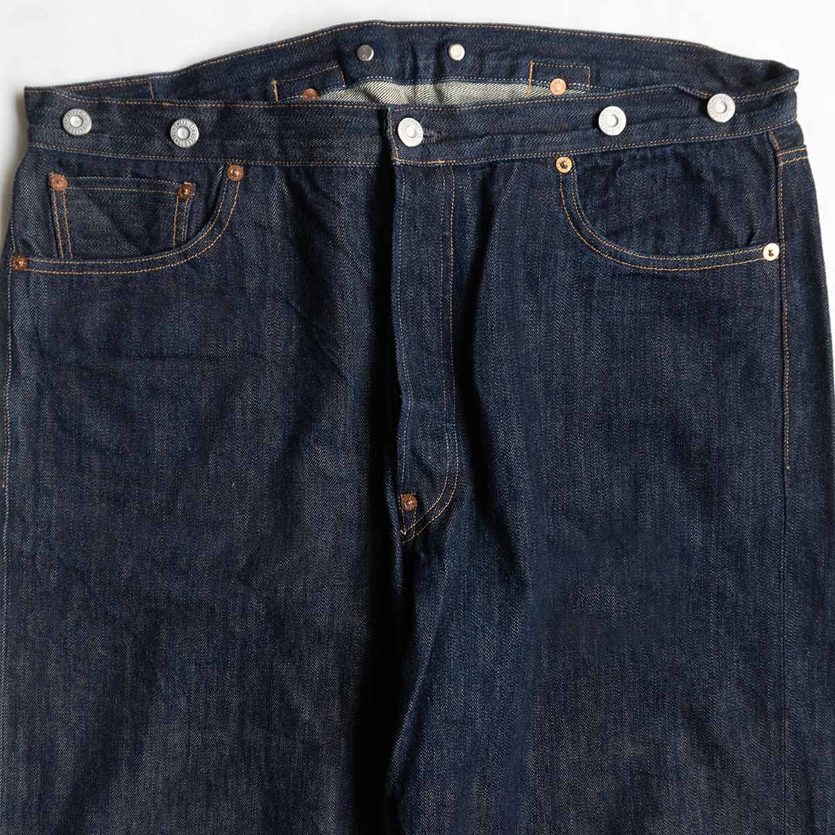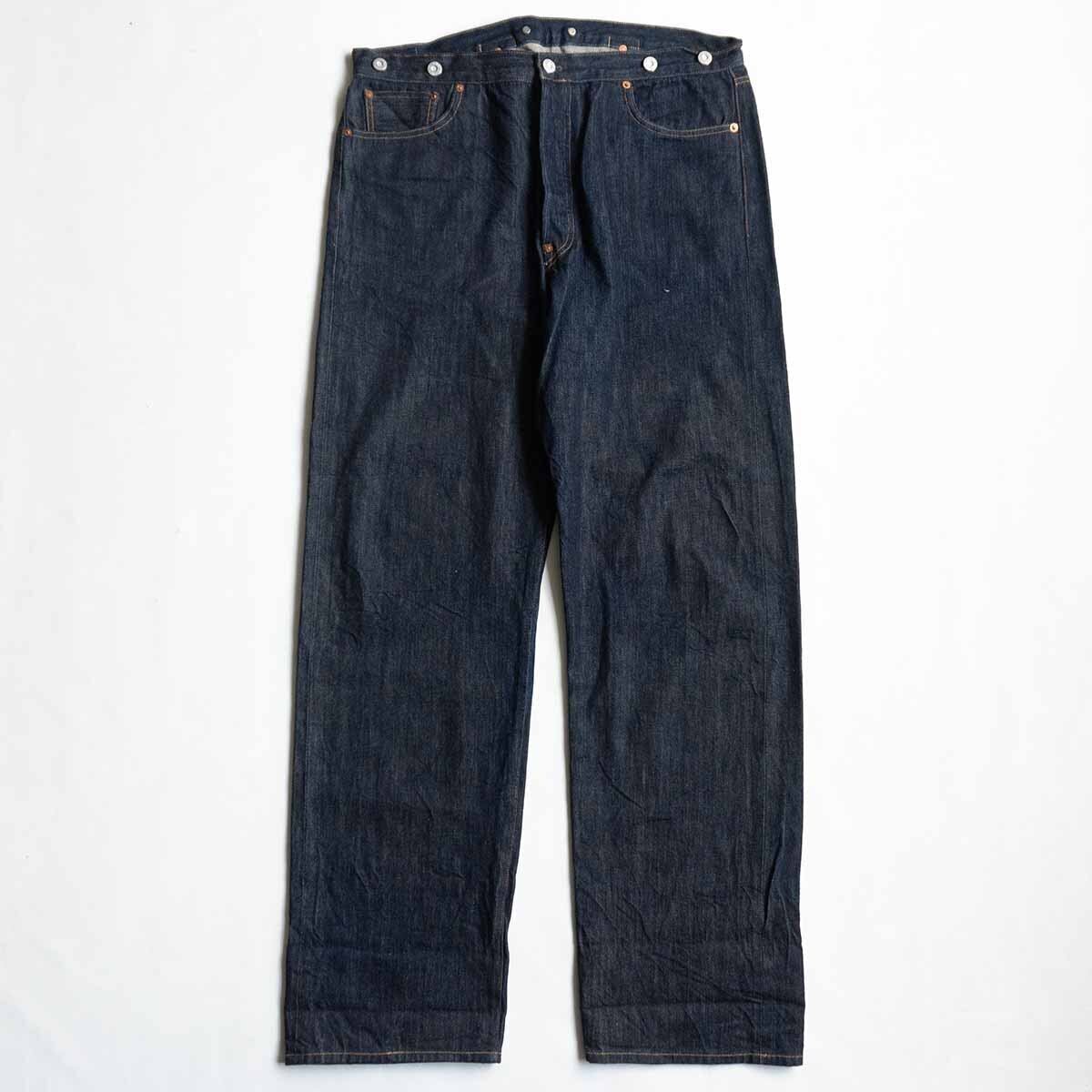 1915年当時のモデルを復刻。当時はまだベルトループは使用しておらず、サスペンダーかシンチバックでウエストを調整。生地はコーンミルズ社を使用する前でリーバイス社を示す赤耳では無く、白耳となっています。ウエストオーバーオールといわれた当時のシルエットも特徴的です。お探しの方や気になる方は是非。