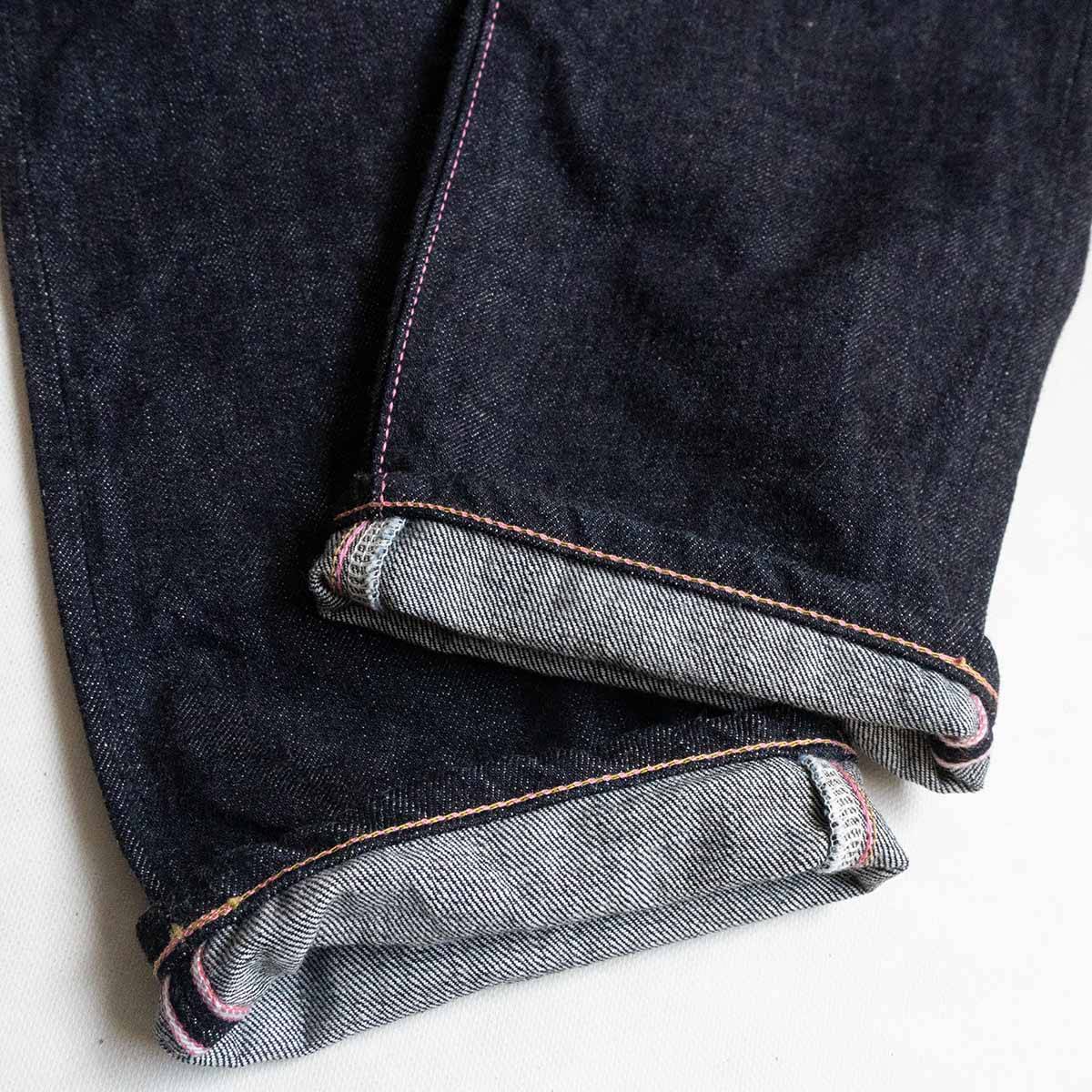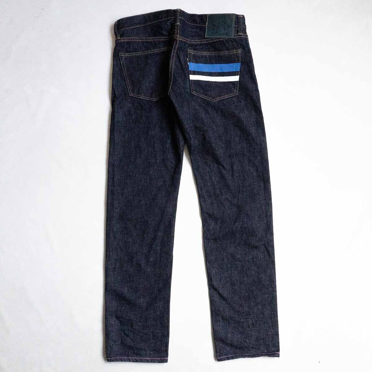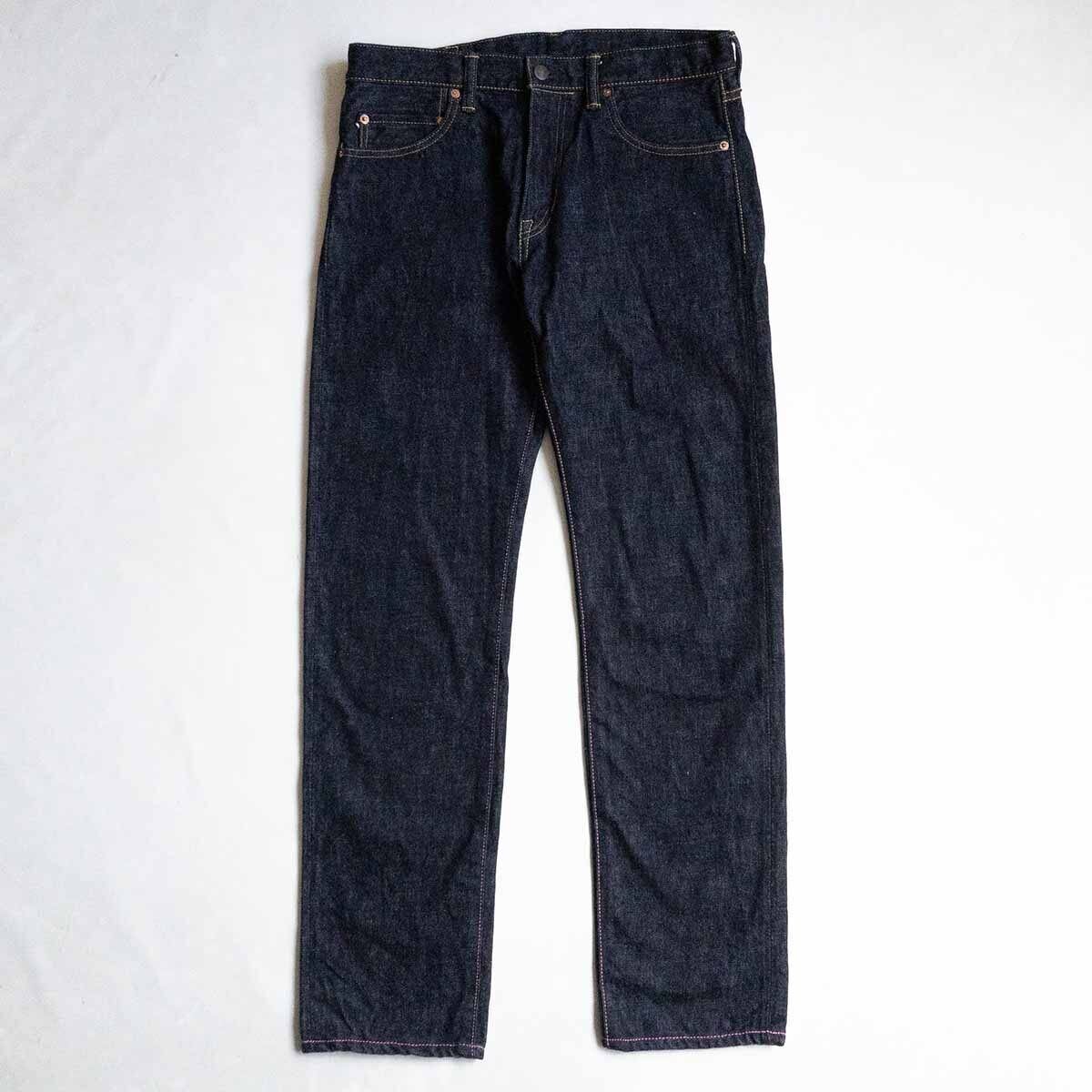 ロープ染色を繰り返し特濃インディゴブルーに染めたジンバブエコットン使用した1本。スタンダードなスリムストレートシルエットです。これから経年変化をお楽しみいただけます。