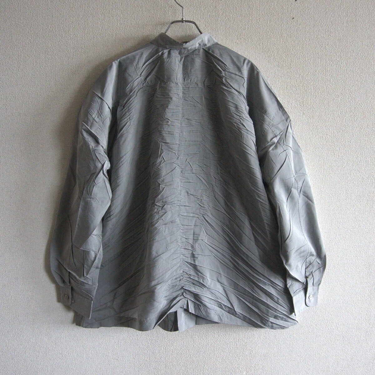 シワ加工されたポリエステルシャツ。ゆったりとしたシルエットの一着です。