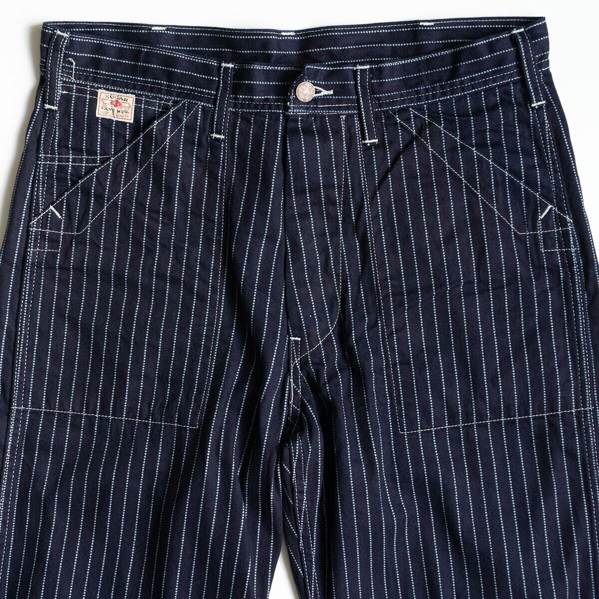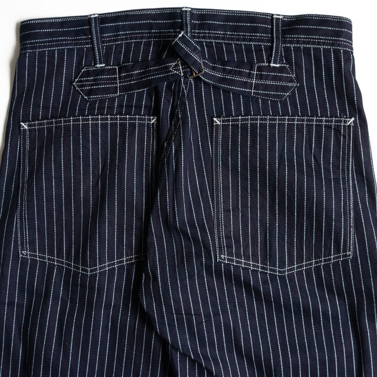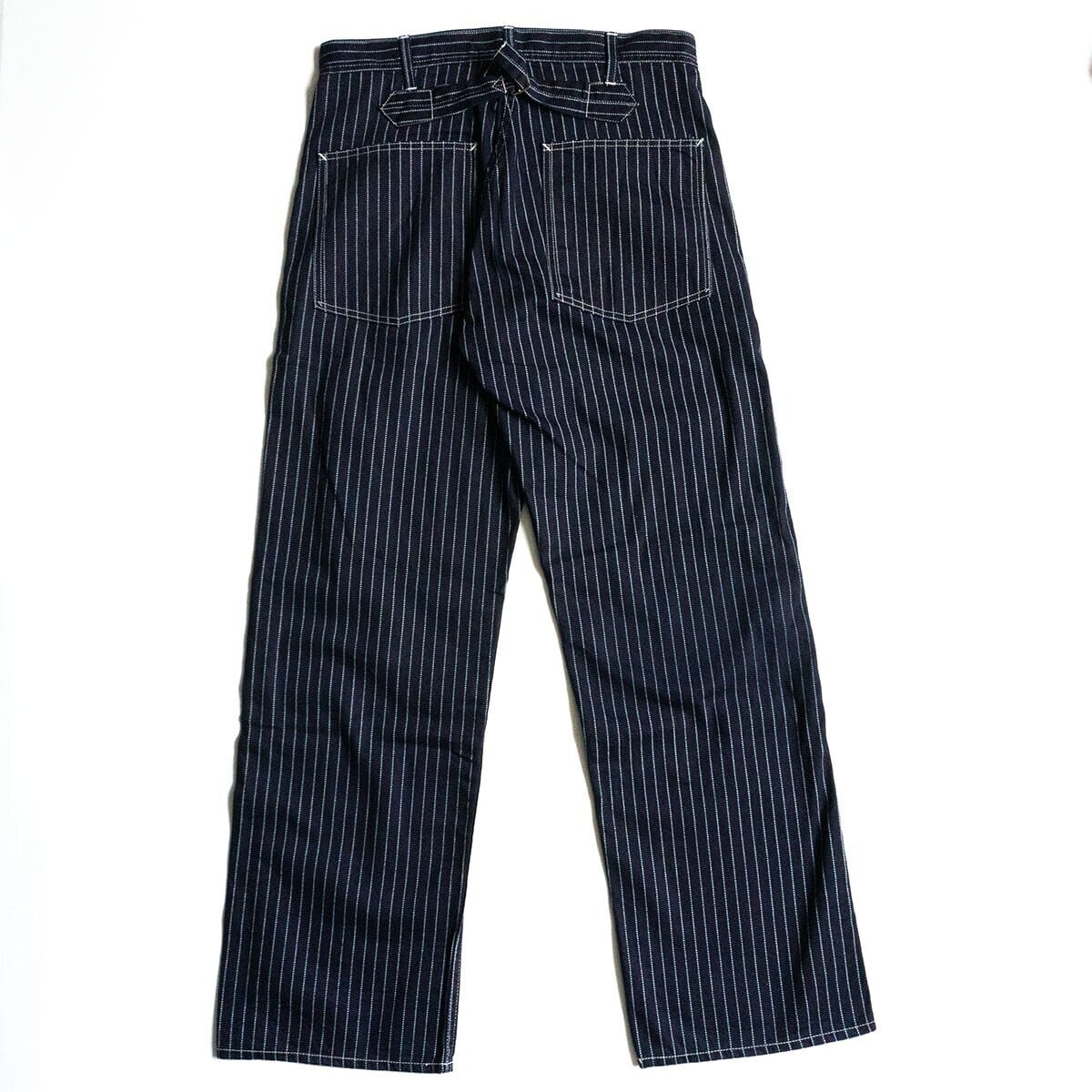 ウォバッシュ生地のワークパンツ。インディゴで染色した9オンスの生地にドットストライプ柄を抜染(ばっせん)している。型は1930年代のヴィンテージをベースにしており、シルエットはやや太めです。