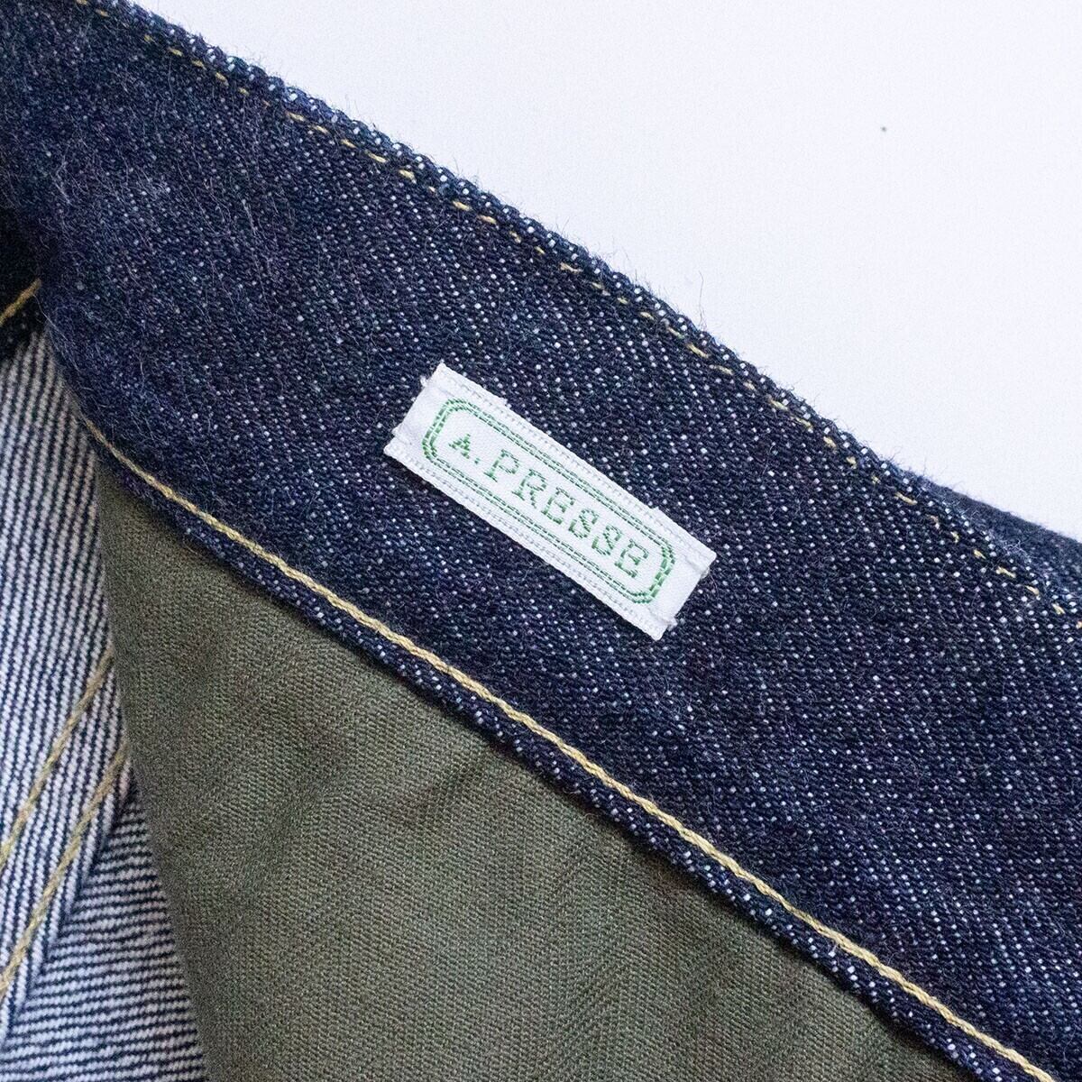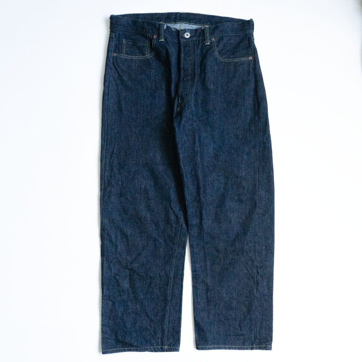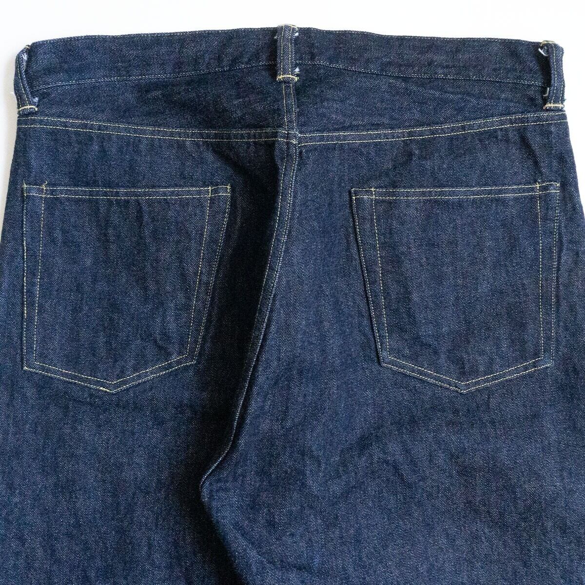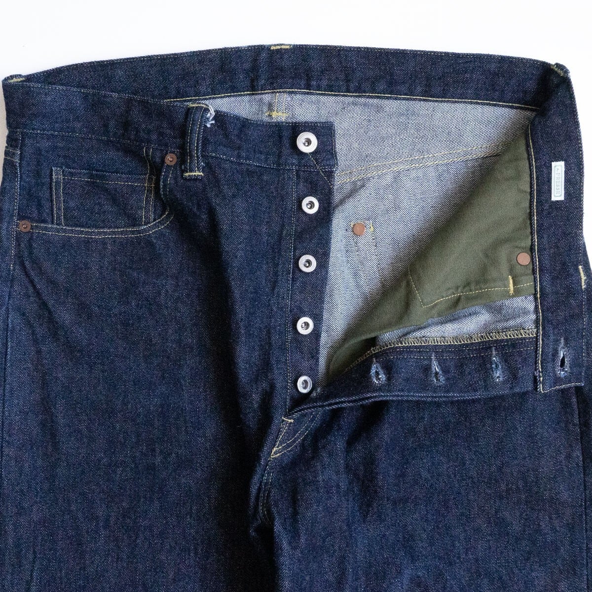 ベルトループの太さや位置、リベットの箇所など、大戦モデルを踏襲しアレンジしました。 オリジナルのタック釦を採用しています。 生地は13.5ozの大戦モデルを解析したキバタデニムです。古着から糸を解き、弱強撚ネップ 糸、綿葉カス入りで紡績しています。ムラ形状は、綿の配合と機械の設定による自然な機械ムラを 再現し、緯糸は分析の結果、経糸との回転数や形状を変えています。綿自体の色目は現在は品種 改良によって白度が高いものが生産されていますが、当時の茶綿に近いクリーミーな色を再現する よう米綿を配合しています。硫化などの混ぜ物はないレギュラーよりも濃いインディゴ色を再現しました。お探しの方は是非。