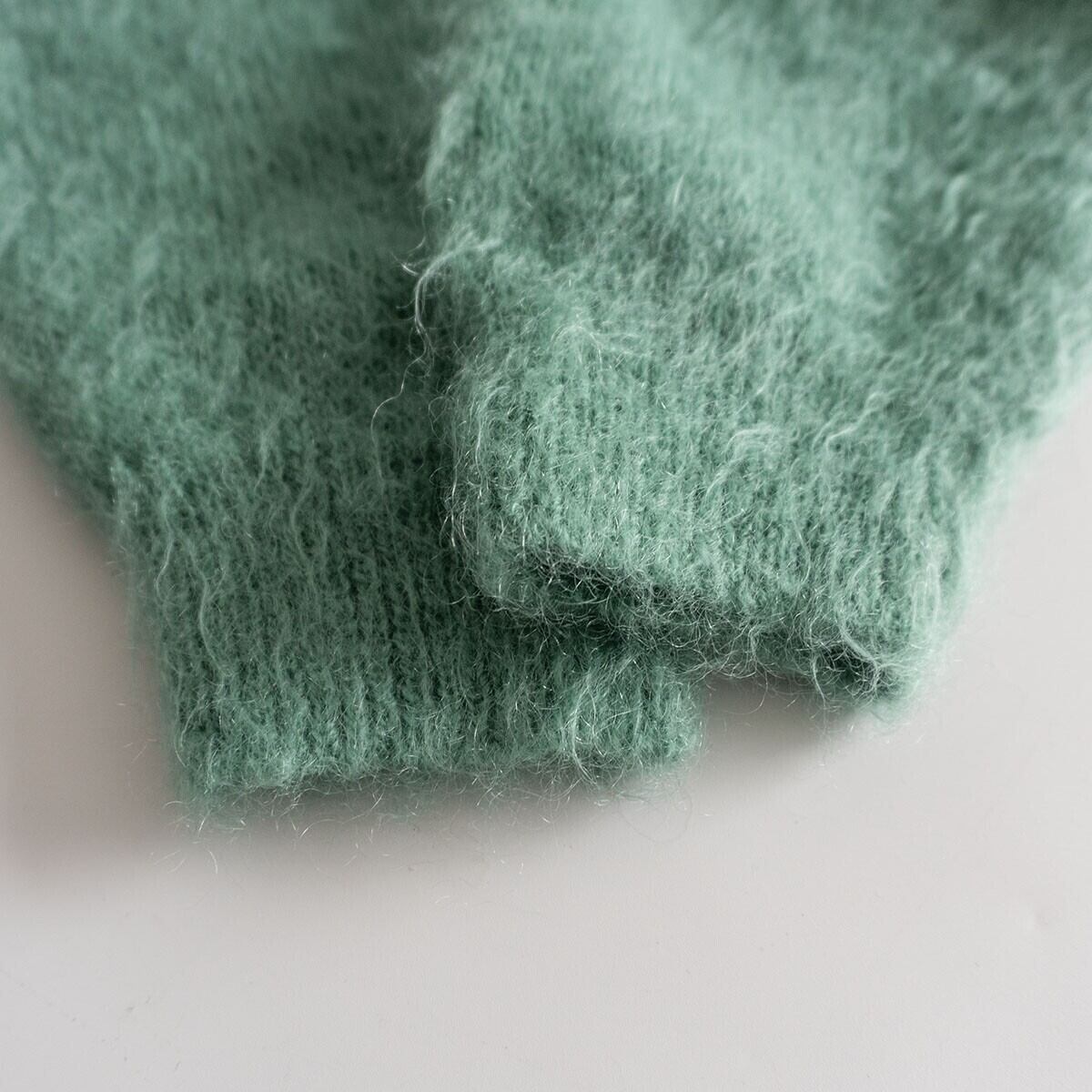 南アフリカ産の柔らかなスーパーキッドモヘヤを甘撚りに紡績した糸、芯糸にも天然繊維のウールを使用したニットです。軽くて肌触りが良く、モヘヤ特有の光沢感と毛足のさが特徴です。お探しの方や気になる方は是非。