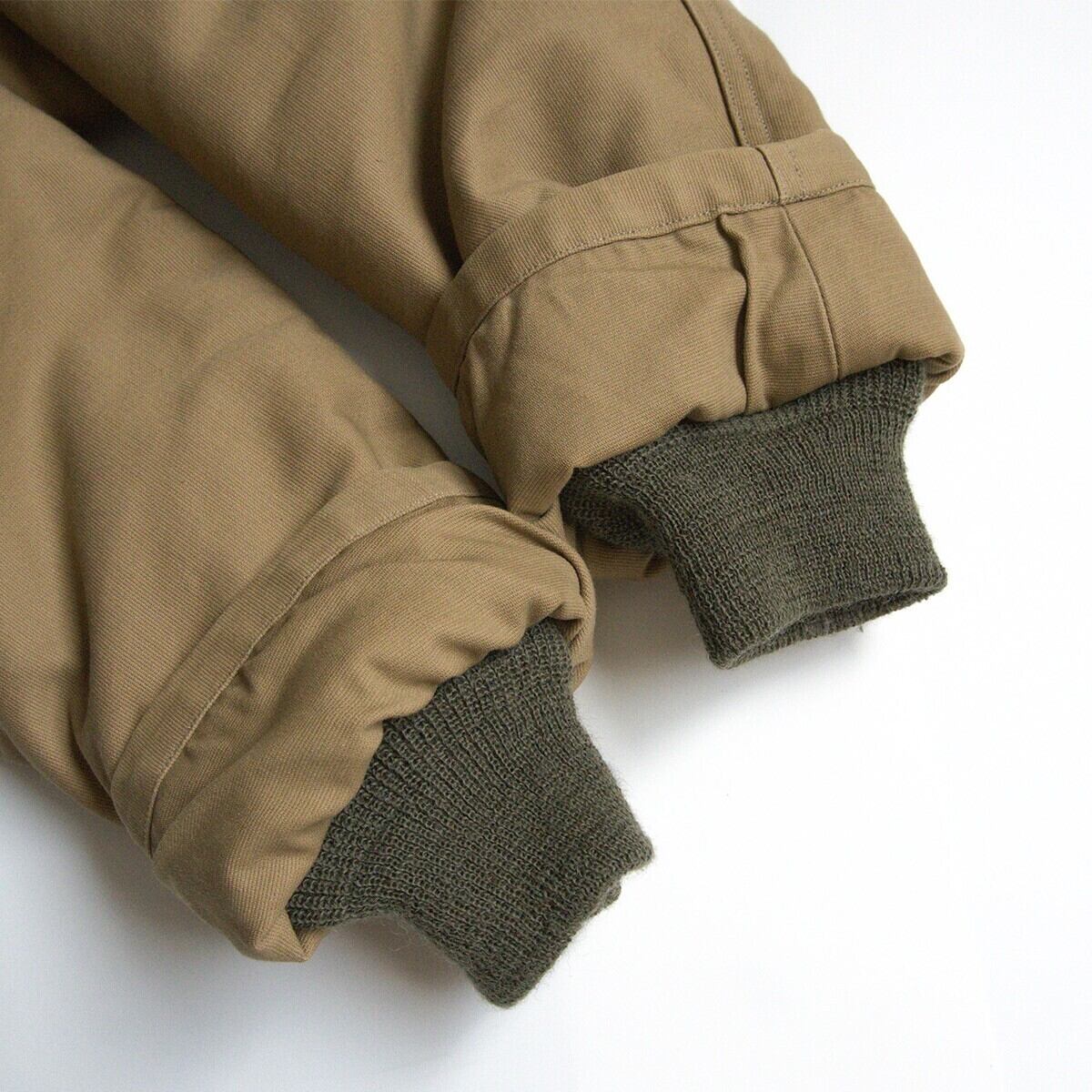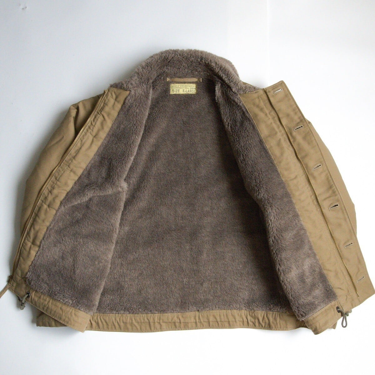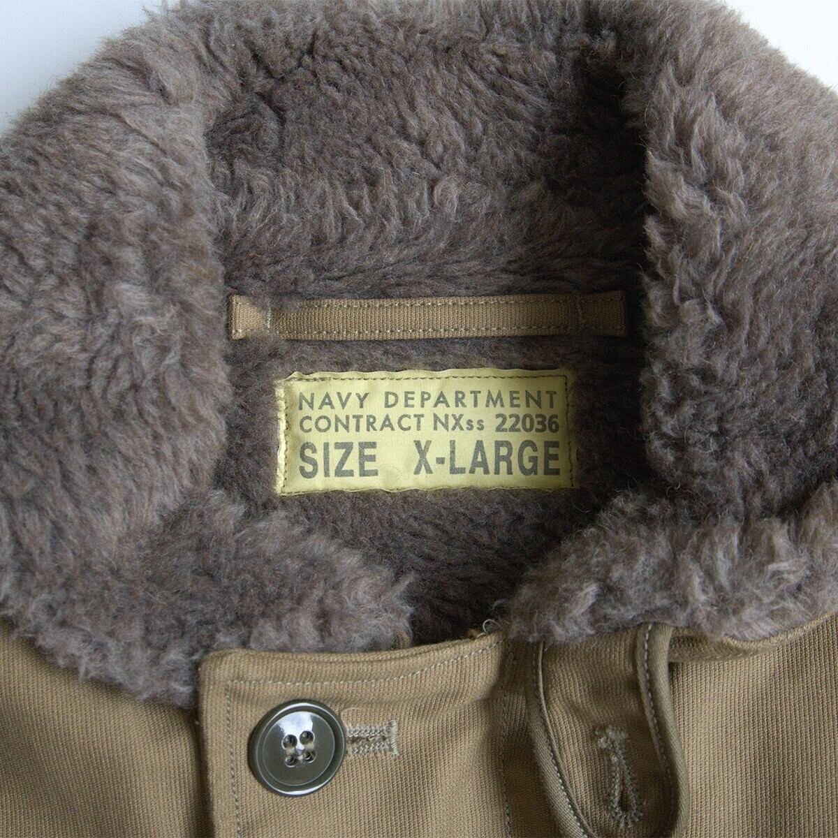 第二次世界大戦から朝鮮戦争にかけ米海軍の艦艇乗員用として採用されたN-1デッキジャケット。こちらの表素材には他のデッキジャケットと同様で通称"ジャングルクロス"と呼ばれるコットングログランが使用され、裏地には遮風性と保温性に優れたアルパカ・モヘア・ウールパイルが使用されています。防寒性抜群の1着です。
