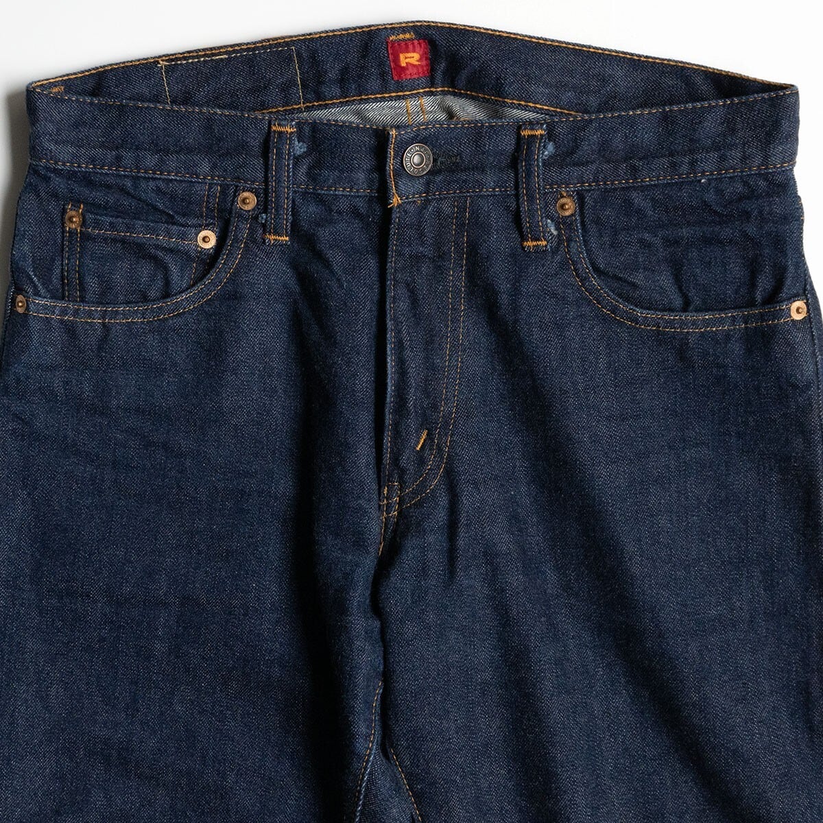 股上が浅く、膝から裾にかけてテーパードがかかっているストレート。これから経年変化をお楽しみいただけます。