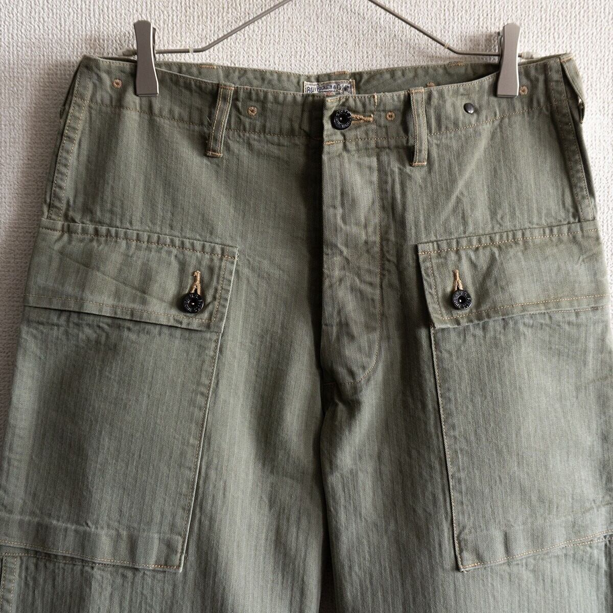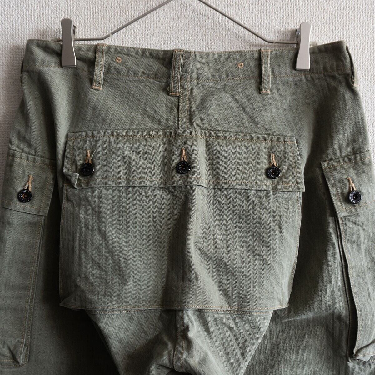 洗い加工されたがっちっりとしたヘリンボーンツイル素材のヒップポケット付き、カーゴパンツです。ヘリンボーンツイル・USMCパンツは海軍海兵隊の発足当初は艦艇上の警備などが主な任務でした。陸軍でも空軍でもないが、指揮下は海軍と言う特殊な軍隊のウエアーは一部独自なラインを創造しています。