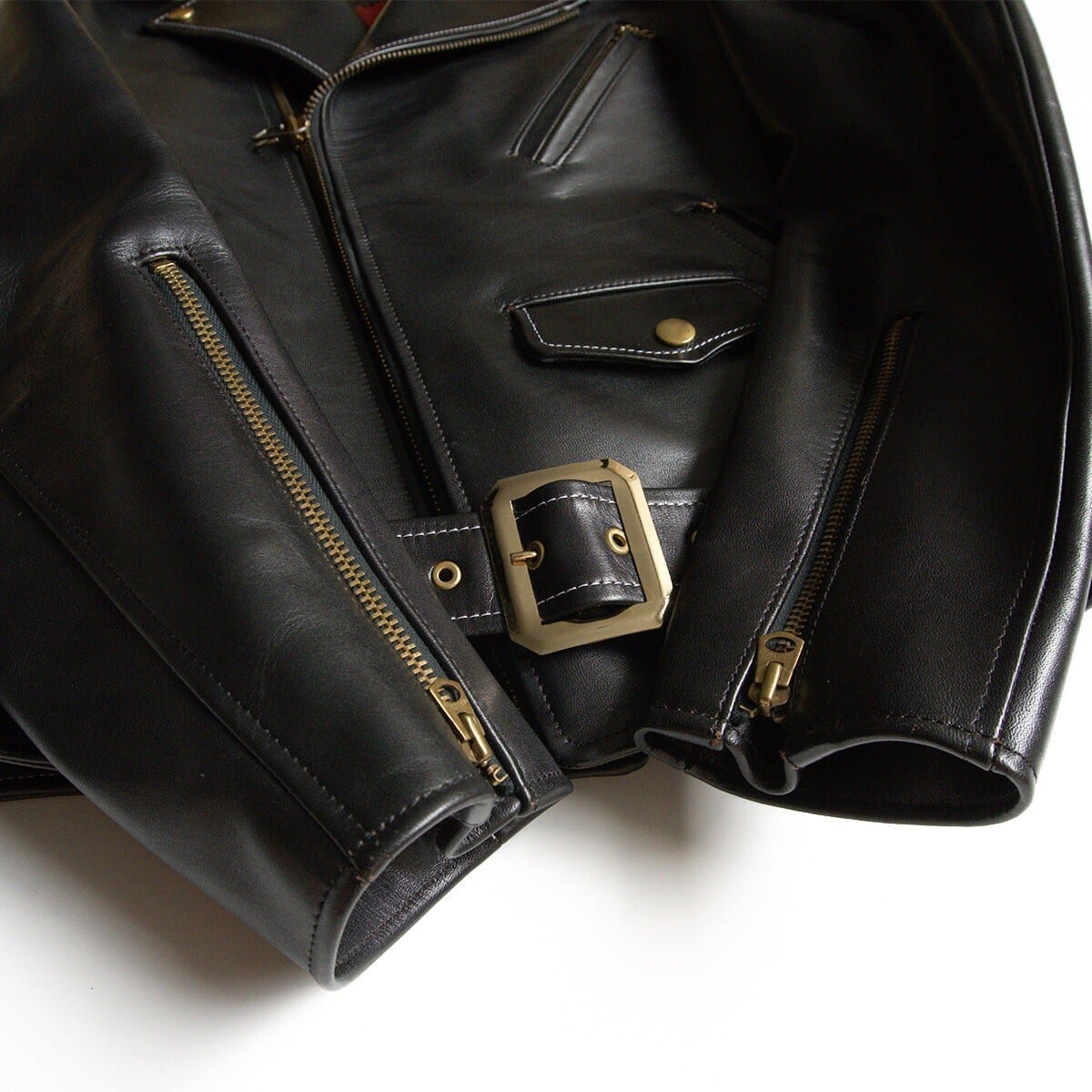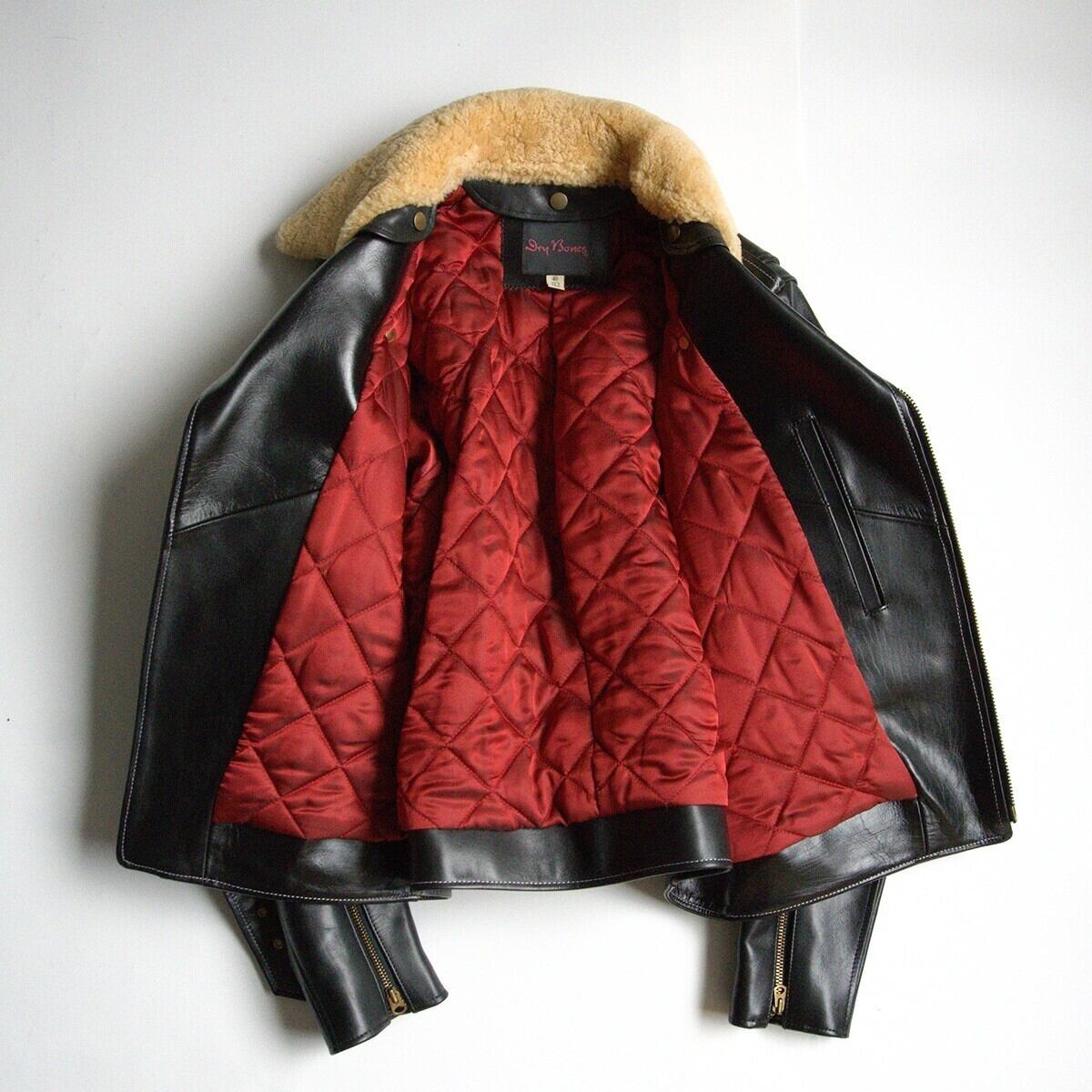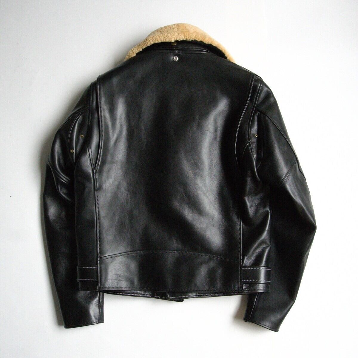 ホースハイドを使用したモーターサイクルジャケット。襟のボアは取り外しが可能です。お色はブラック。お探しの方や気になる方は是非。