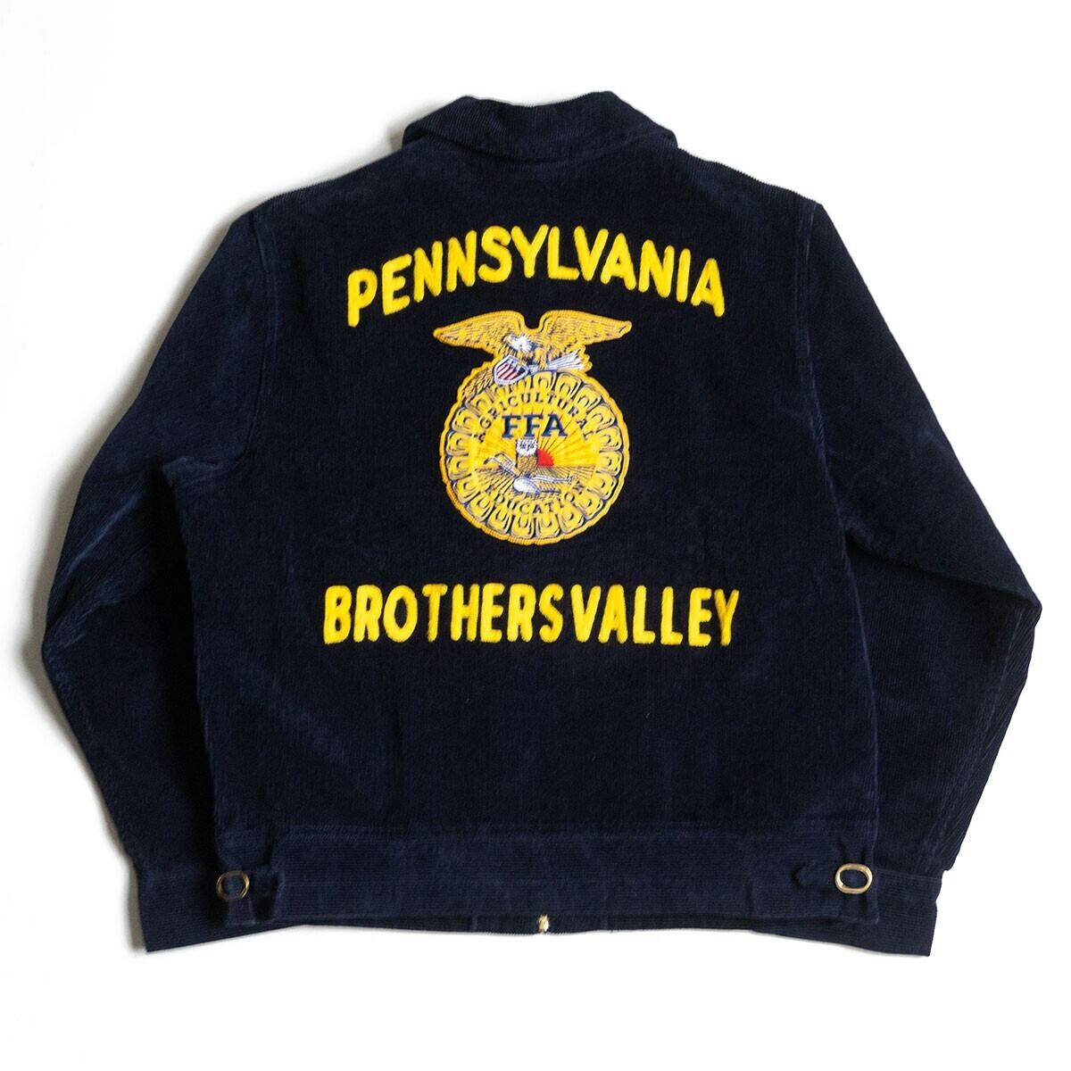 FFAとはFuture Farmars of Americaの頭文字をとった略称でアメリカ合衆国学校農業クラブ連盟のことを指します、『みんなでアメリカの農業の未来を考えていきましょう』という意味になります。その団体のユニフォームとして使用されていたのがこのFFAジャケットです。カラーは紺をベースに前後にはFFAのワッペン後ろにはワッペンの上に各州のチェーンステッチが入っています。お探しの方や気になる方は是非。