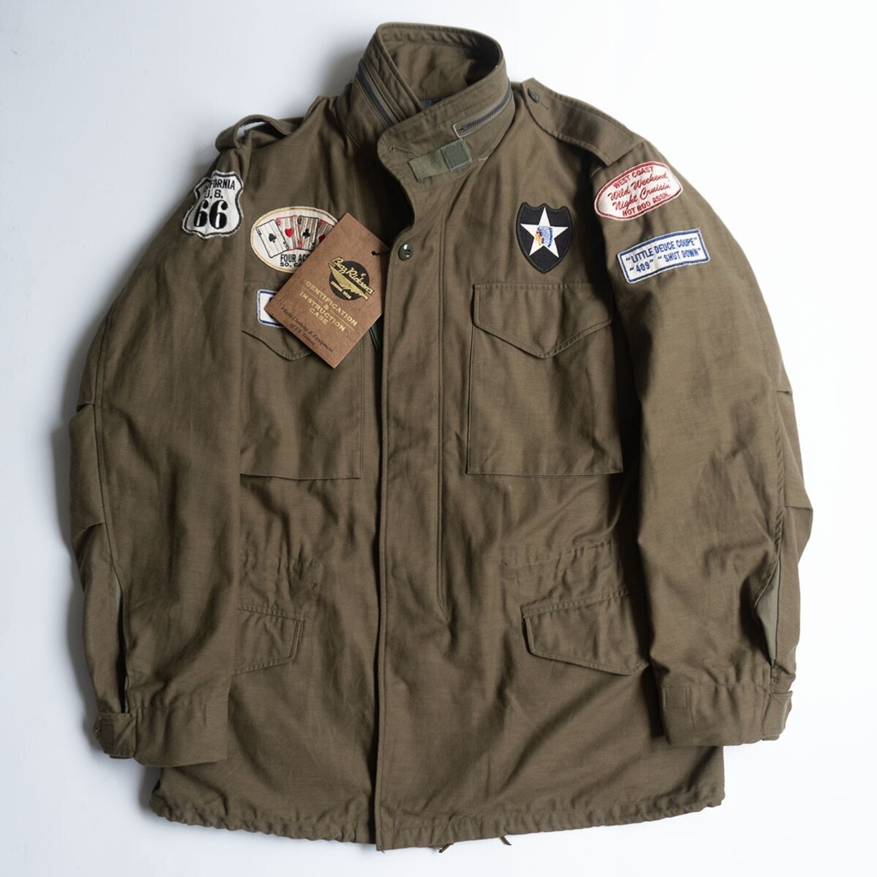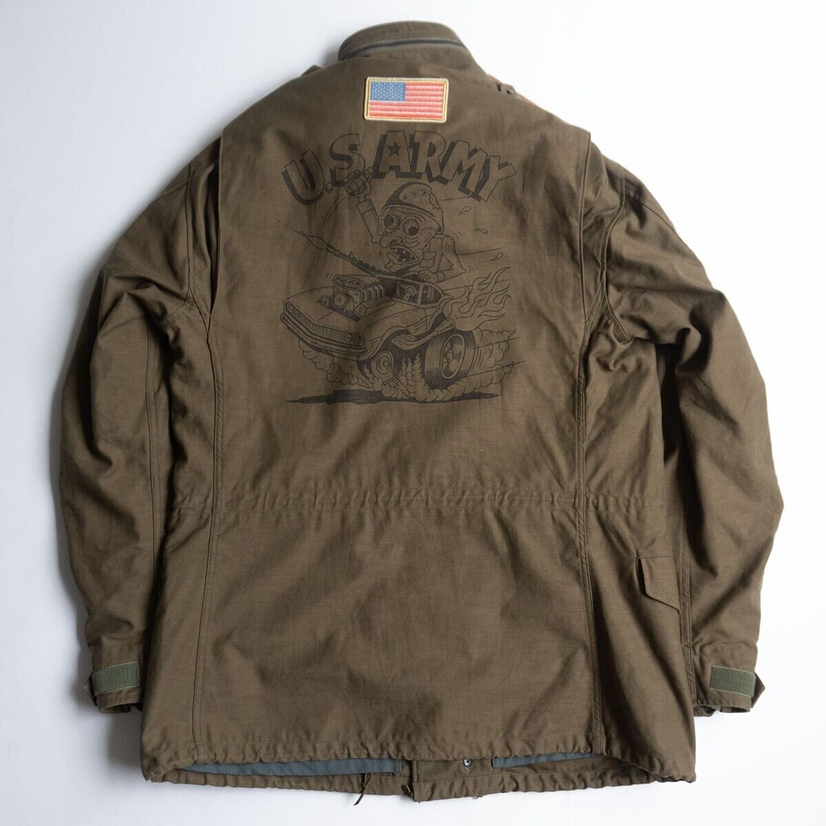 アメリカで空前の好景気を迎えていた1960年代、一人一台とも言える車社会に突入した。快適なカーライフは生活と心をも豊かにし、続々と登場する新車に心奪われた。1950年代後半に入ると全米各地に無数の「カークラブ」が次々に誕生し、街中を徘徊及びクルージングするようになった。このM-65はその流れを汲むジャケットで、過去に第2歩兵部隊に所属していた者が愛着のあるM-65を手放さず、退役後に自身のカーライフに関わる自慢のパッチを張り巡らせた常識を覆すようなカスタムジャケットである。背面にはマッスルカーで疾走する兵士がフリーハンドで描かれており、自由の国アメリカを象徴するようなユーモア溢れる一着である。お探しの方や気になる方は是非。
