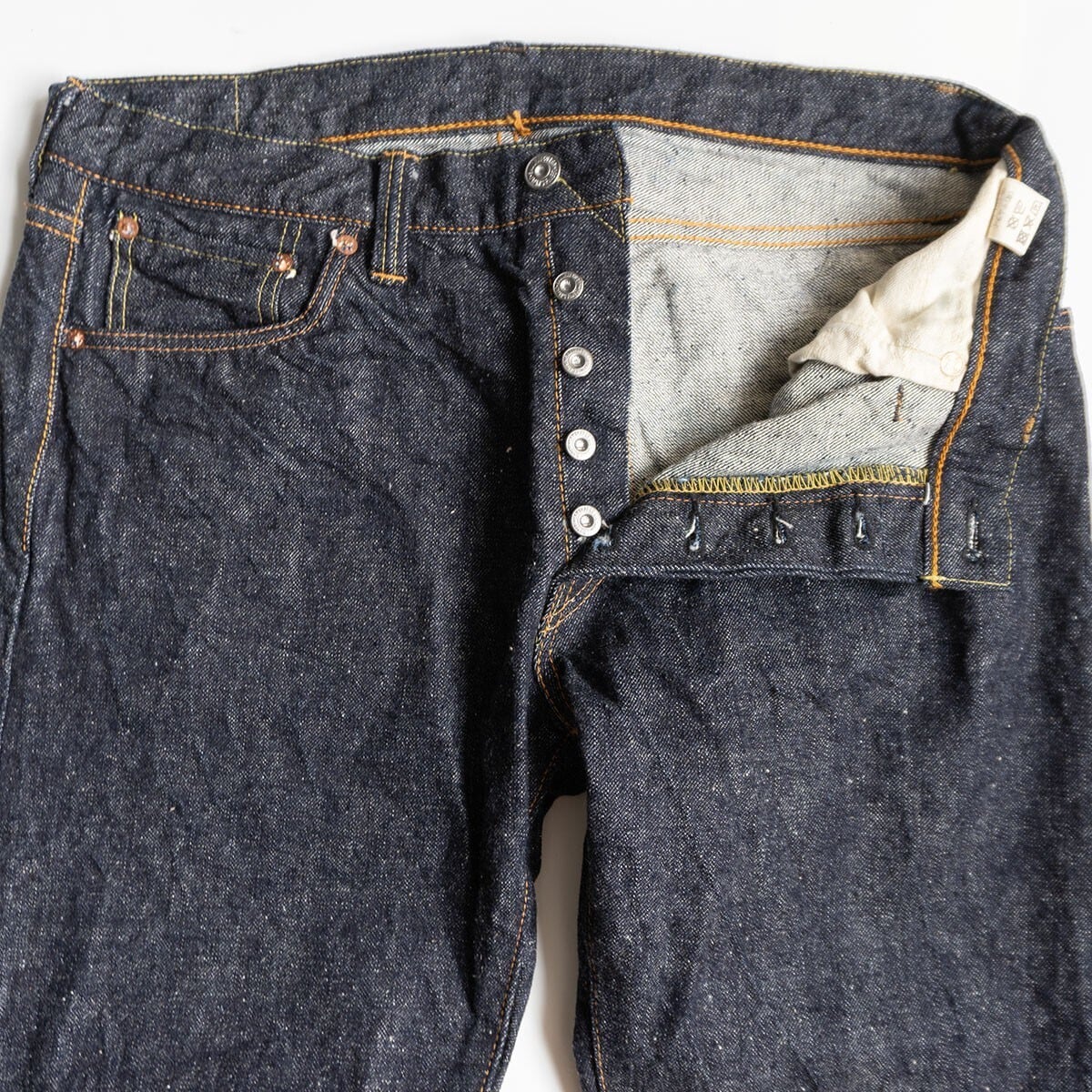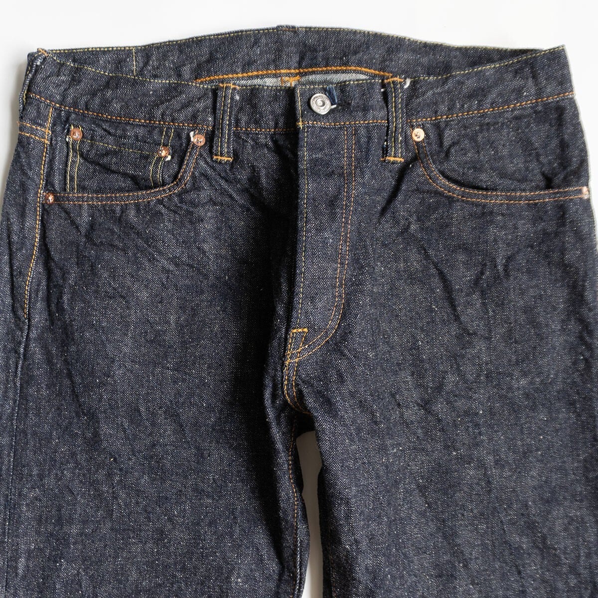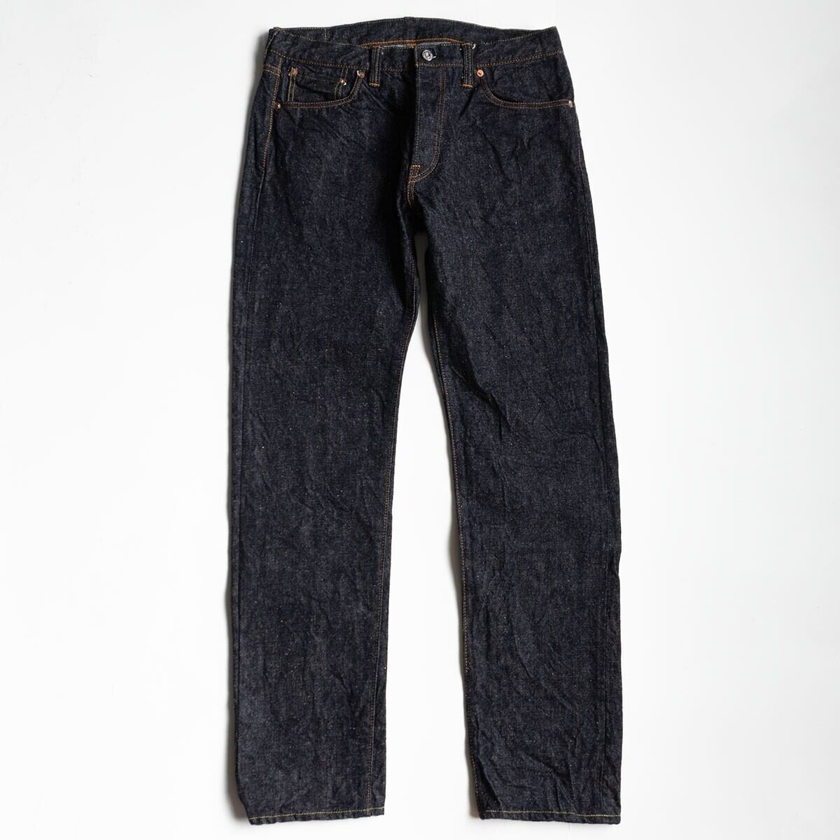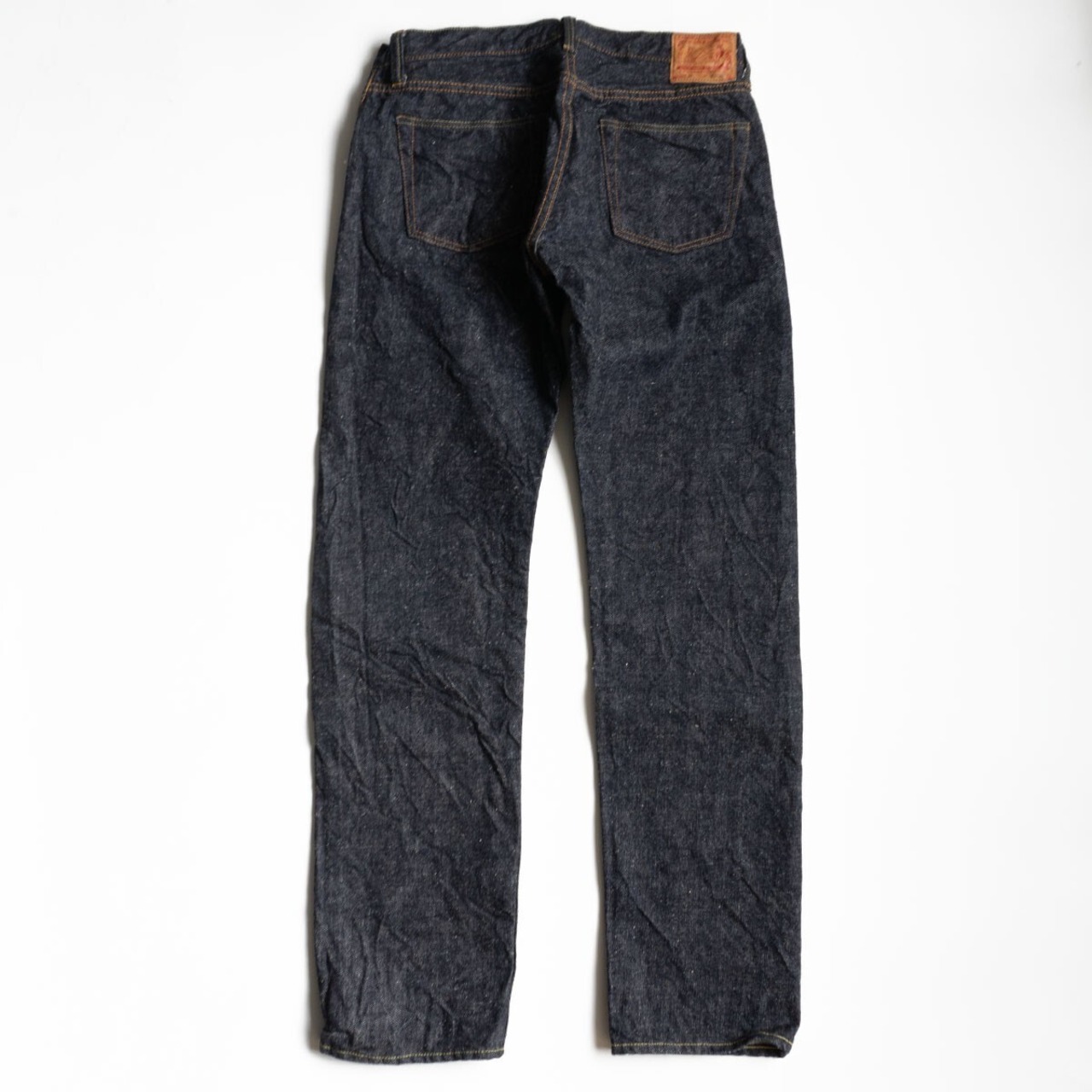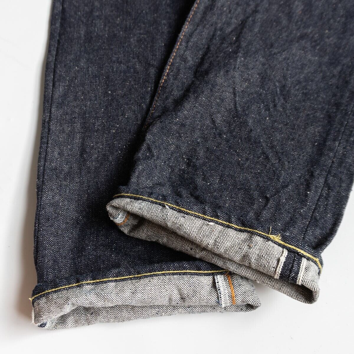 男気15ozデニムによるスリムテーパードモデルです。細身ですが股上は浅くなく、ワタリから裾にかけてテーパードを強くかけており、短めの丈でも綺麗に穿けるシルエットです。これから経年変化をお楽しみいただけます。