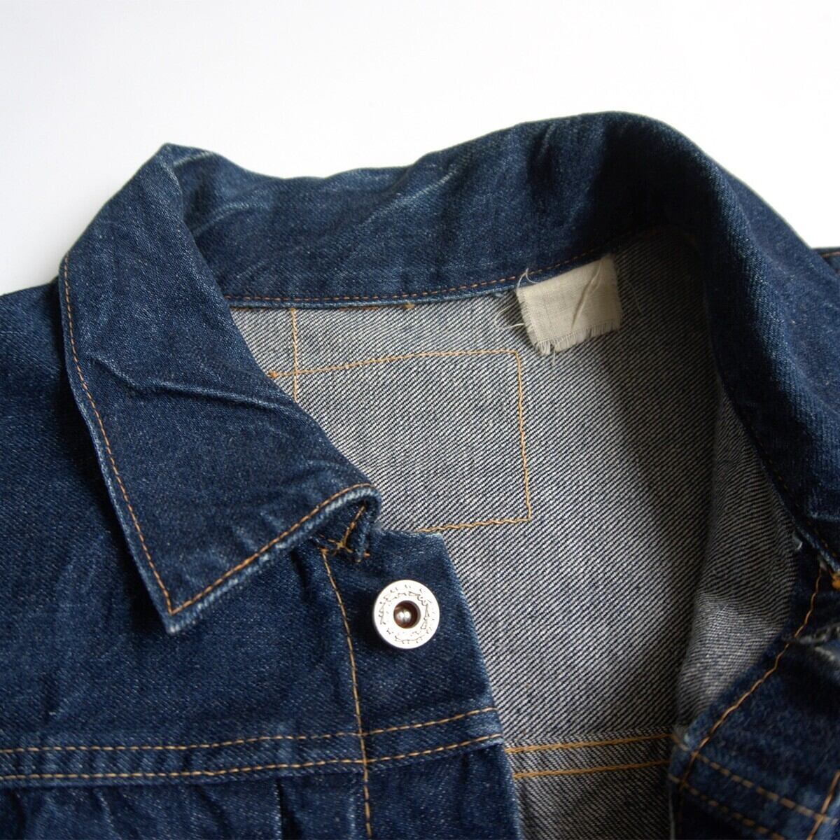 リーバイスの1stジャケットの506xxをベースに作成した人気モデル。フラップ無しポケット、月桂樹ボタン、針刺しシンチバックなど、細部のディテールもしっかり再現されており、色落ち、アタリ、ステッチのほつれ具合などリアルに着込まれたようなヴィンテージのような雰囲気が抜群。良いものをお探しの方は是非。
