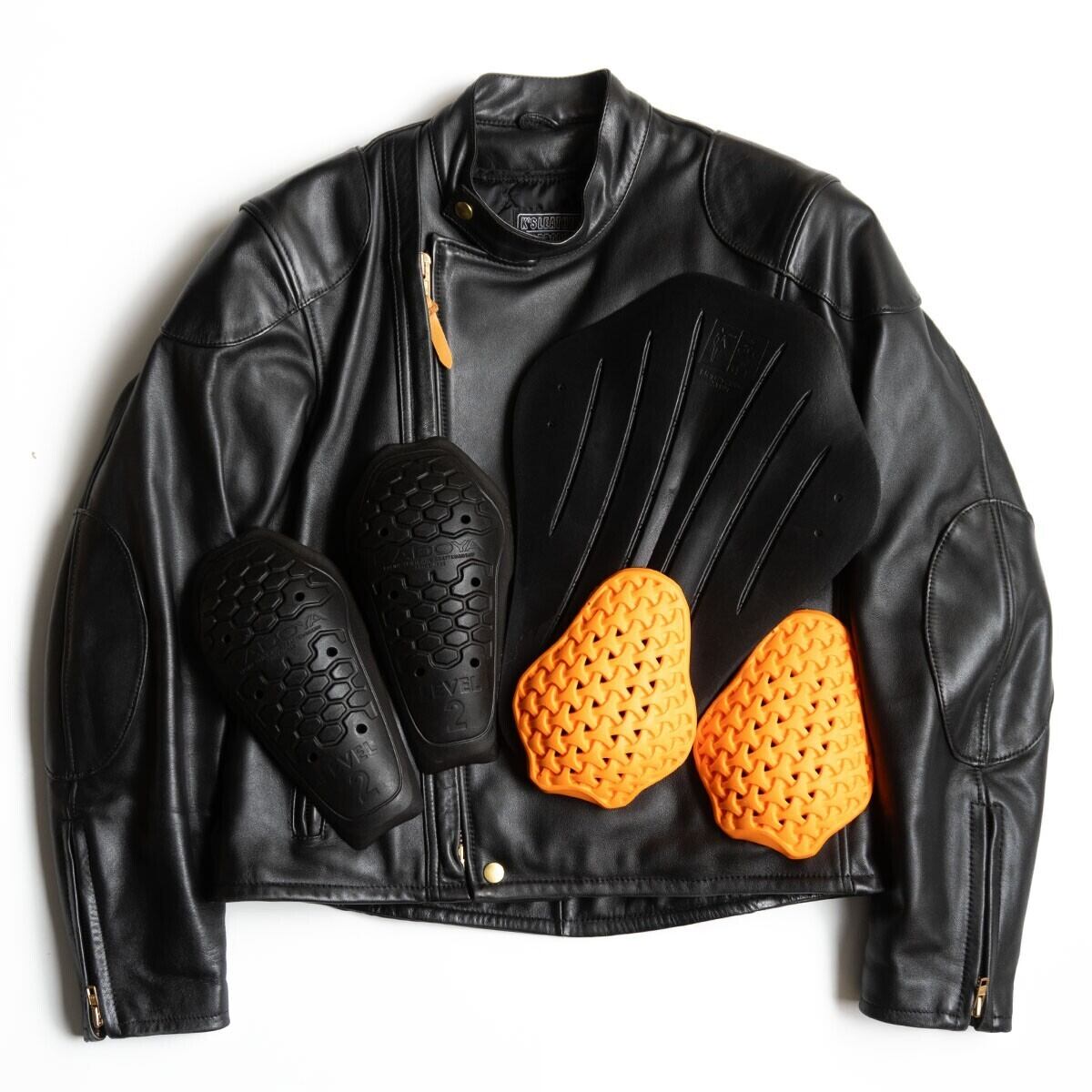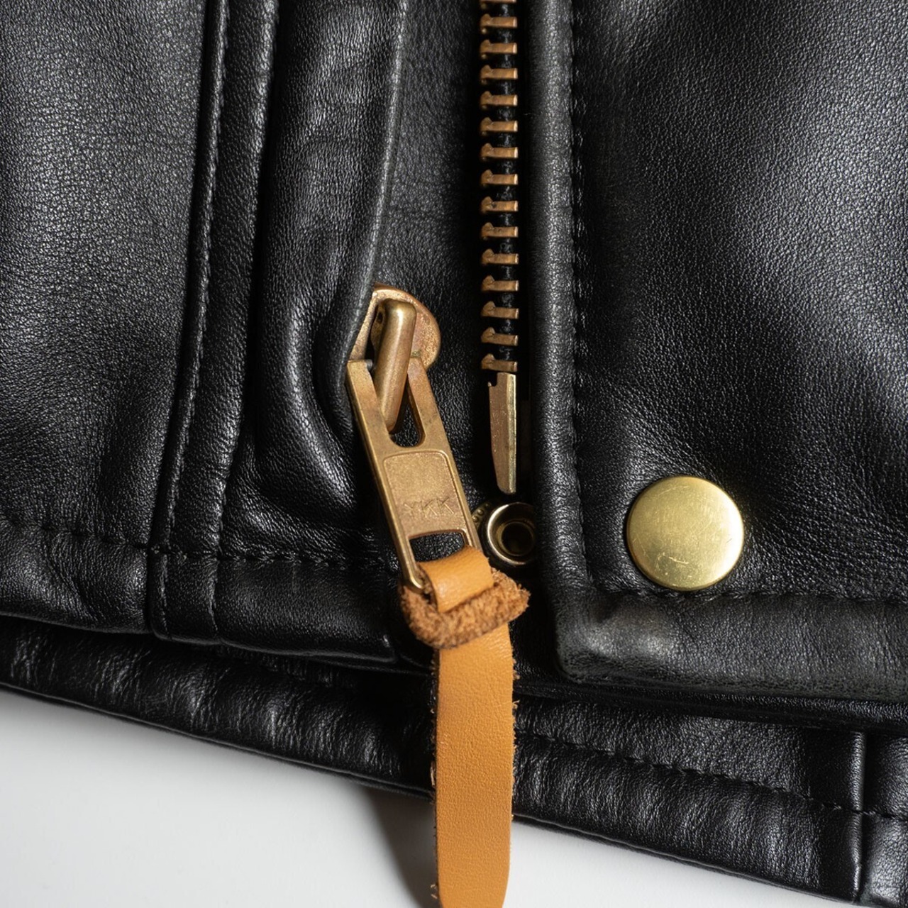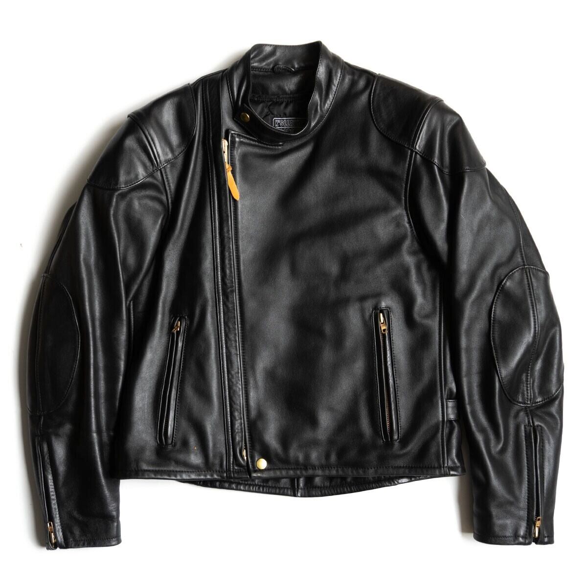 肉厚な牛革を使用したライダースジャケット。武骨なデザイン、お色はブラックです。背面、肘、肩にそれぞれパッドが付属しています。お探しの方や気になる方は是非。