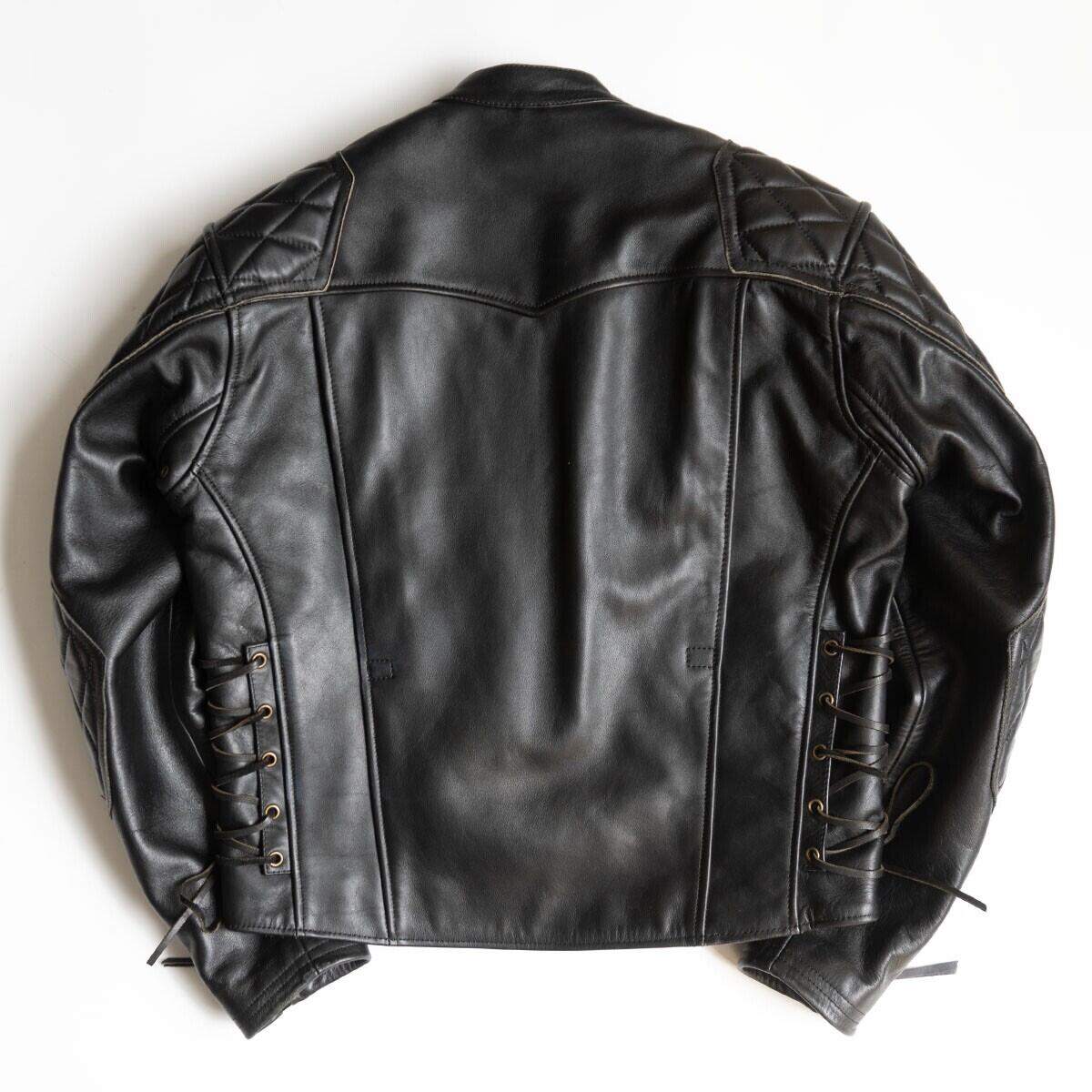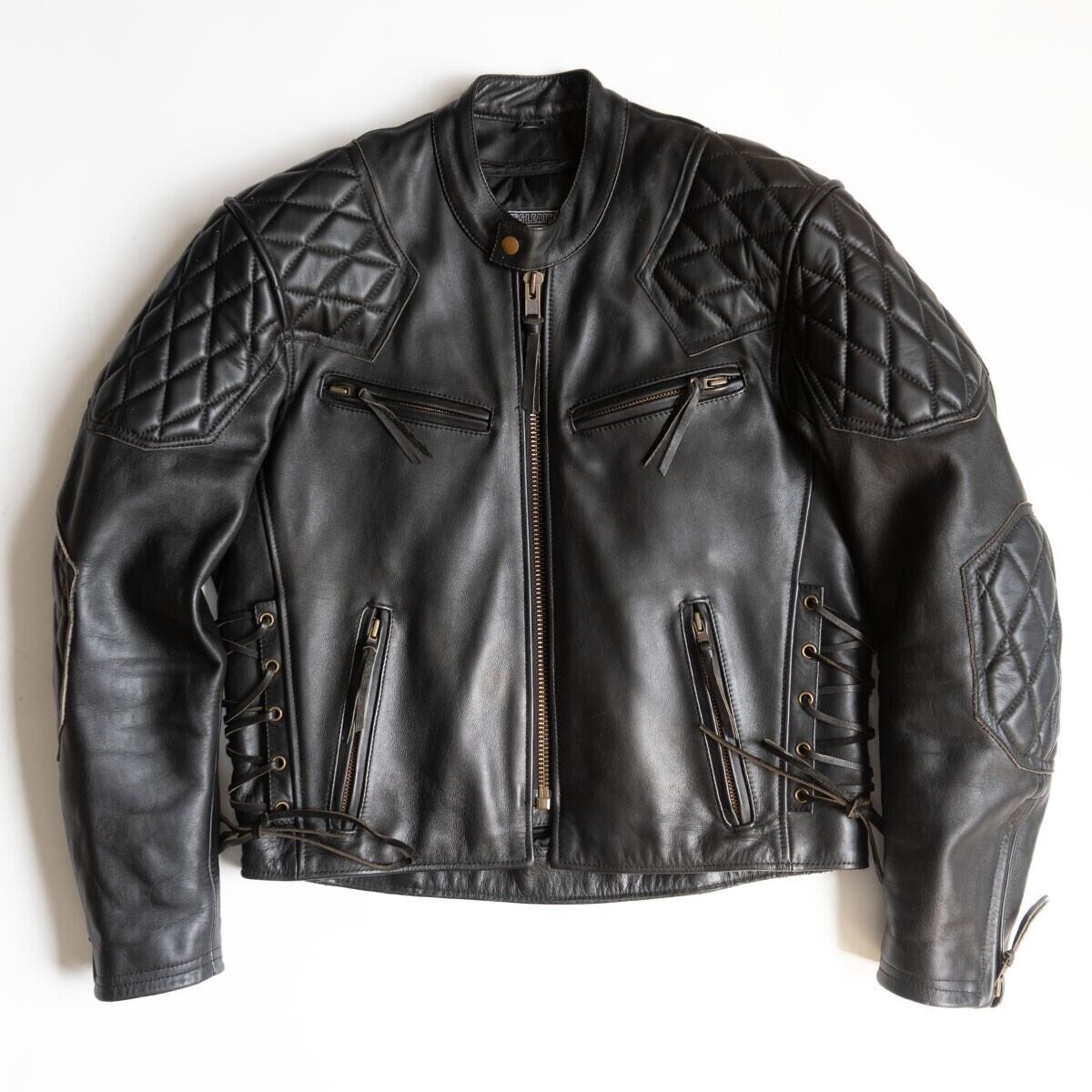 肉厚な牛革を使用したライダースジャケット。武骨なデザイン、お色はブラックです。