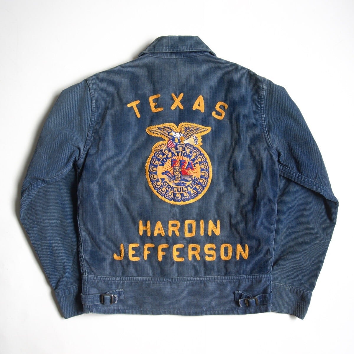 FFAとはFuture Farmars of Americaの頭文字をとった略称でアメリカ合衆国学校農業クラブ連盟のことを指します、『みんなでアメリカの農業の未来を考えていきましょう』という意味になります。その団体のユニフォームとして使用されていたのがこのFFAジャケットです。カラーは紺をベースに前後にはFFAのワッペン後ろにはワッペンの上に各州のチェーンステッチが入っています。