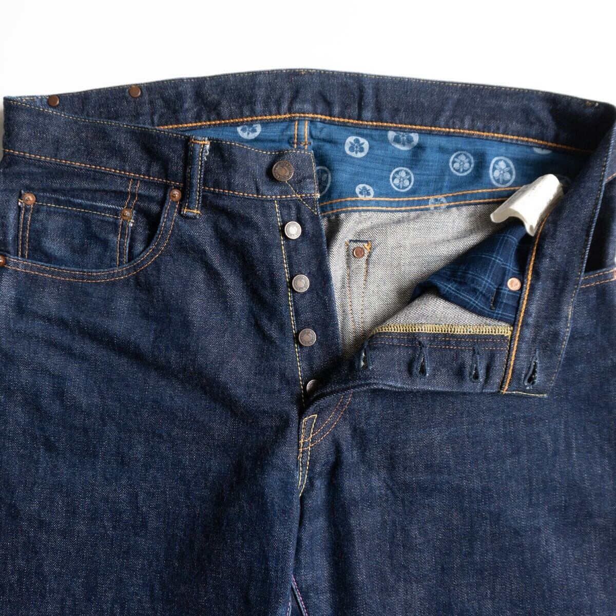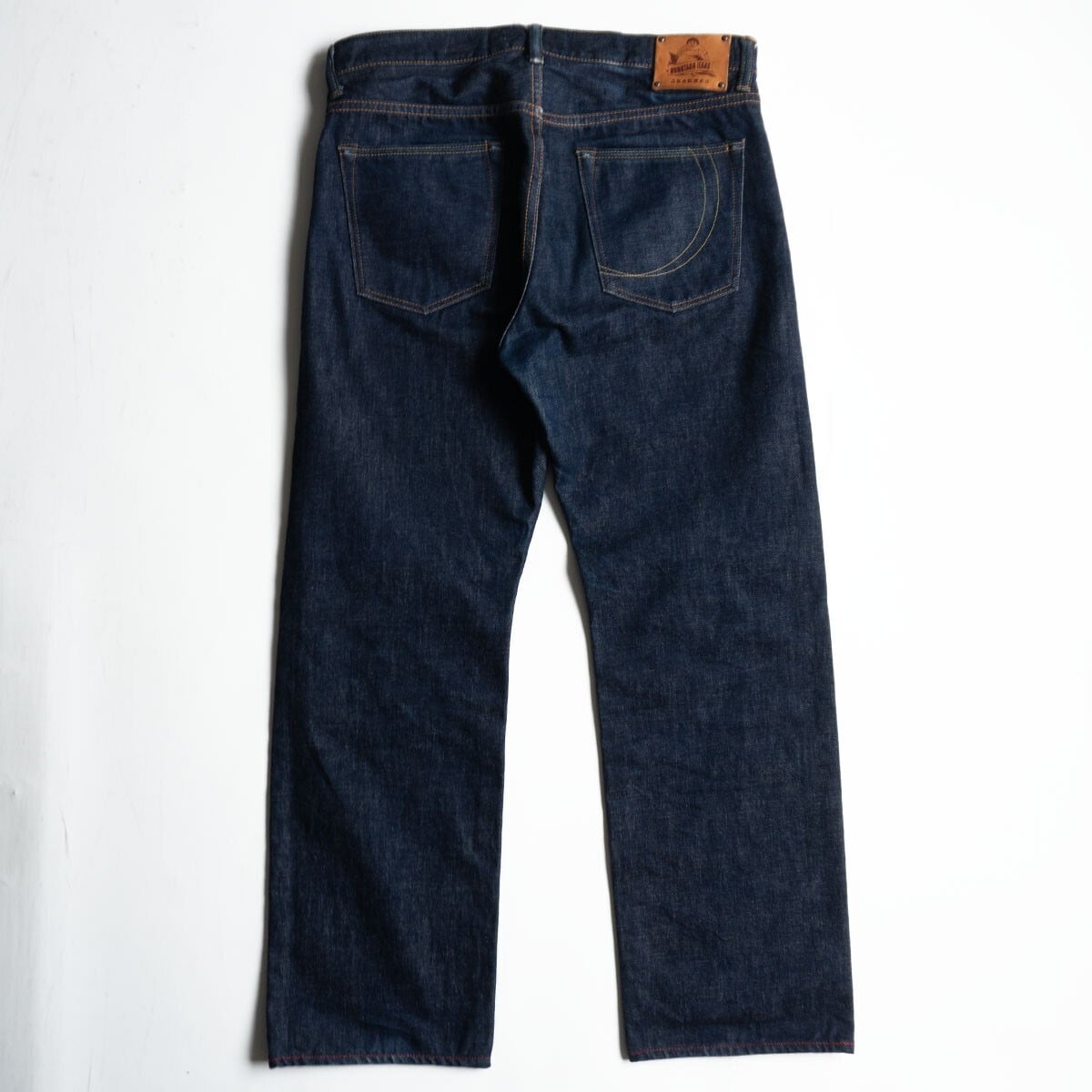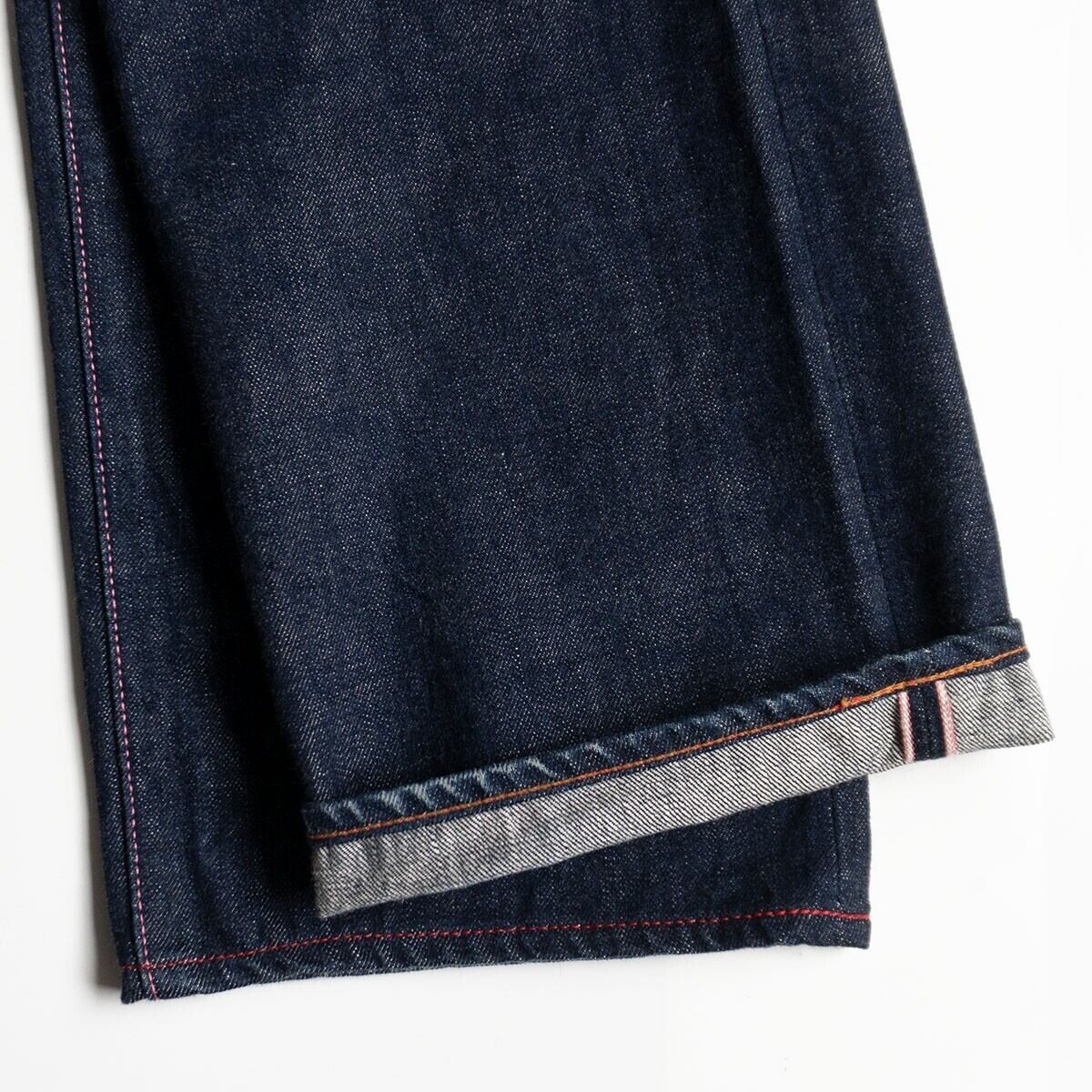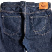 ロープ染色を繰り返し特濃インディゴブルーに染めたジンバブエコットン使用した1本。股上が深く、太目でテーパードの入ったクラシックタイプのストレートシルエットです。これから経年変化をお楽しみいただけます。