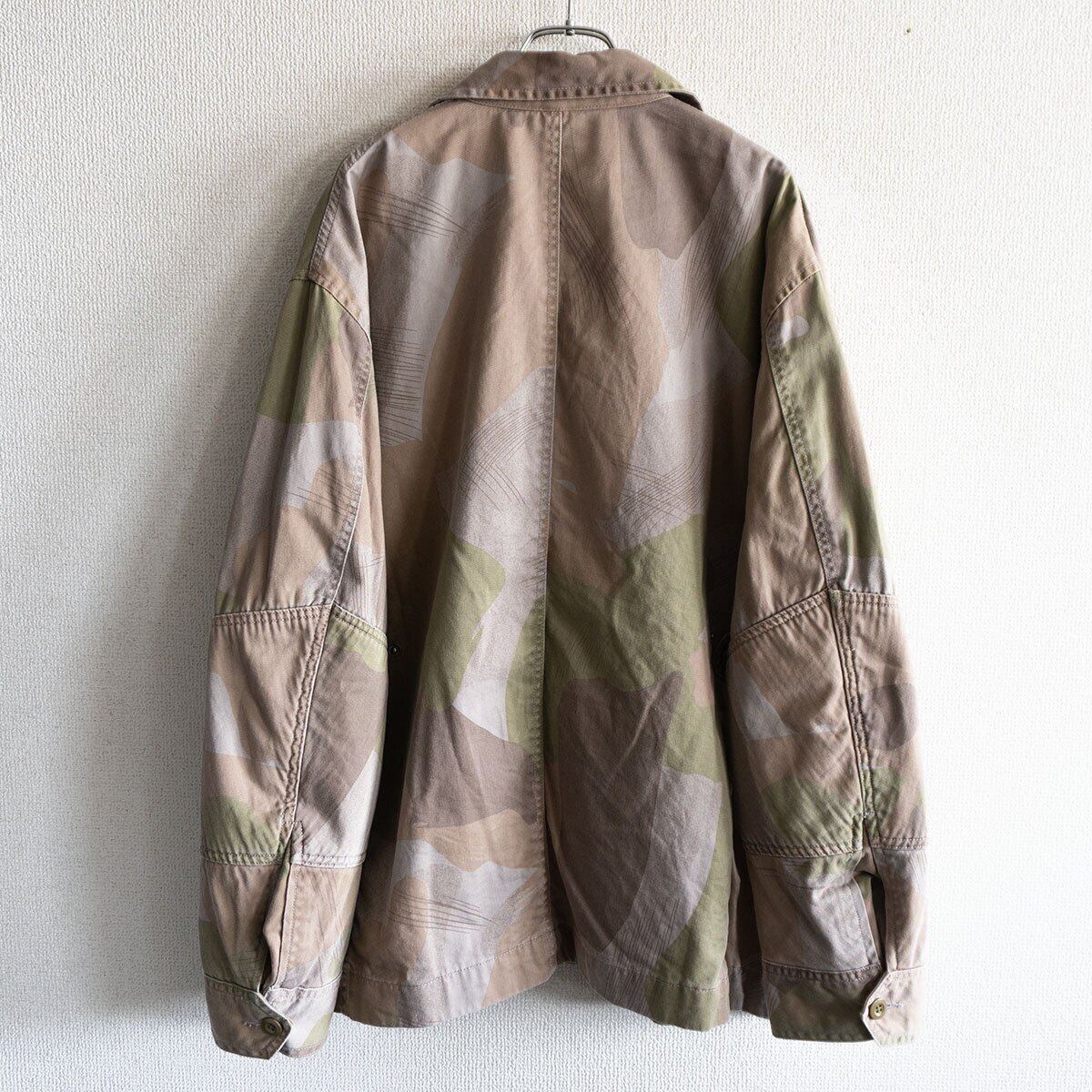 第二次大戦時の英国のコンバットジャケットのフルラインバージョンで、かつてのレーサーが着用していたジャケットから傾斜のついた2つのベローポケットを取り入れて作製されています。腕の可動域を確保する機能的で立体感のある腕付けが特徴的で、ウエストには調整可能なスナップボタン仕様になっています。またフロントジップは2WAYダブルジップで特徴的なTALON製LYBRO刻印ジップを採用。そして肘に配された補強の為のパイピングもコーディネートのアクセントとなります。ブラシで描いたようなカモフラージュ”ブラッシュストロークカモ”は、第二次大戦時の英国の空挺兵が着用していたデニソンスモックに見られる柄で、その柄を洗いをかけ、柔らかくした10オンスのコットンツイルを採用。着用を重ね日焼けや洗いにより、地の素材である赤身のあるブラウンが出てくるのも特徴の一つでエイジングもお楽しみいただけます。 良い物をお探しの方は是非。