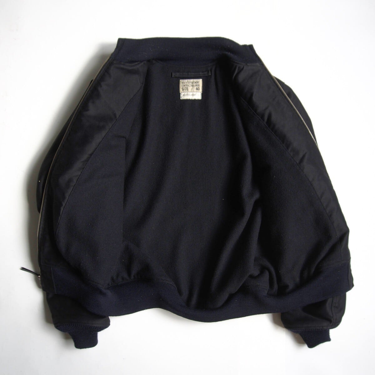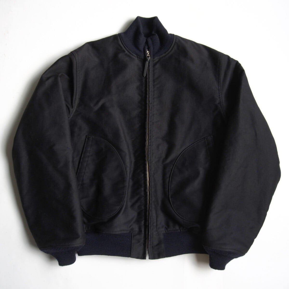 高密度で織り上げられた通称“ジャングルクロス”は、洋上で冷風に晒されるデッキクルー達の身体を守った。初期型のデッキジャケットにはフロント開閉パーツとしてファスナーが採用されていたが、海水の塩分によって錆が生じやすく、後期型はフックタイプに変更された。裏地には26オンスのウールブランケットが付き適度な保温性を確保する。お探しの方や気になる方は是非。