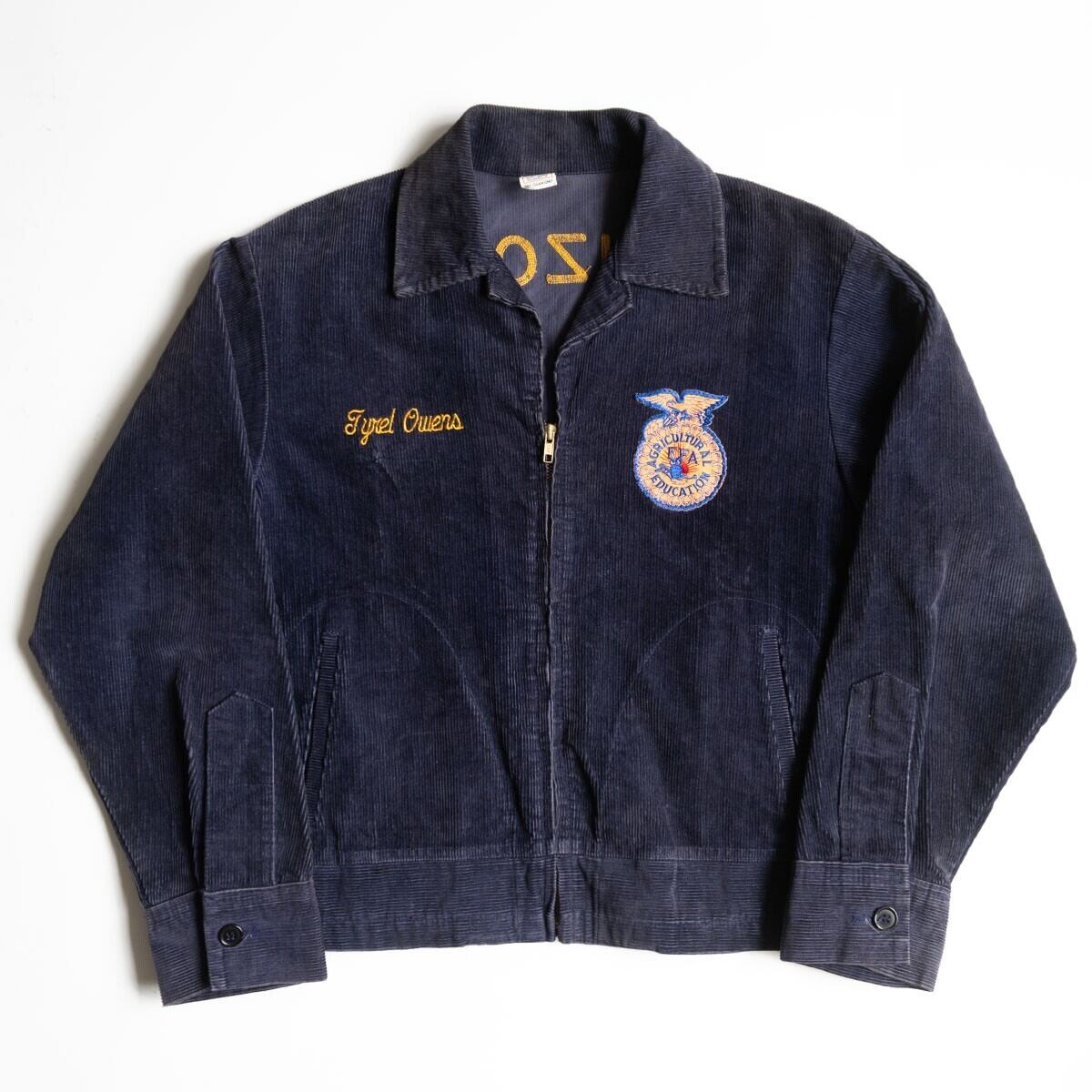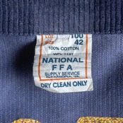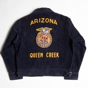 FFAとはFuture Farmars of Americaの頭文字をとった略称でアメリカ合衆国学校農業クラブ連盟のことを指します、『みんなでアメリカの農業の未来を考えていきましょう』という意味になります。その団体のユニフォームとして使用されていたのがこのFFAジャケットです。カラーは紺をベースに前後にはFFAのワッペン後ろにはワッペンの上に各州のチェーンステッチが入っています。