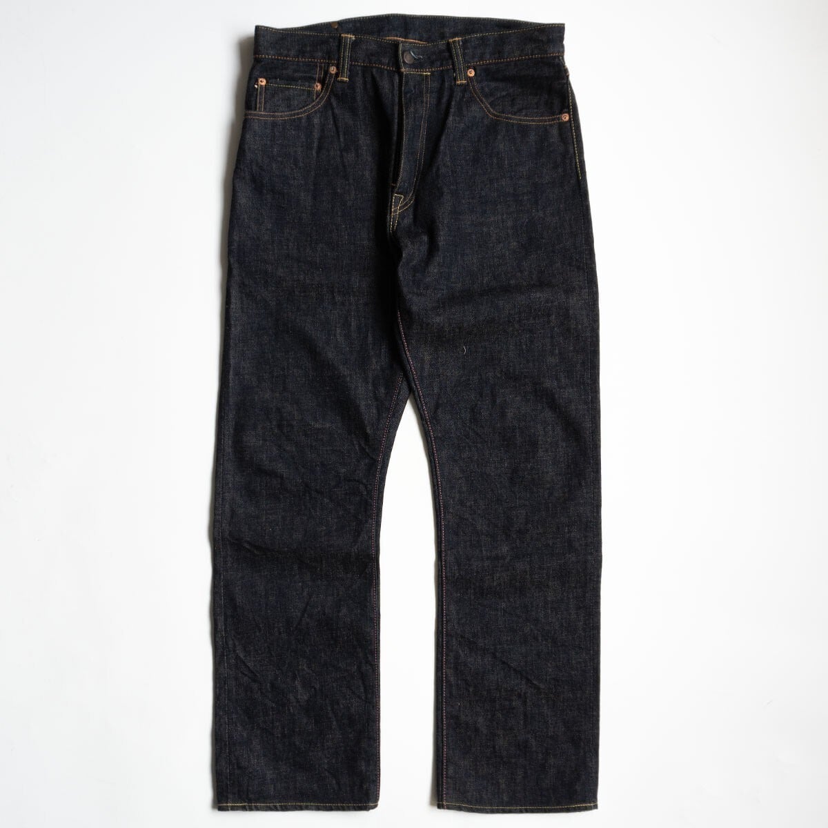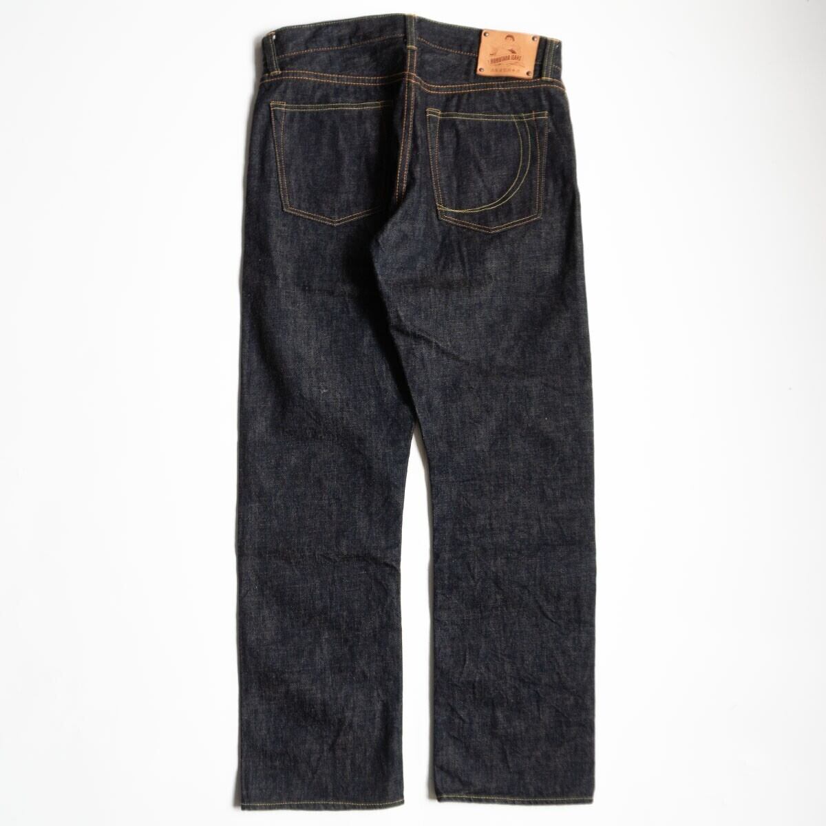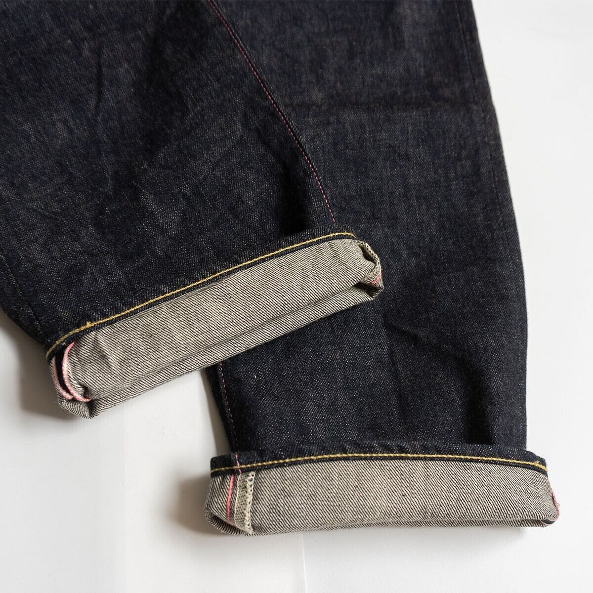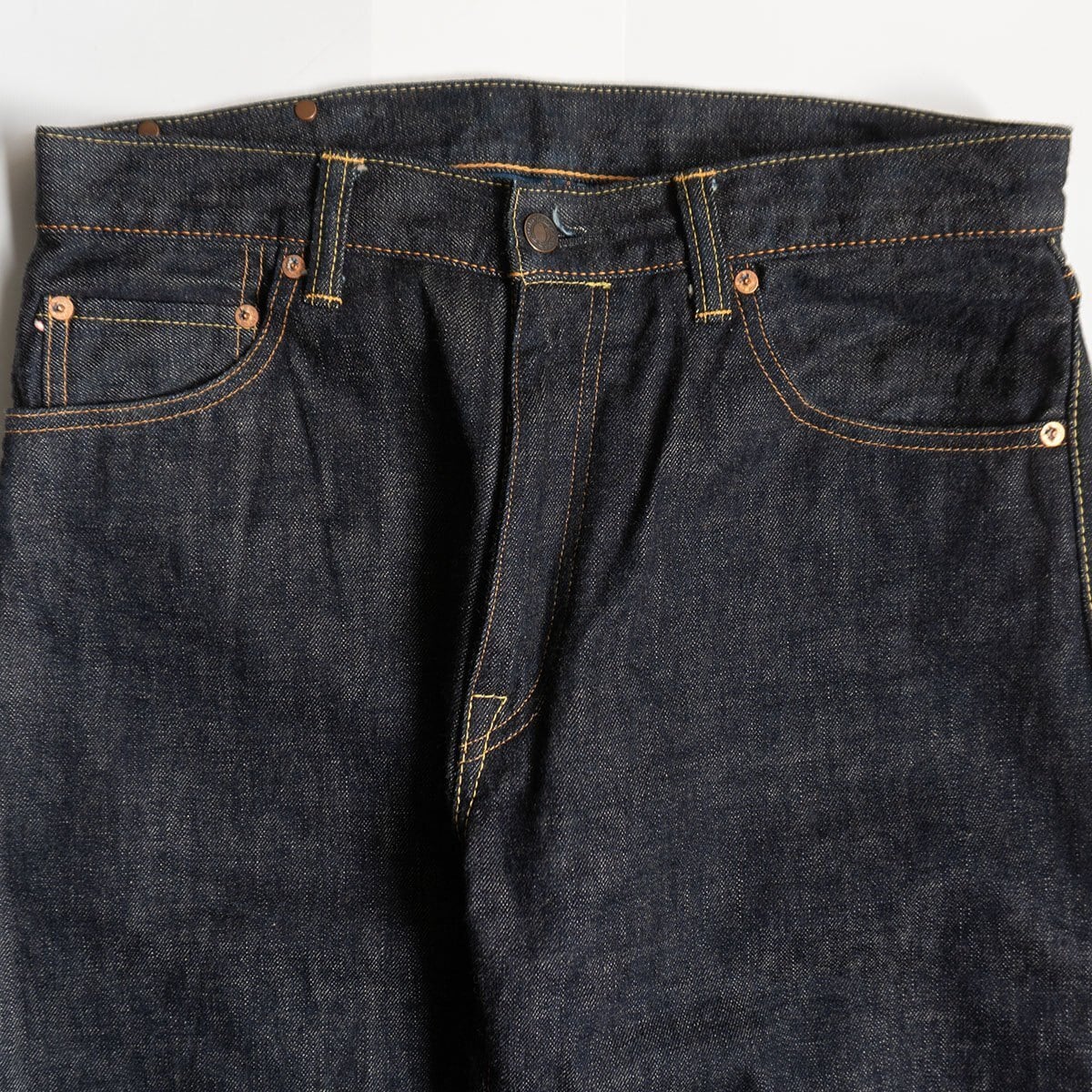 ロープ染色を繰り返し特濃インディゴブルーに染めたジンバブエコットン使用した1本。股上が深く、もも周りはゆったり目で膝下から強くテーパードをかけたストレートシルエットです。これから経年変化をお楽しみいただけます。