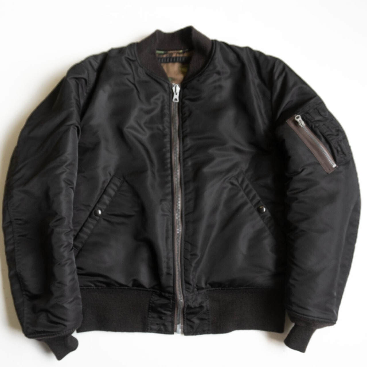 歴史上には存在しない「BLACKフライトジャケット」で人気のウィリアムギブソンシリーズ。そのきっかけとなったのがBLACK MA-1。小説家であるウィリアム・ギブソン氏の最新作「パターン・レコグニション」に登場し注目を浴びる。ボディーは通常のMA-1では無いブラックのヘビーナイロン素材をベースに、シルエットもスレンダーとなっている。織りネームも「パターンレコグニッション」の内容に沿って特別に刺繍されたもの。サイズ表記はS、M、Lではなく36、38、40といったインチで表記されている。さらに着丈を表すREGULARとLONGのサイズ分類まである。今回のMA-1 Dタイプ、表面はブラックボディで裏面は迷彩柄とリバーシブルで着ることが出来ます。官給品ではレスキューオレンジを採用していましたが、ウィリアムギブソンコレクションではまた一味違った仕上がりに。お探しの方や気になる方は是非。