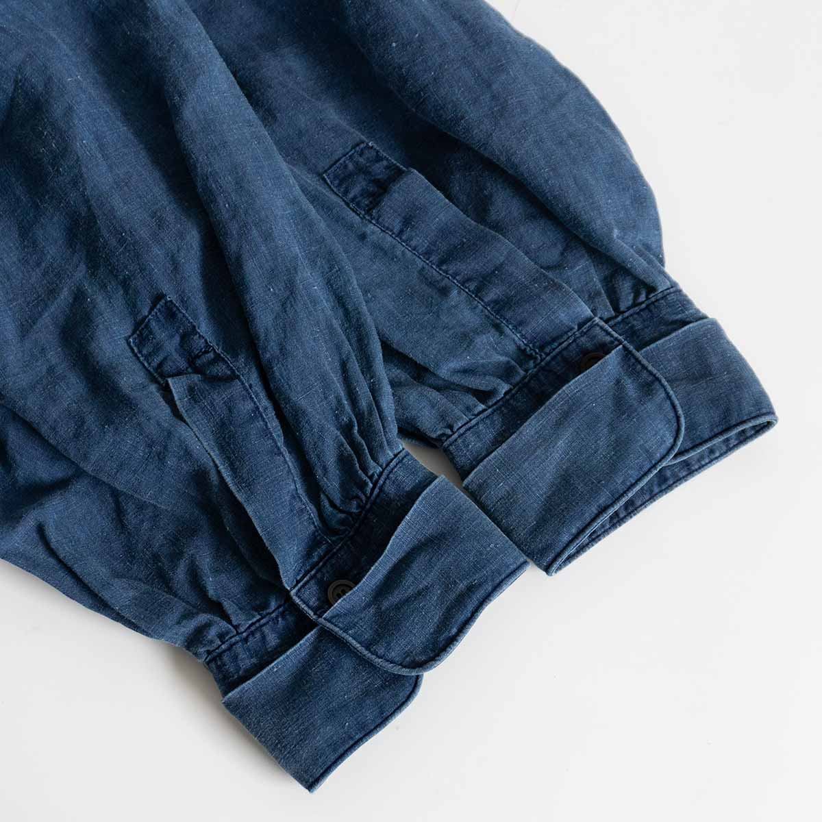 カタチは40.50年代ホテルのドアマンが着ていた制服がモチーフ。立ち上がったスタンドカラーのような襟のカタチがアクセントに。そして袖口にはギャザーを程こし絶妙な膨らみを作ってくれています。リネン特有の素材感で柔らかくしなやか。落ち感がありなんともエレガントに着ていただけます。