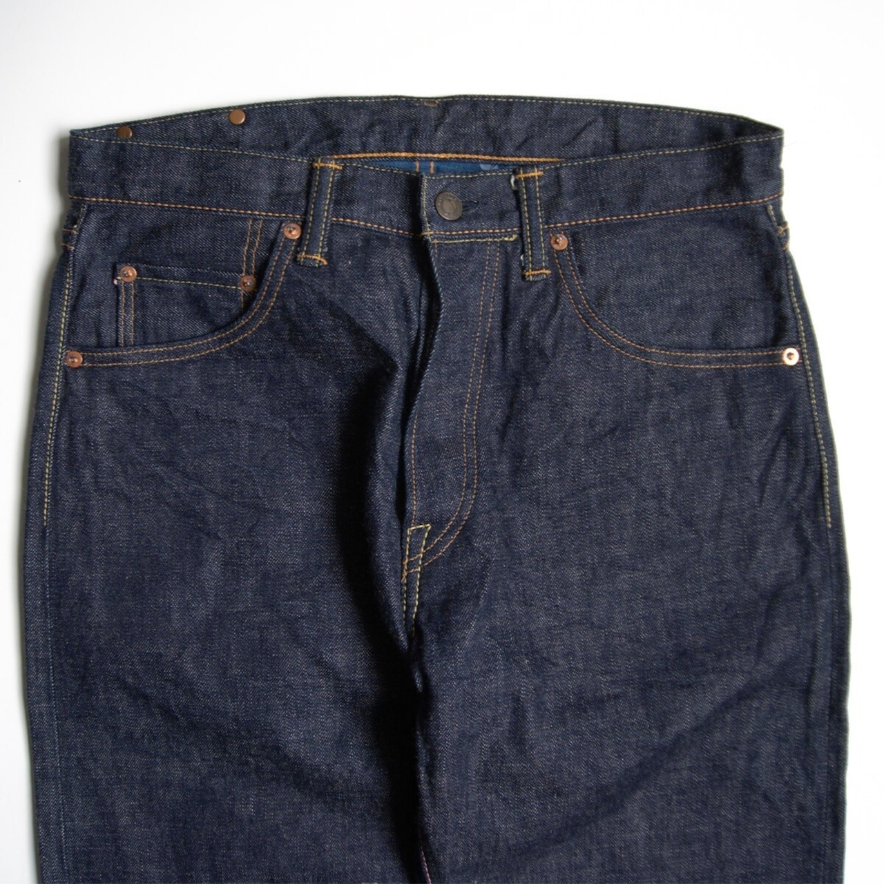 ロープ染色を繰り返し特濃インディゴブルーに染めたジンバブエコットン使用した1本。股上が深く、もも周りはゆったり目で膝下から強くテーパードをかけたストレートシルエットです。これから経年変化をお楽しみいただけます。