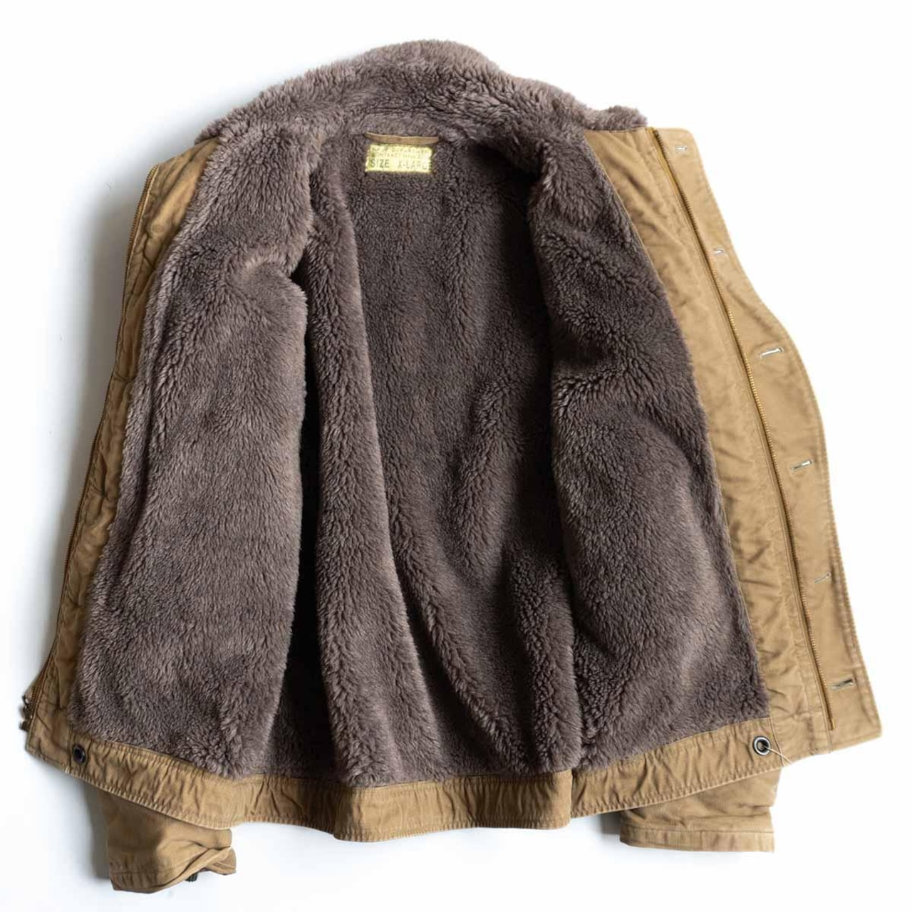 第二次世界大戦から朝鮮戦争にかけ米海軍の艦艇乗員用として採用されたN-1デッキジャケット。こちらの表素材には他のデッキジャケットと同様で通称"ジャングルクロス"と呼ばれるコットングログランが使用され、裏地には遮風性と保温性に優れたアルパカ・モヘア・ウールパイルが使用されています。防寒性抜群の1着です。