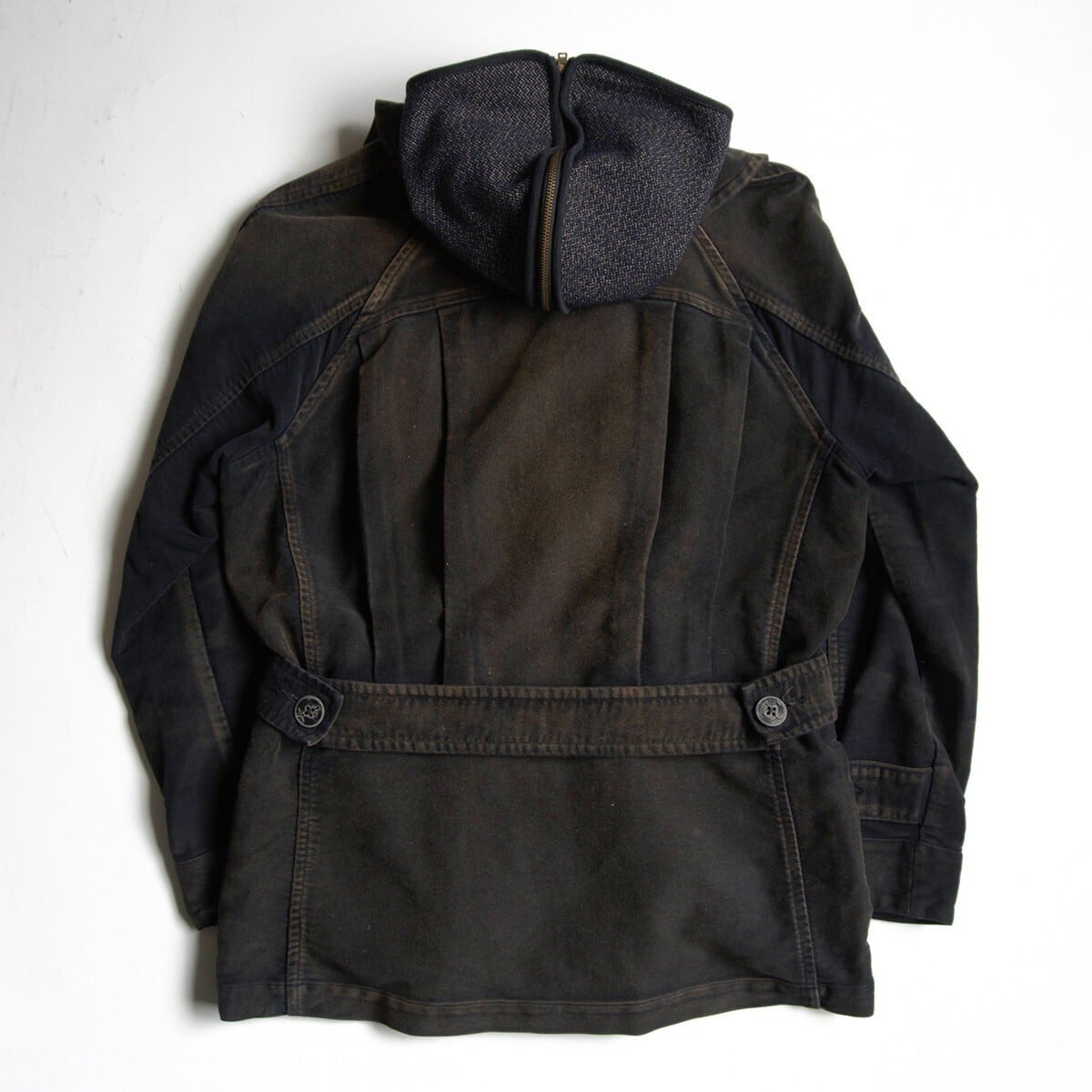 リペアやヴィンテージ加工の施されたモールスキン素材の一着。フード部分はビーチクロス地になっております。