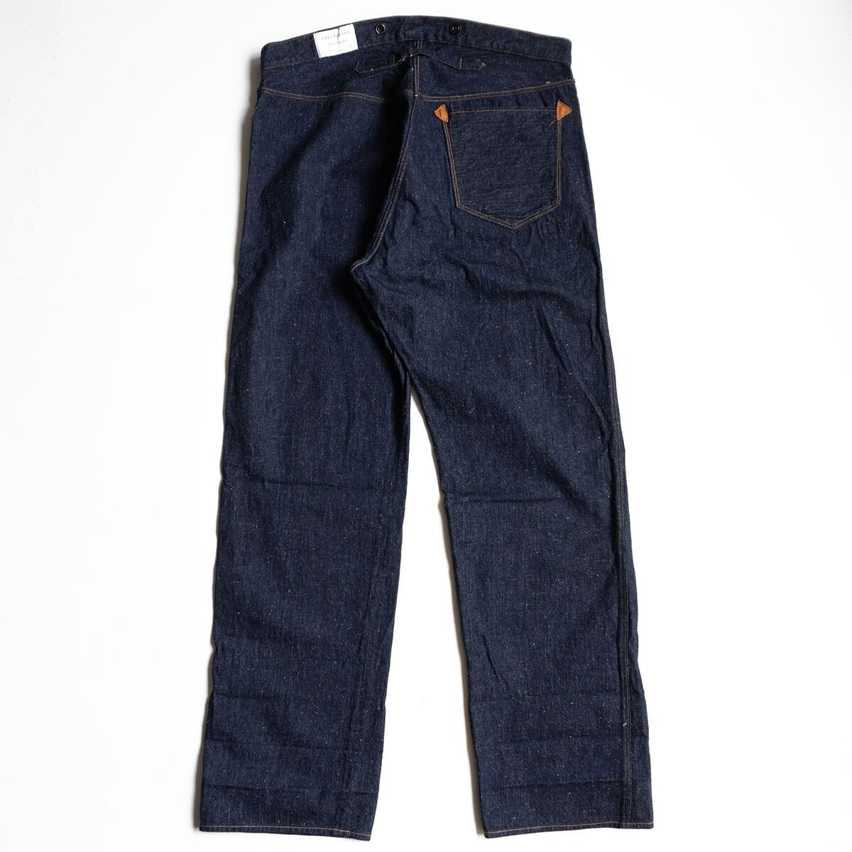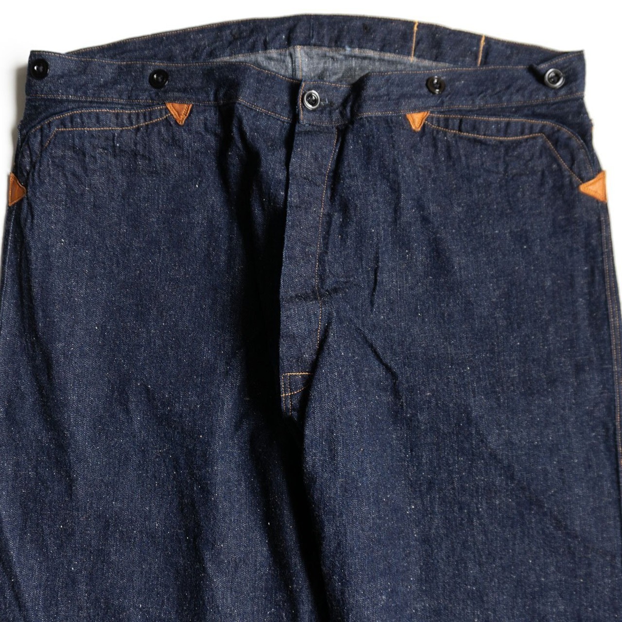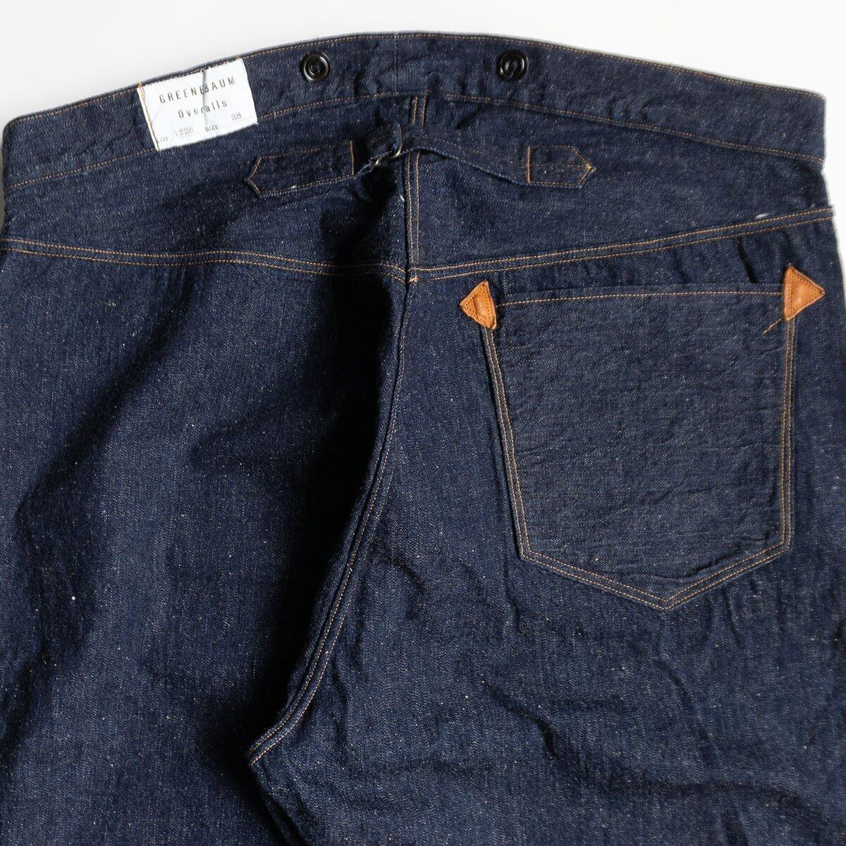 グリーンバウム を代表するウエストオーバーオールが、この3ポケットタイプのモデル。1874年にパテントを取得したリベット箇所を革で補強する仕様をはじめとして、コインポケットがつかないフロントポケット。立体的なL字のその形状も、明らかにオリジナルの仕様です。デニムはこの時代には珍しく細い番手がヨコ糸に使用されたライトオンス綾( 2/1綾 :タテ糸2本、ヨコ糸1本の順に浮いている綾織)となります。お探しの方は是非。