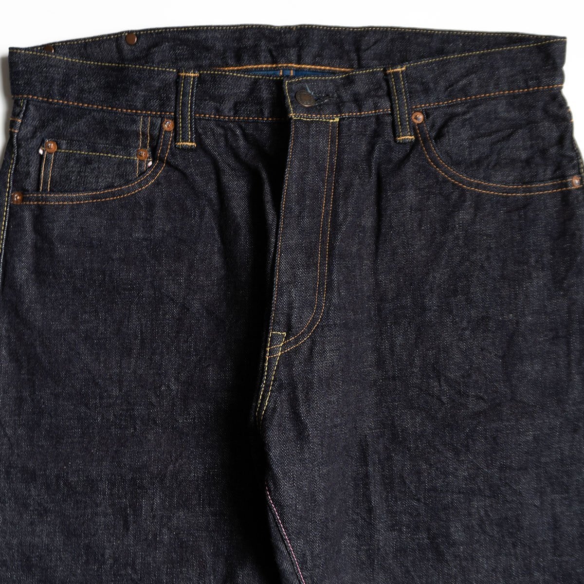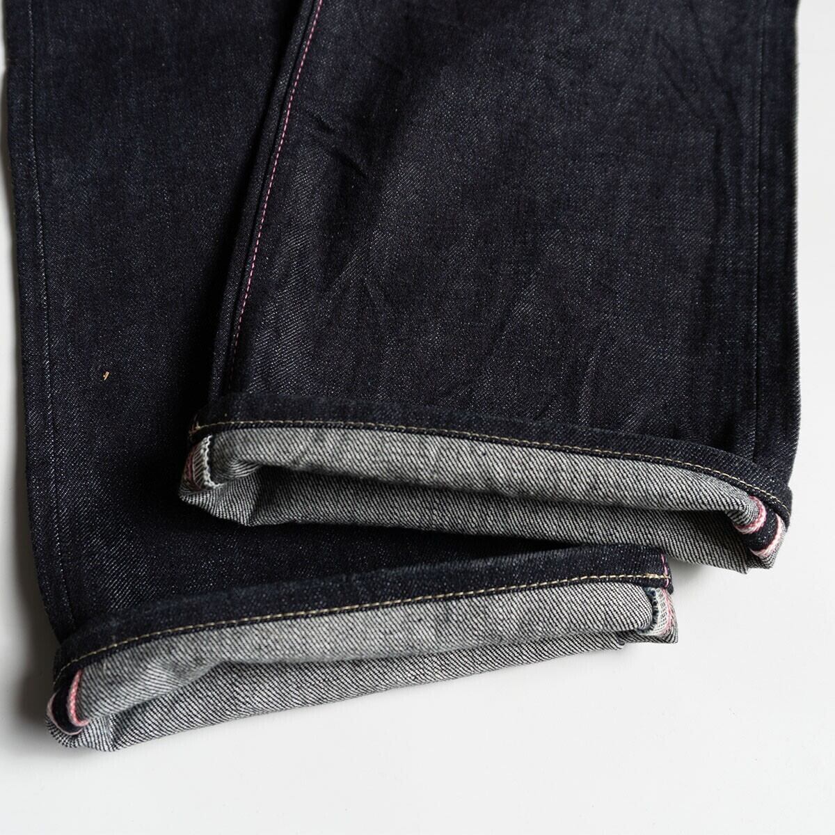 ロープ染色を繰り返し特濃インディゴブルーに染めたジンバブエコットン使用した1本。股上が深く、もも周りはゆったり目で膝下から強くテーパードをかけたストレートシルエットです。これから経年変化をお楽しみいただけます。