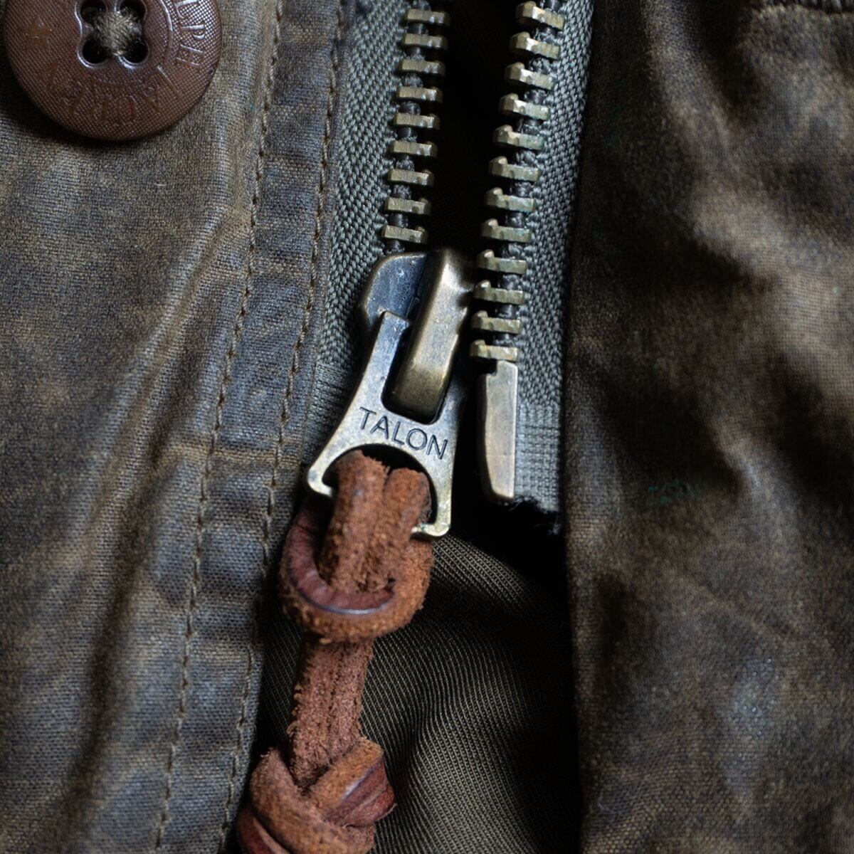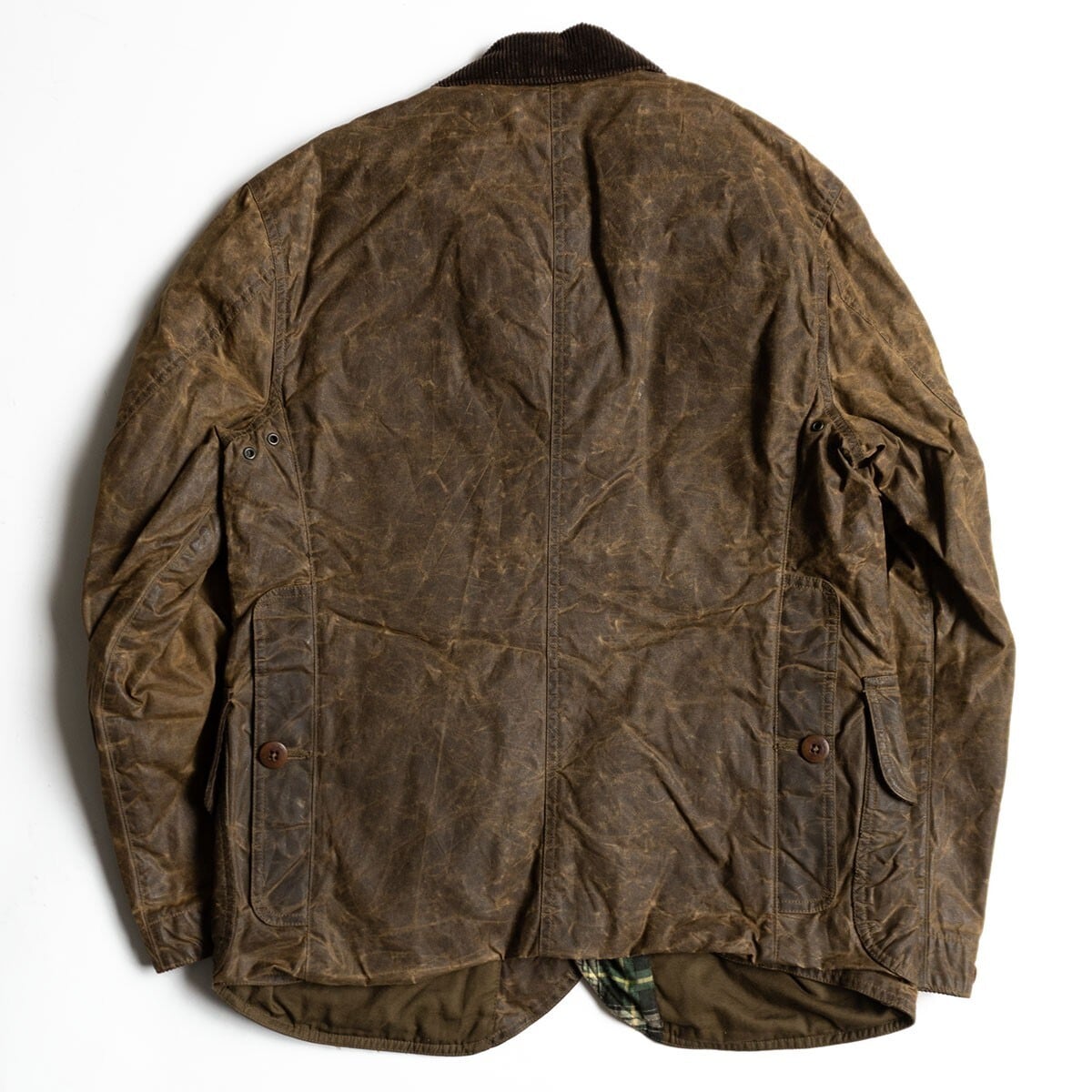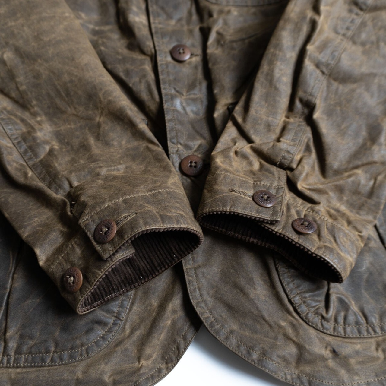 ヴィンテージ加工の施されたオイルドクロス地を使用したハンティングジャケット。襟はコーデュロイ素材、ライニングにはネル地を使用しております。