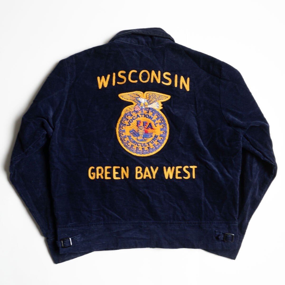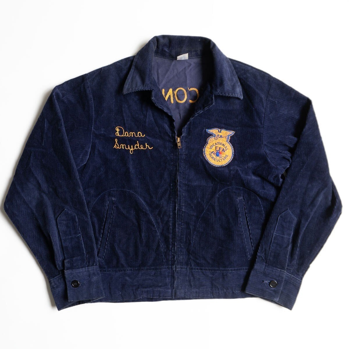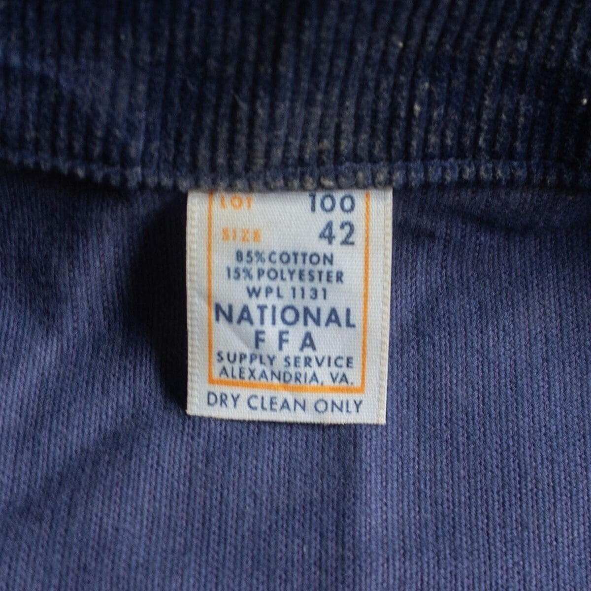FFAとはFuture Farmars of Americaの頭文字をとった略称でアメリカ合衆国学校農業クラブ連盟のことを指します、『みんなでアメリカの農業の未来を考えていきましょう』という意味になります。その団体のユニフォームとして使用されていたのがこのFFAジャケットです。カラーは紺をベースに前後にはFFAのワッペン後ろにはワッペンの上に各州のチェーンステッチが入っています。