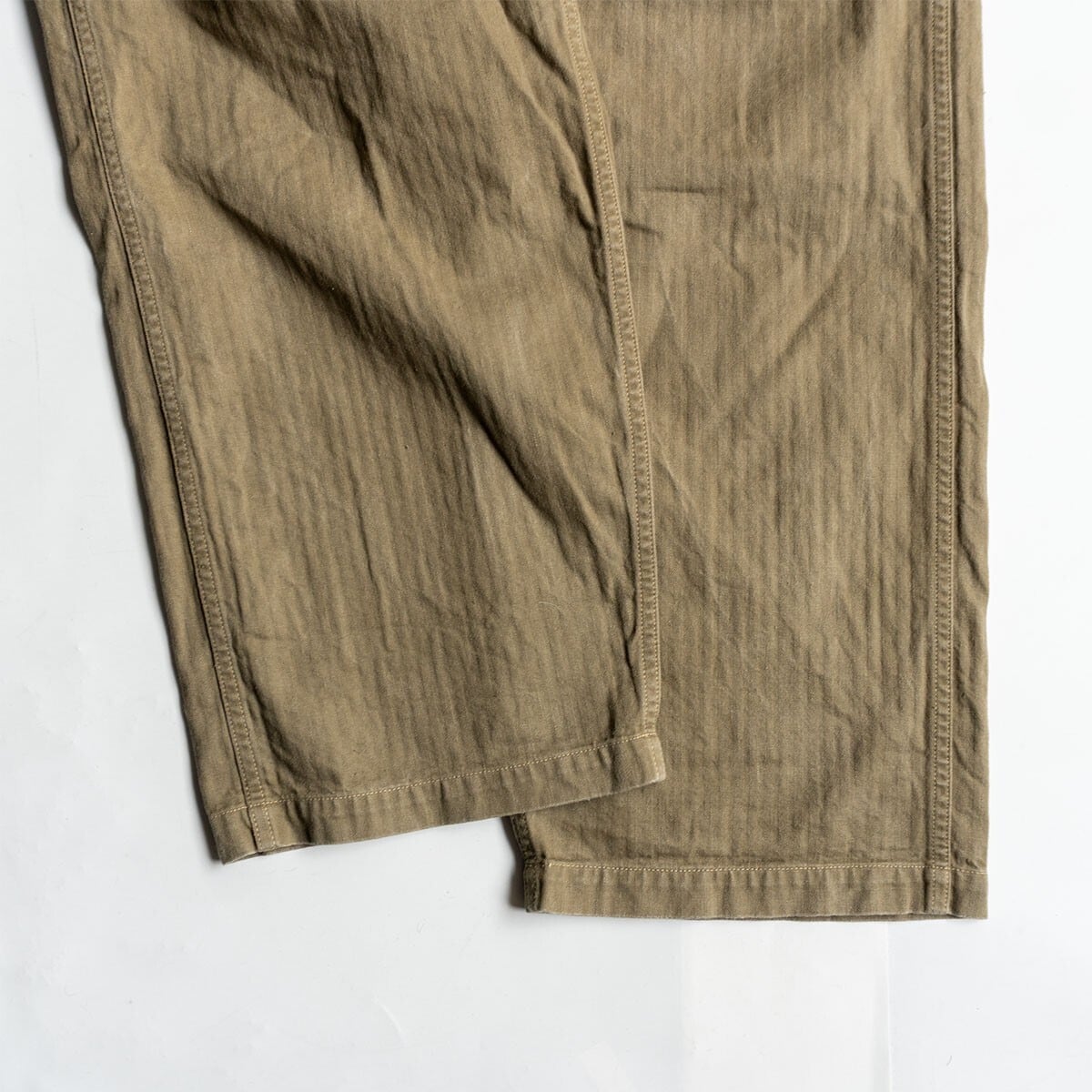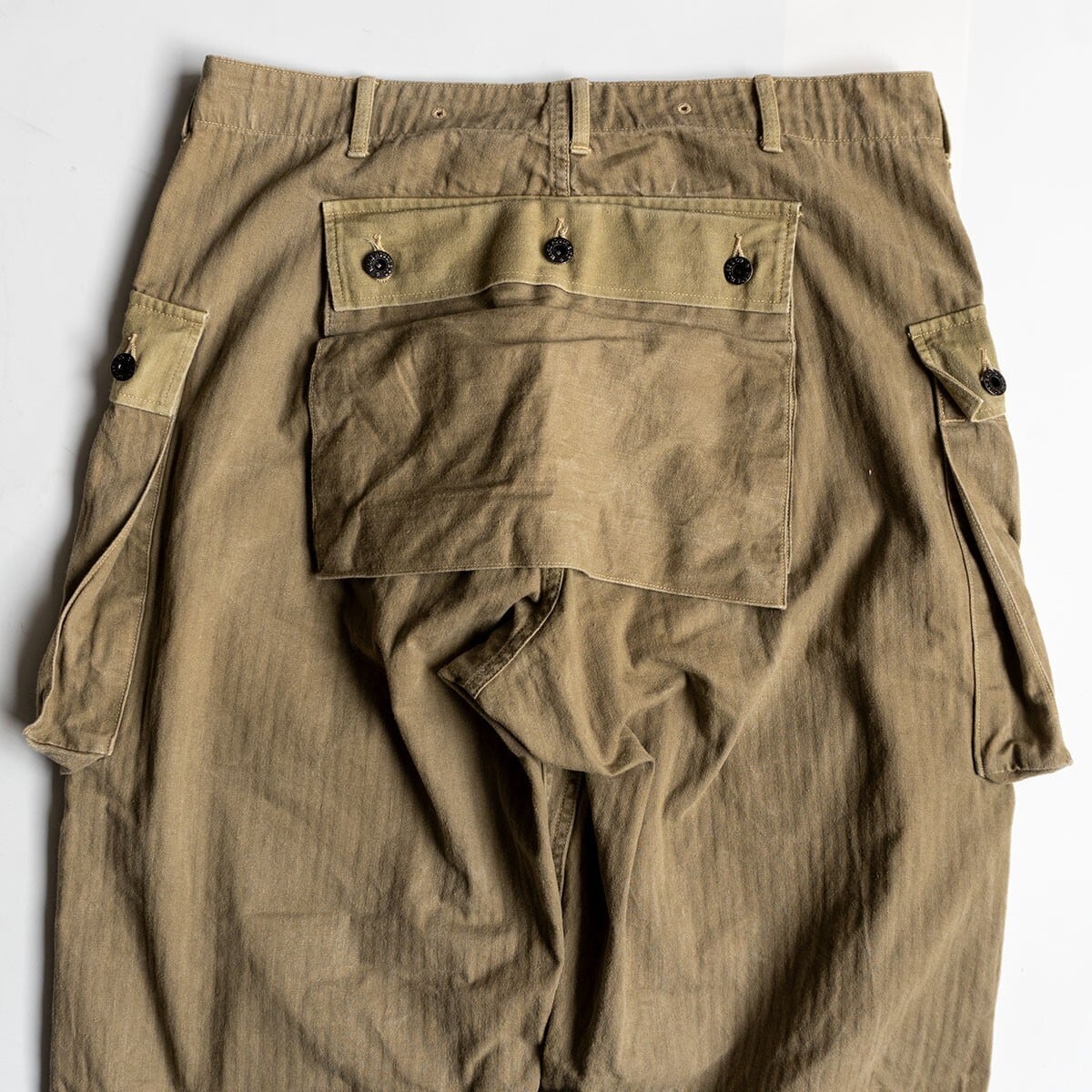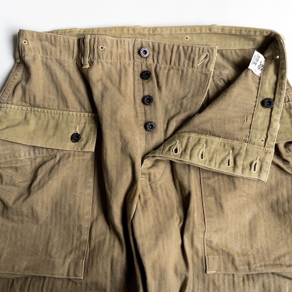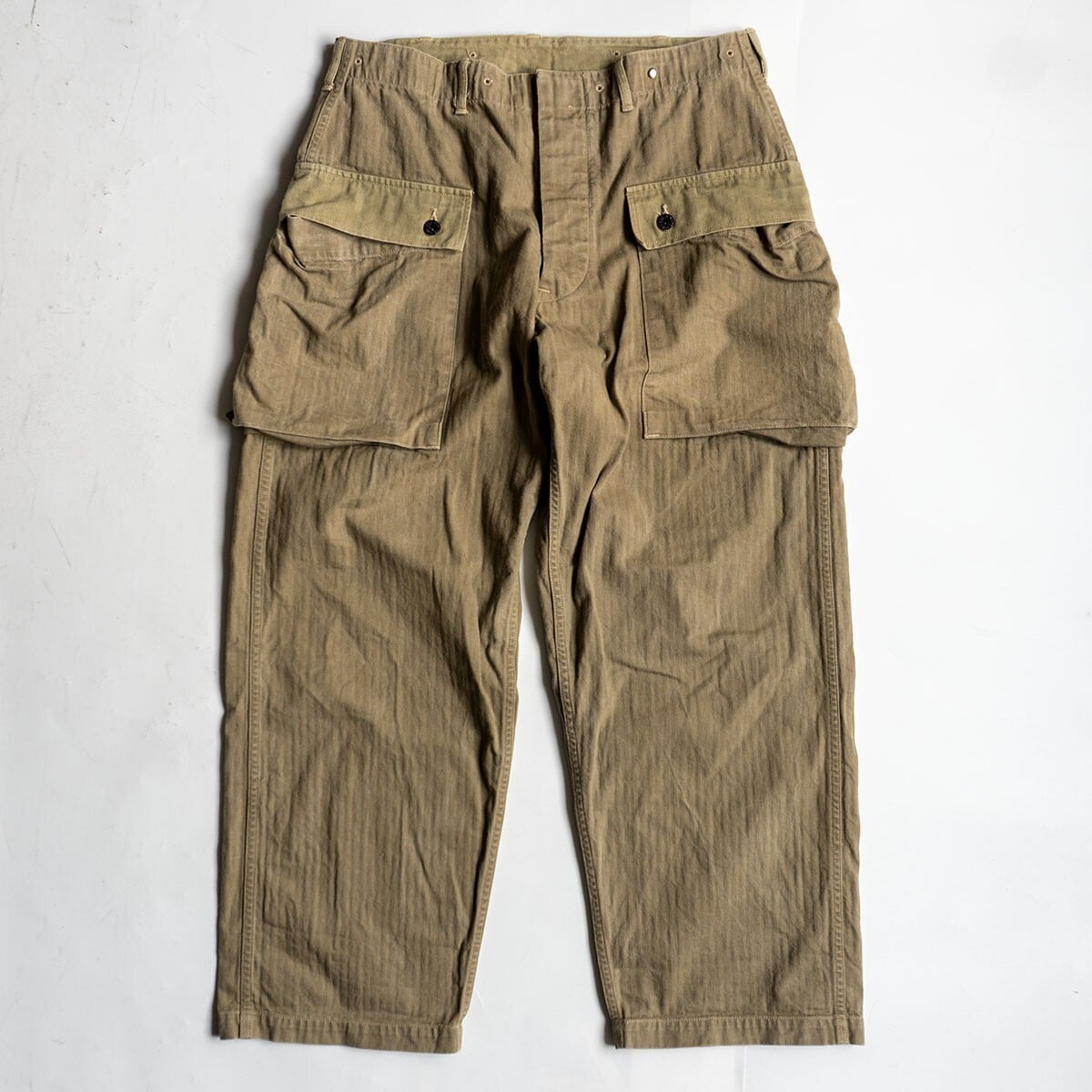 モンキーパンツの愛称で親しまれる’40年代にアメリカ海兵隊で採用されていたM44型のモデルがベースとなっています。畝感の強いヘリンボーンツイルも忠実に再現しており、深くゆったりとした股上を十分に生かすため、レングスは短めに設定しています。また希少なミシンで施されたウエストバンドと裾にあしらわれた菊孔がポイントです。お探しの方は是非。