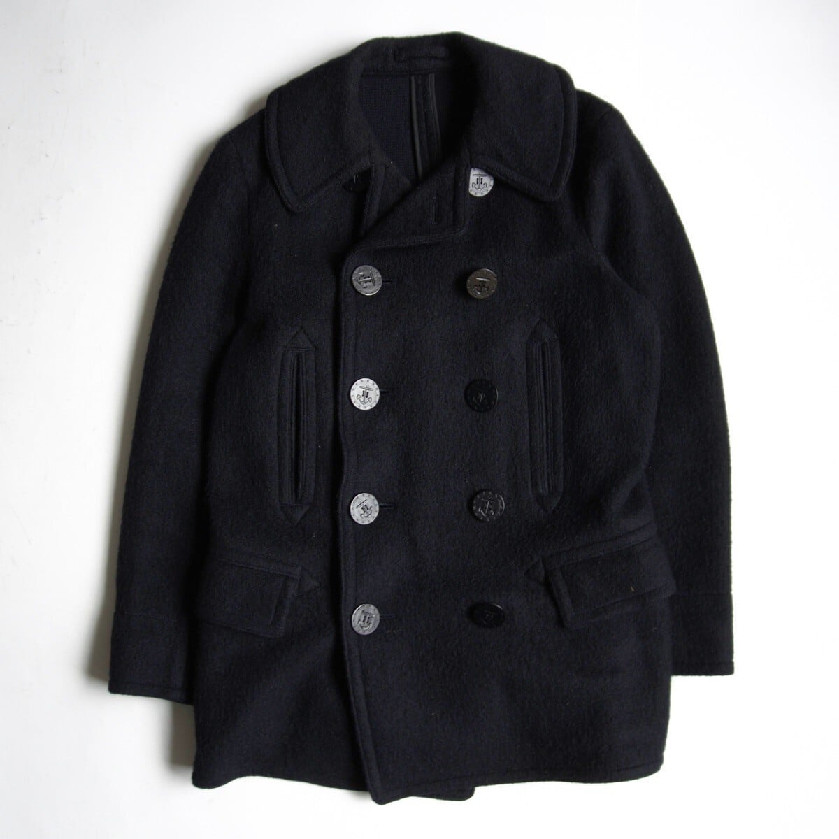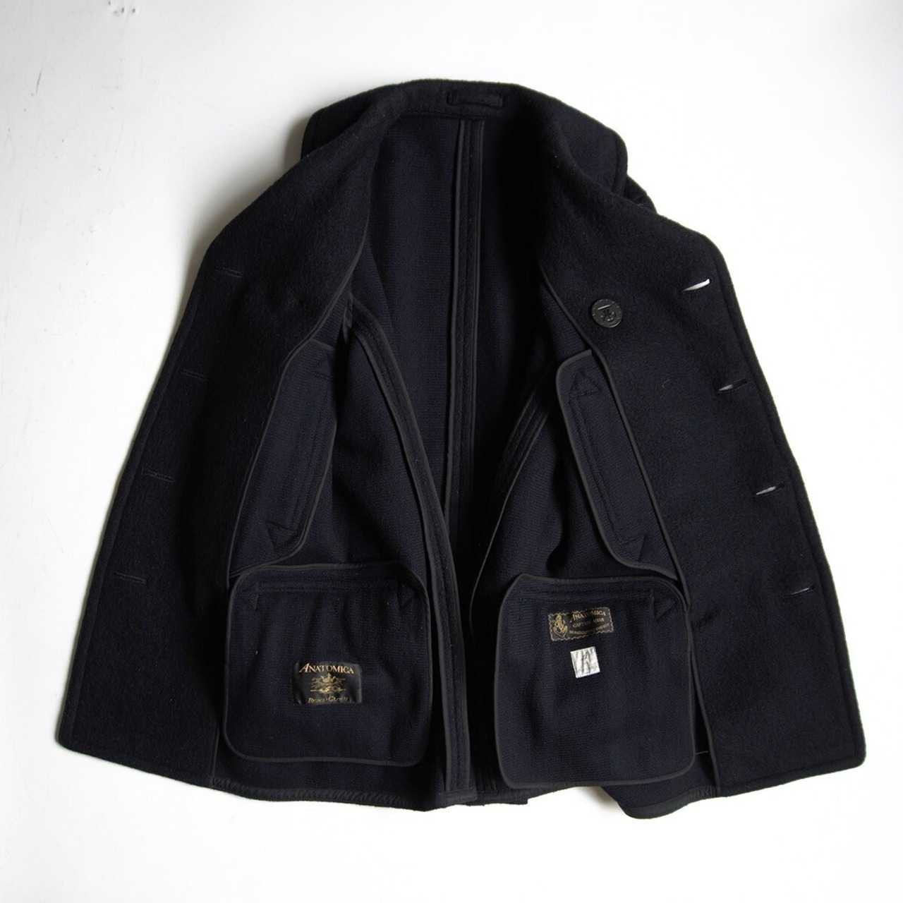 素材は表地はウール100%の高密度なメルトン生地を使用。ヴィンテージのPコートをベースに作られた10ボタンデザイン。しっかりと目の詰まったメルトン素材を仕様し重厚感のある本格的なコート。仕立てがよく着ていてもストレスや重さを感じないのもポイント。襟は大きめなのでチンストを付けて立てれば風の侵入も防げます。アナトミカらしいどこか品の感じる1着。
