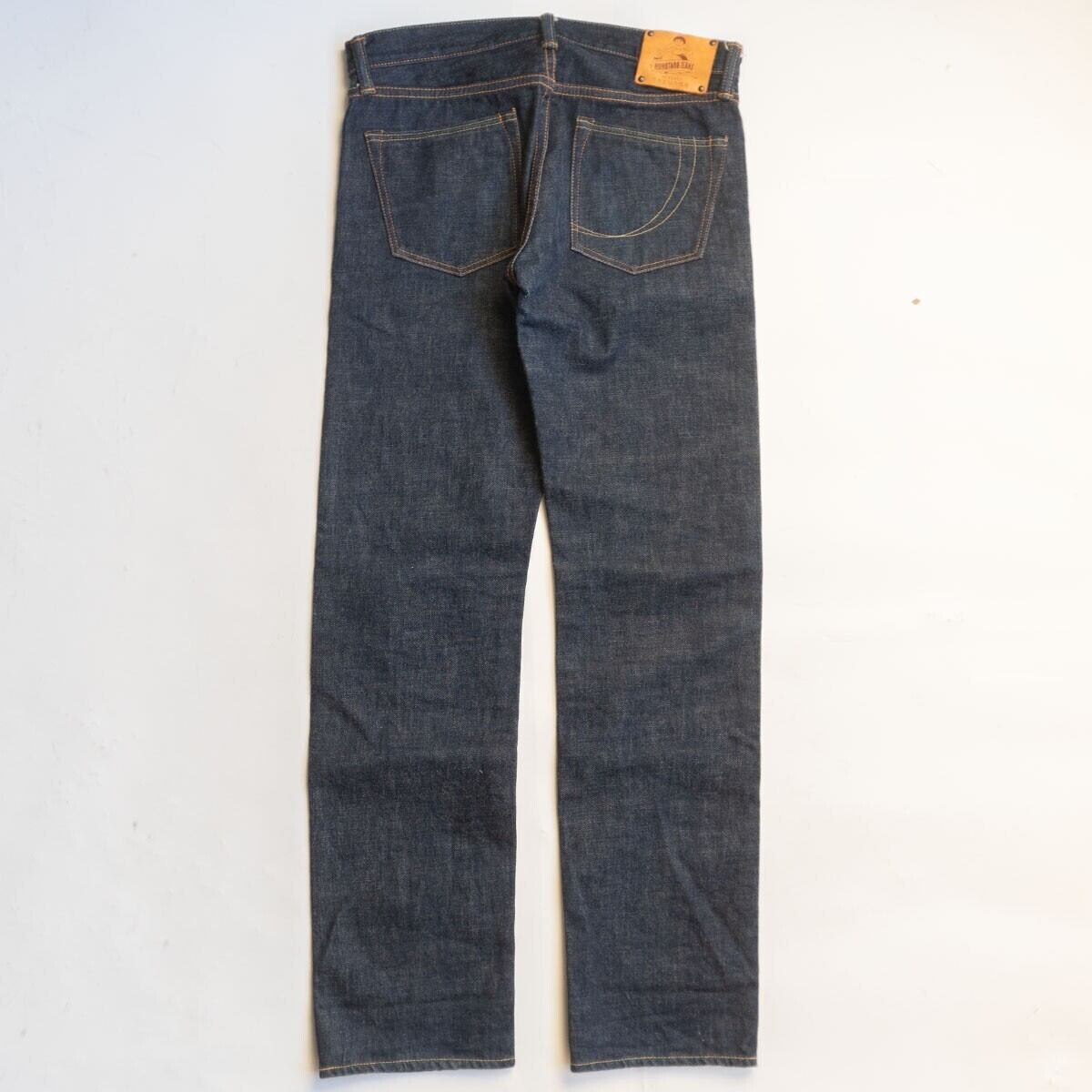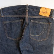 ロープ染色を繰り返し特濃インディゴブルーに染めたジンバブエコットン使用した1本。股上が浅く、細身で若干テーパードの入ったタイトストレート。ヒップ周りから裾まで全体的にタイトなシルエット。