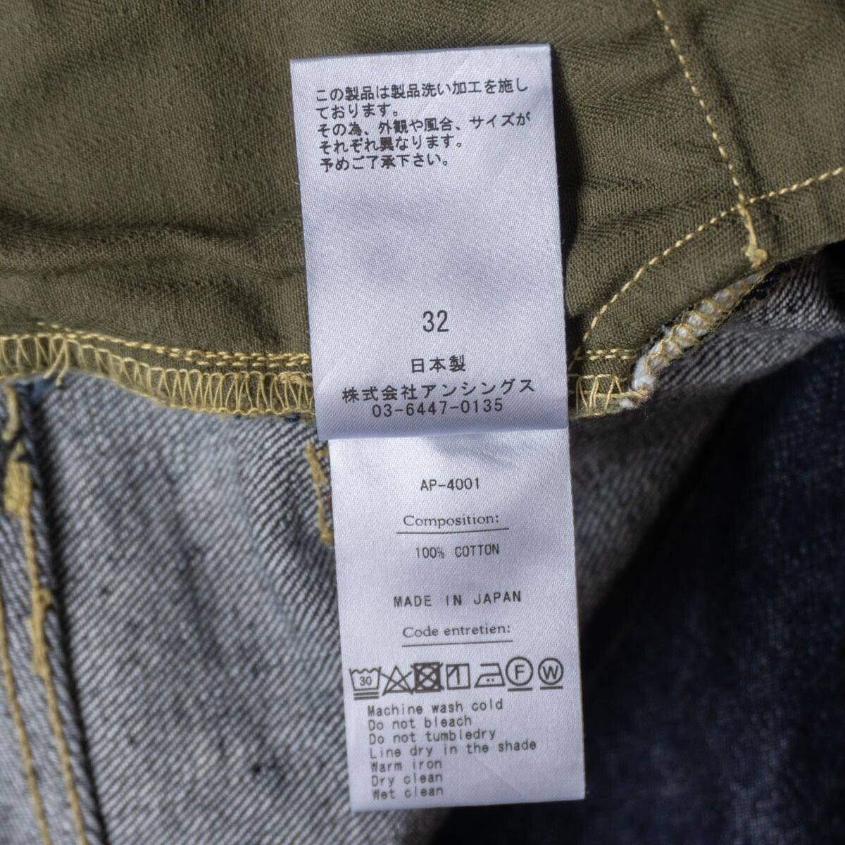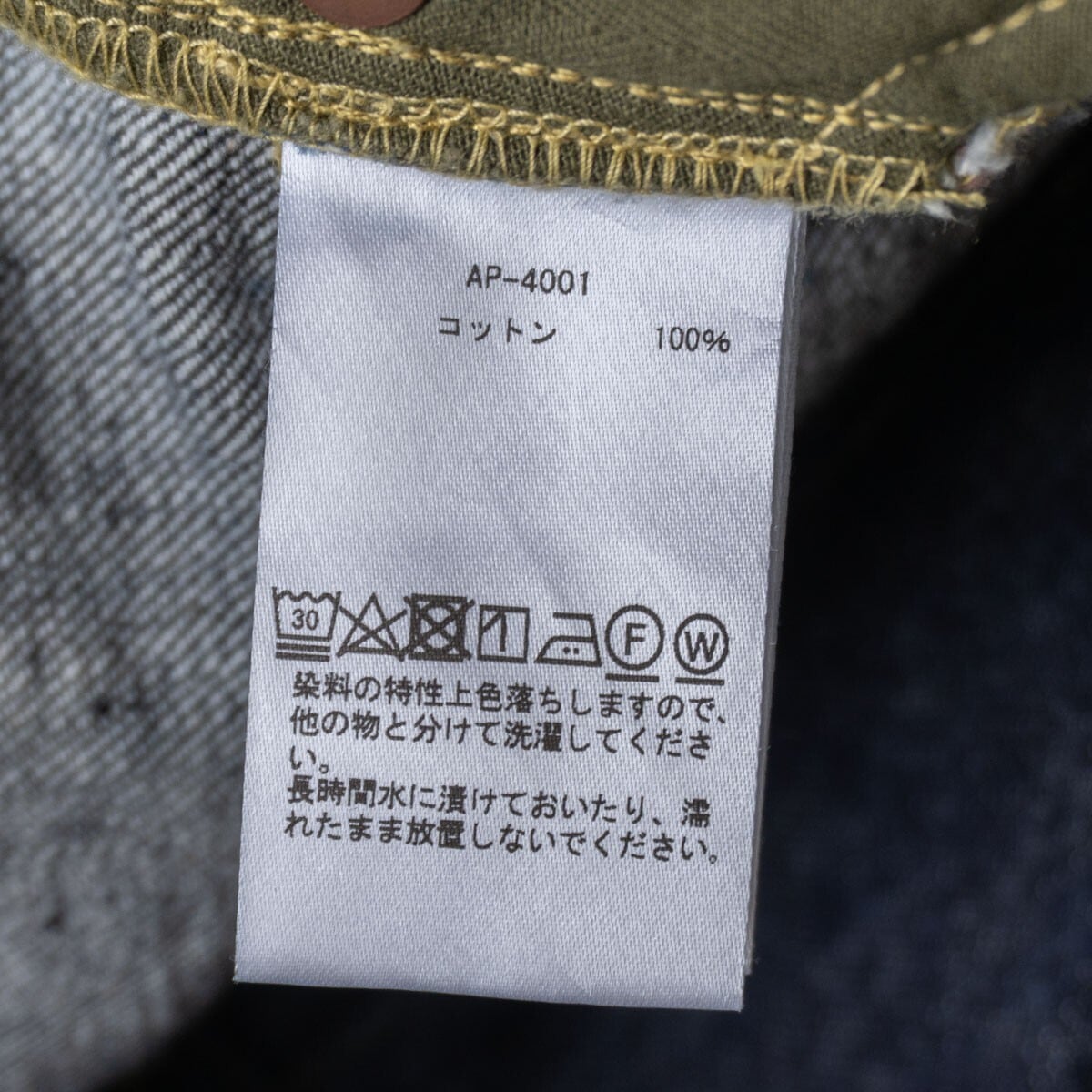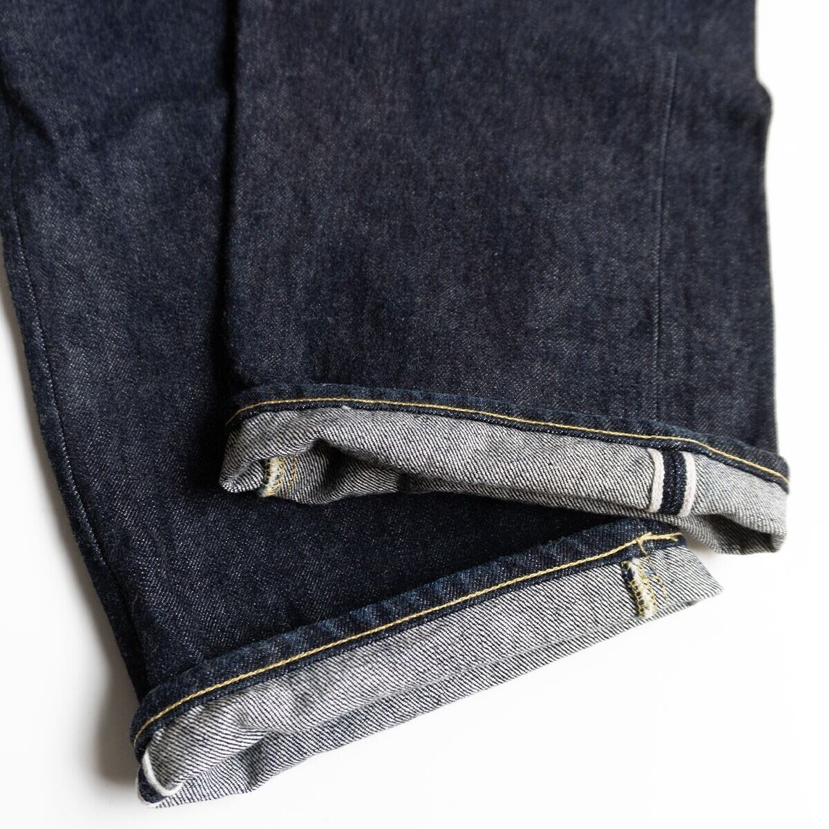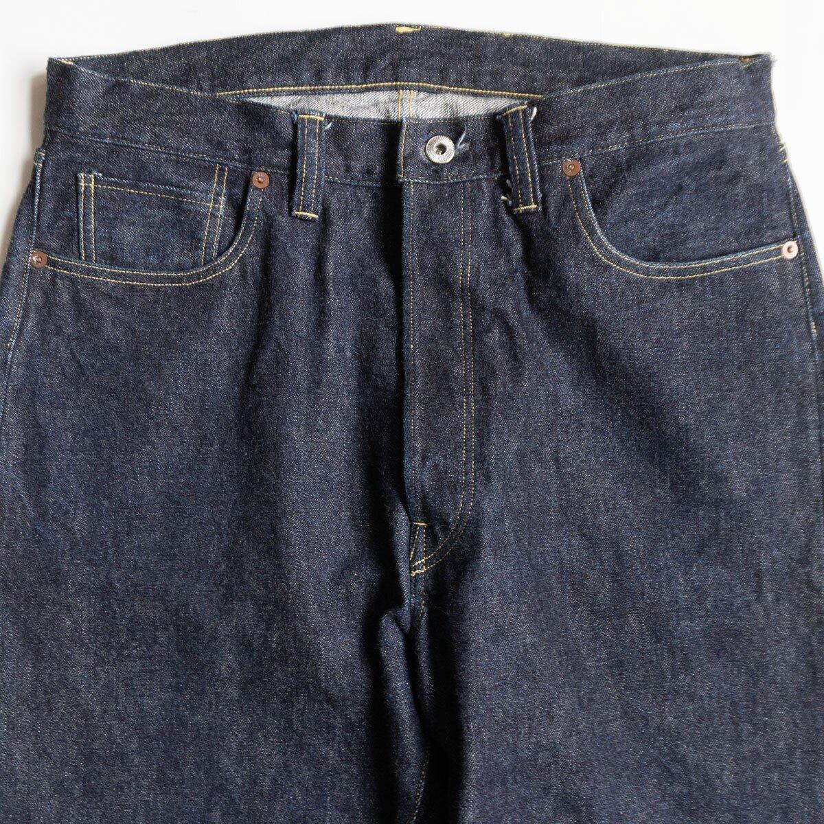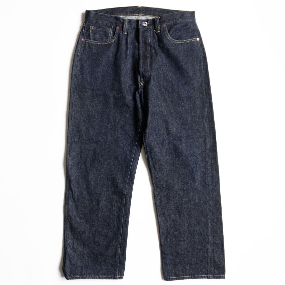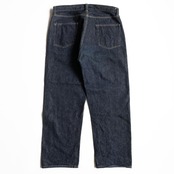 ベルトループの太さや位置、リベットの箇所など、大戦モデルを踏襲しアレンジしました。 オリジナルのタック釦を採用しています。 生地は13.5ozの大戦モデルを解析したキバタデニムです。古着から糸を解き、弱強撚ネップ 糸、綿葉カス入りで紡績しています。ムラ形状は、綿の配合と機械の設定による自然な機械ムラを 再現し、緯糸は分析の結果、経糸との回転数や形状を変えています。綿自体の色目は現在は品種 改良によって白度が高いものが生産されていますが、当時の茶綿に近いクリーミーな色を再現する よう米綿を配合しています。硫化などの混ぜ物はないレギュラーよりも濃いインディゴ色を再現しました。お探しの方は是非。