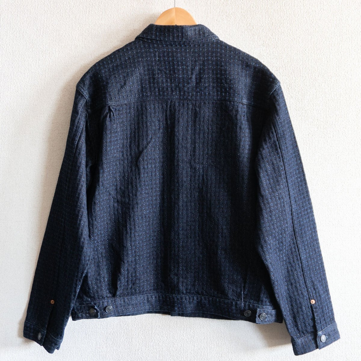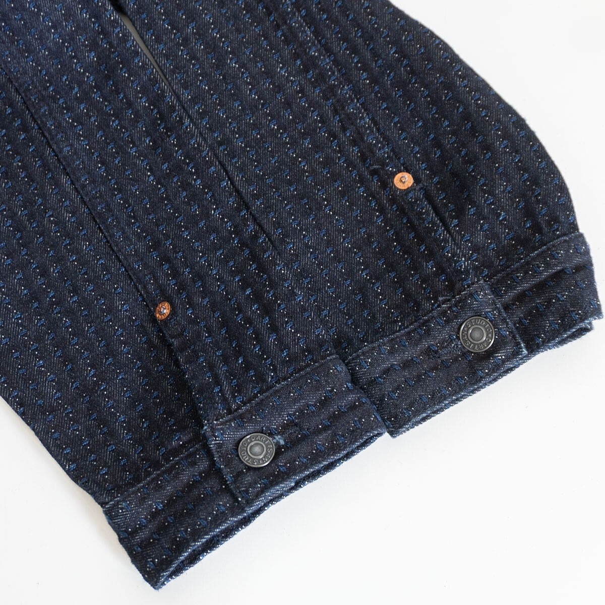 デニムの生地の上に施された刺し子をジャガード織りで表現した『SASHIKO DENIM』ジャケットです。