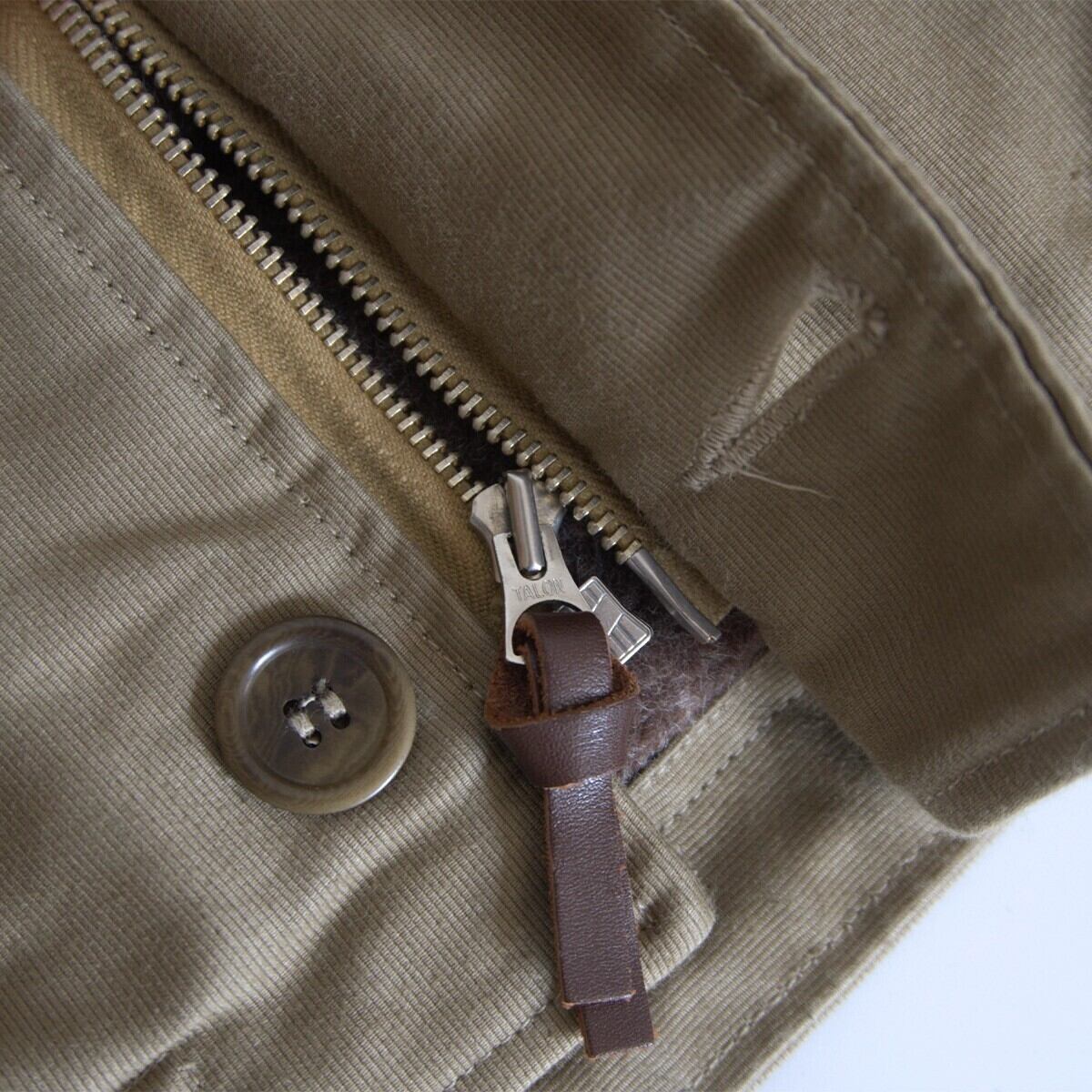 1943年から正式採用されたといわれるN1ウィンタージャケット。1944年には大量に納入されている実績がありますが、その直前に製造されたプロトタイプがこのNAF1168です。NAFとは「NAVAL AIRCRAFT FACTORY」の事で海軍専用の飛行機工場をさしています。この工員のために作られたといわれるものがNAF1168と呼ばれており、戦前にはアビエーターとデッキクルーが着用したパッチポケット型のZIPアップタイプ。その後デッキクルーはアルパカライナーからメルトンライナーとなり、ジッパーからフックタイプとなりますが、NAFではアルパカを継続し、ジッパーとボタンでフロントを合わせるこちらのモデルを採用しました。ブルーとカーキのジャングルクロスで使用されており、背面に入る反射プリントは、 NAFにおいては二色ともに同じカラーが入ります。さらには脇の下、裾にはセットアップや装備とジョイントするための吊り下げが付き、 袖口までアルパカが付いた仕様もこのモデルだけの特徴です。第二次世界大戦後も長い期間海軍のデッキジャケットとして着用が続いたことからも、 このタイプがいかにクルーからの支持が高かったかを想像することができます。
