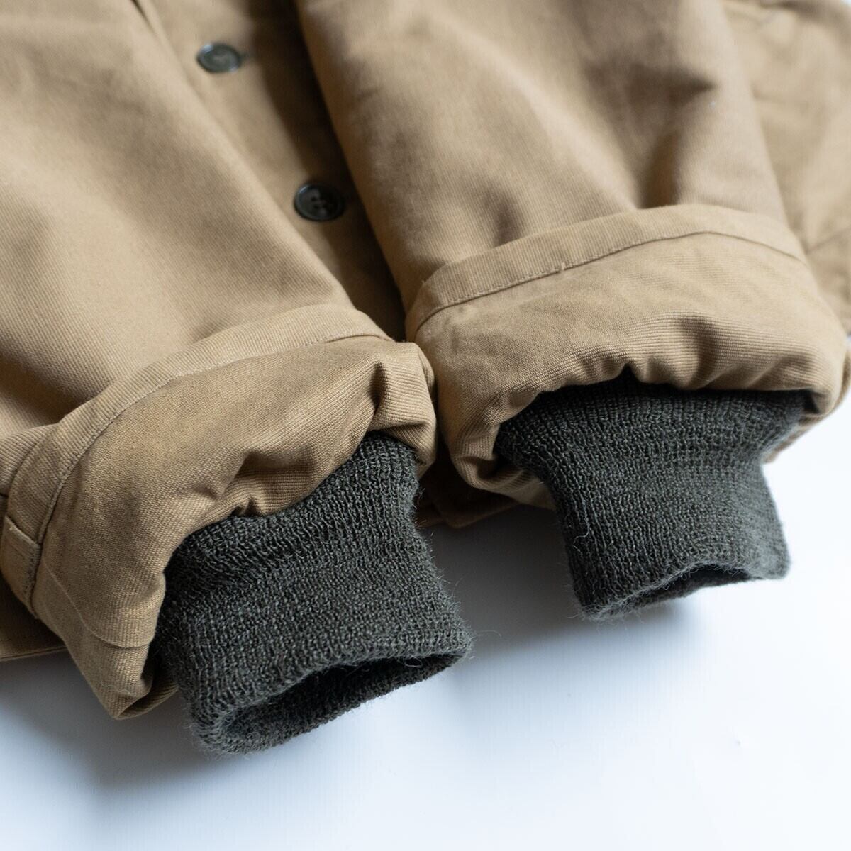 第二次世界大戦から朝鮮戦争にかけ米海軍の艦艇乗員用として採用されたN-1デッキジャケット。こちらの表素材には他のデッキジャケットと同様で通称"ジャングルクロス"と呼ばれるコットングログランが使用され、裏地には遮風性と保温性に優れたアルパカ・モヘア・ウールパイルが使用されています。防寒性抜群の1着です。