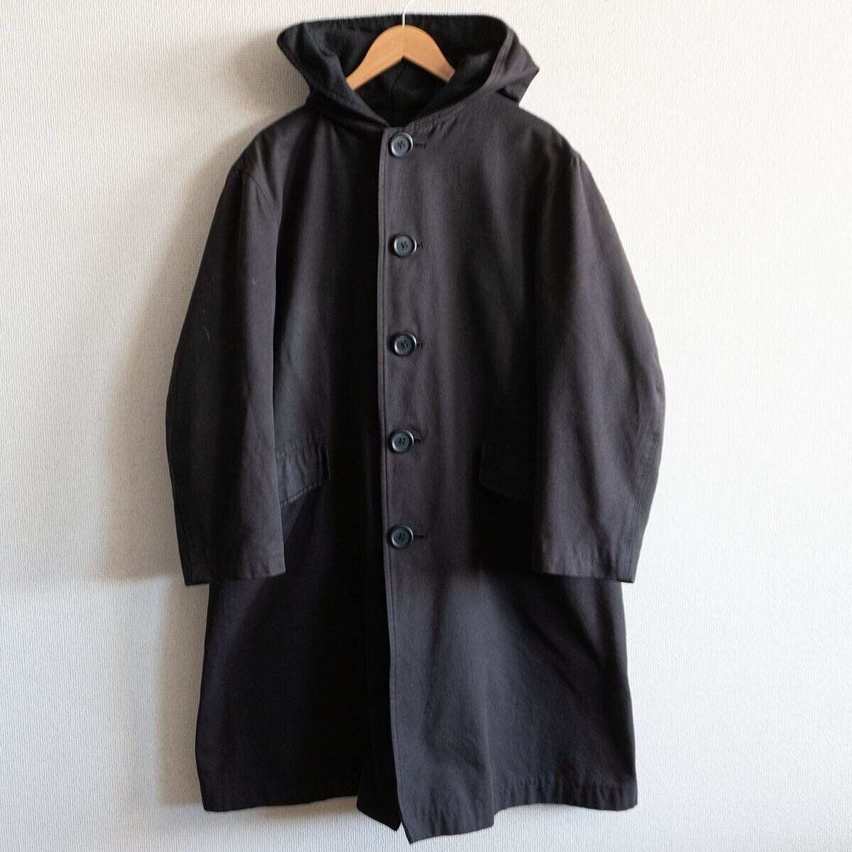 張りのあるコットン素材を使用したフード付きロングコートです。お色はブラック。お探しの方や気になる方は是非。