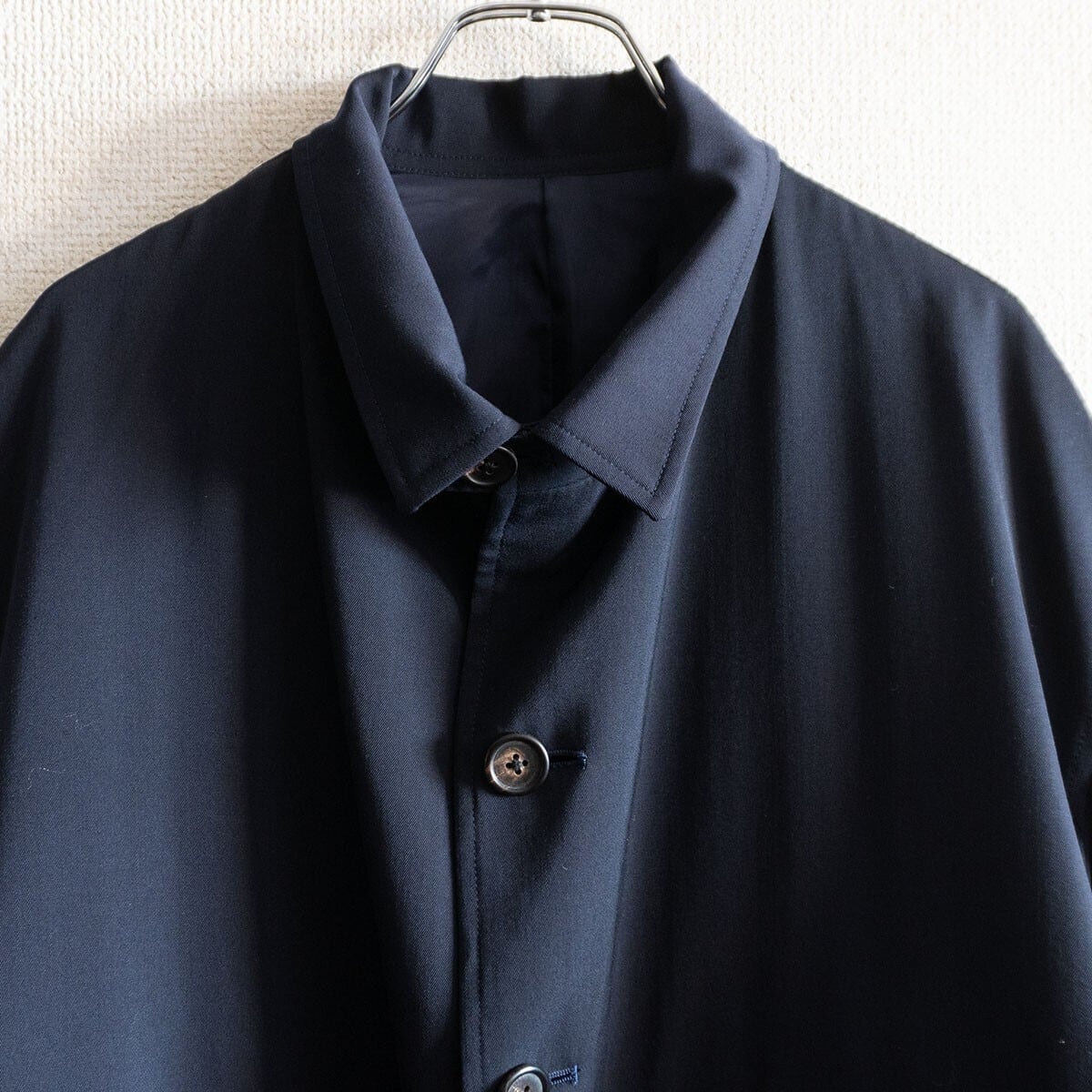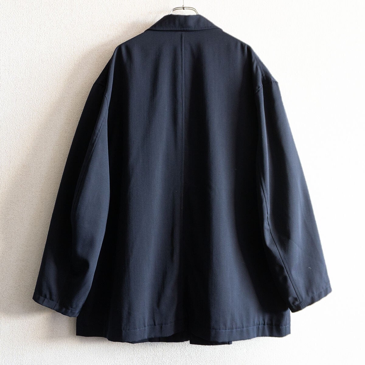ダークネイビーのカバーオールジャケットです。ゆったりとしたワイドなシルエットです。お探しの方や気になる方は是非。