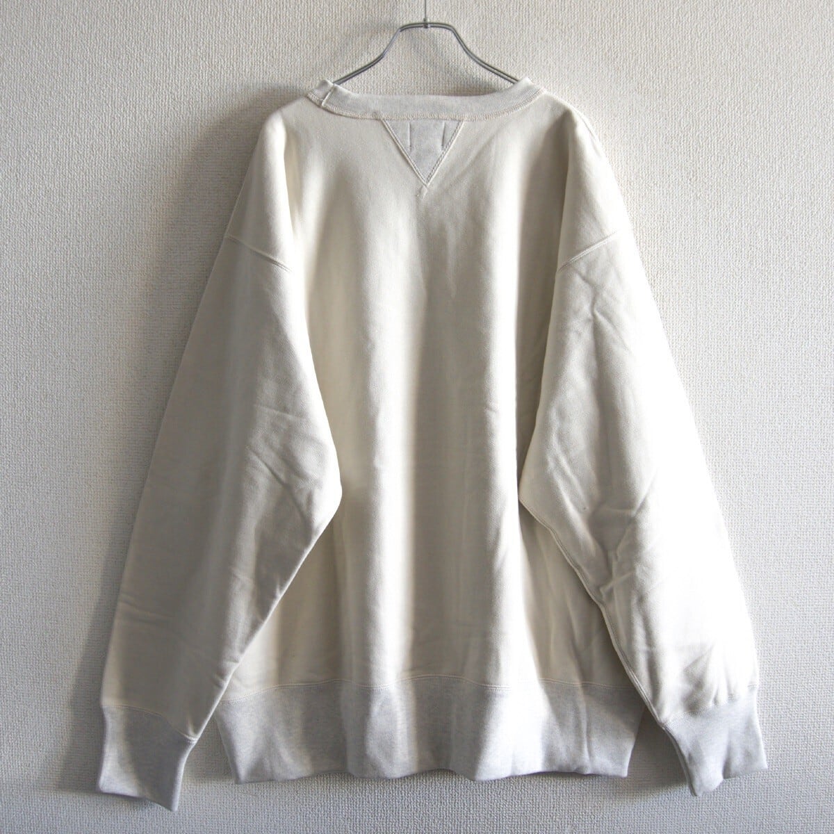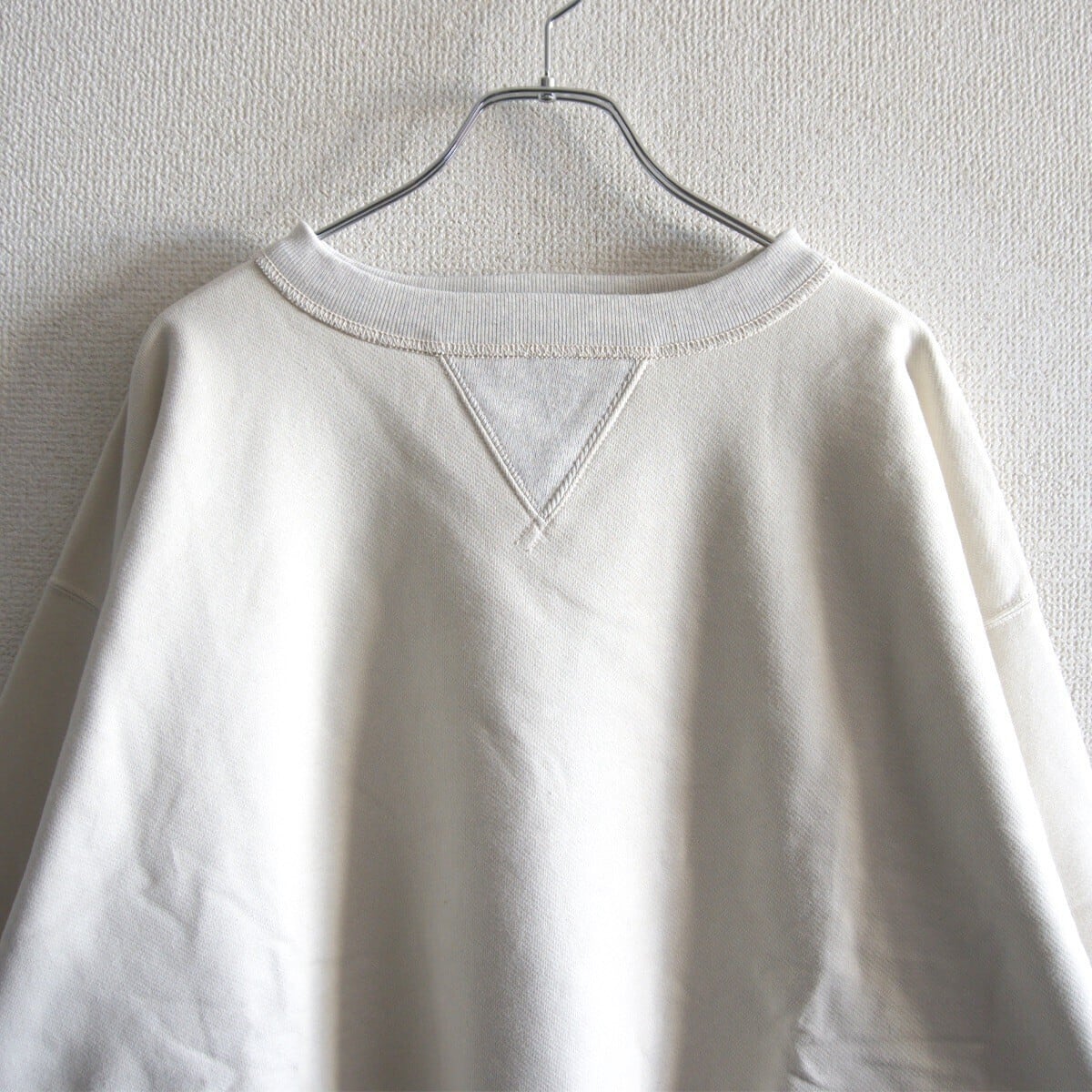 生地のウェイトはミディアムになり、程良い肉感のある裏起毛のスウェット生地を使用しております。両V、セットインスリーブ、縫製は二本針、ボディは剥ぎがあるデザイン。