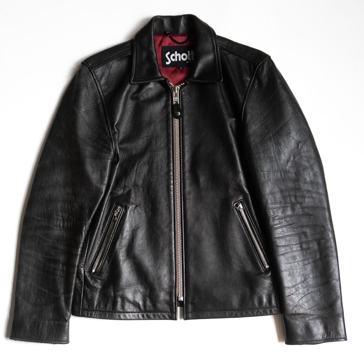 襟のあるシングルレザージャケット。シンプルなデザインで着まわしやすい1着です。お探しの方や気になる方は是非。