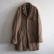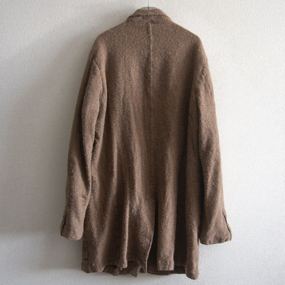強めのウール縮絨で、ランダムな毛玉感シワ感ヨレ感が特徴のデザインです。裏地があるだけでなく縮絨が強めにかかっており生地が詰まっているので防寒性のあるコートです。