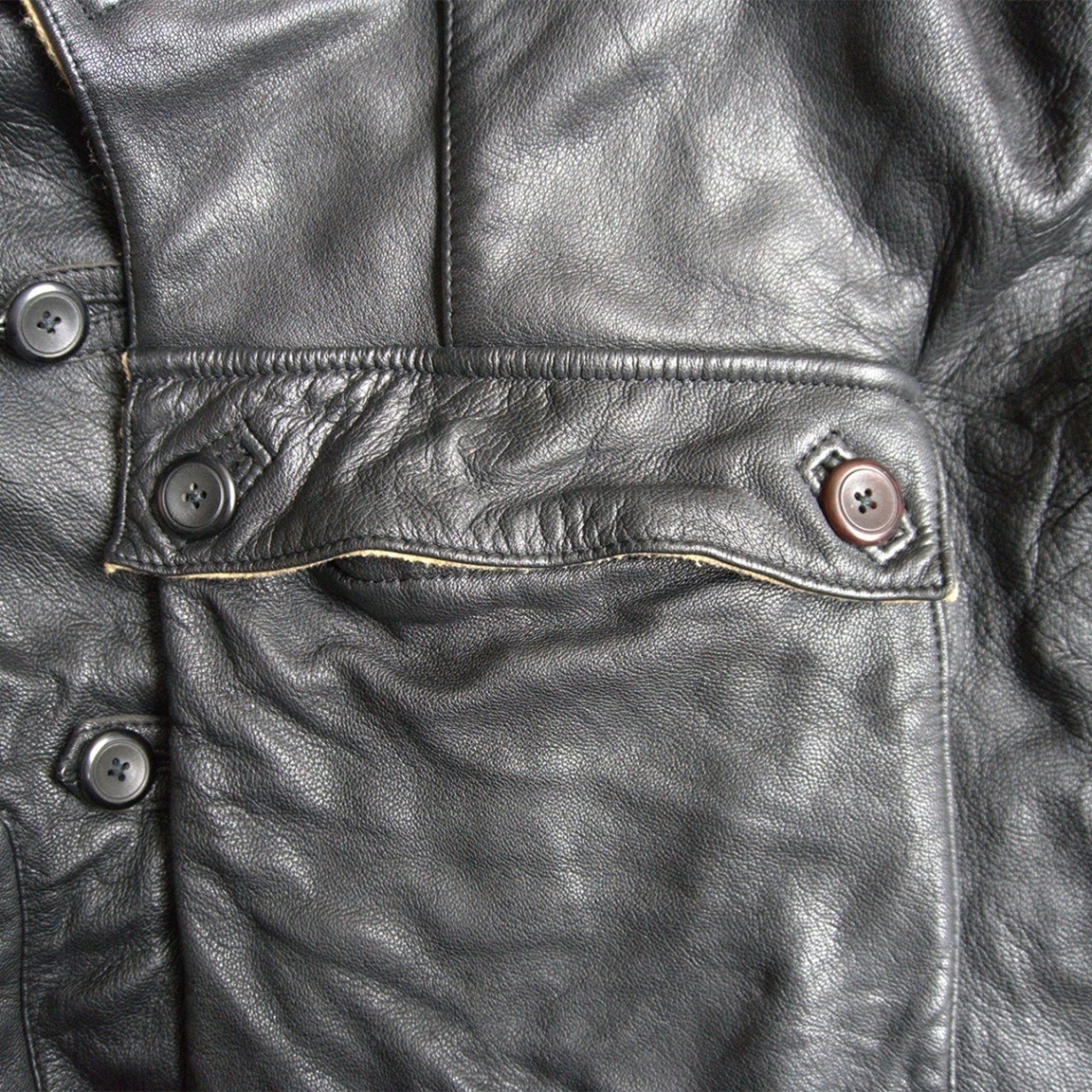 肉厚な牛革を使用したフロントの大きなポケットが目を惹く1着。お色はブラックです。お探しの方や気になる方は是非。