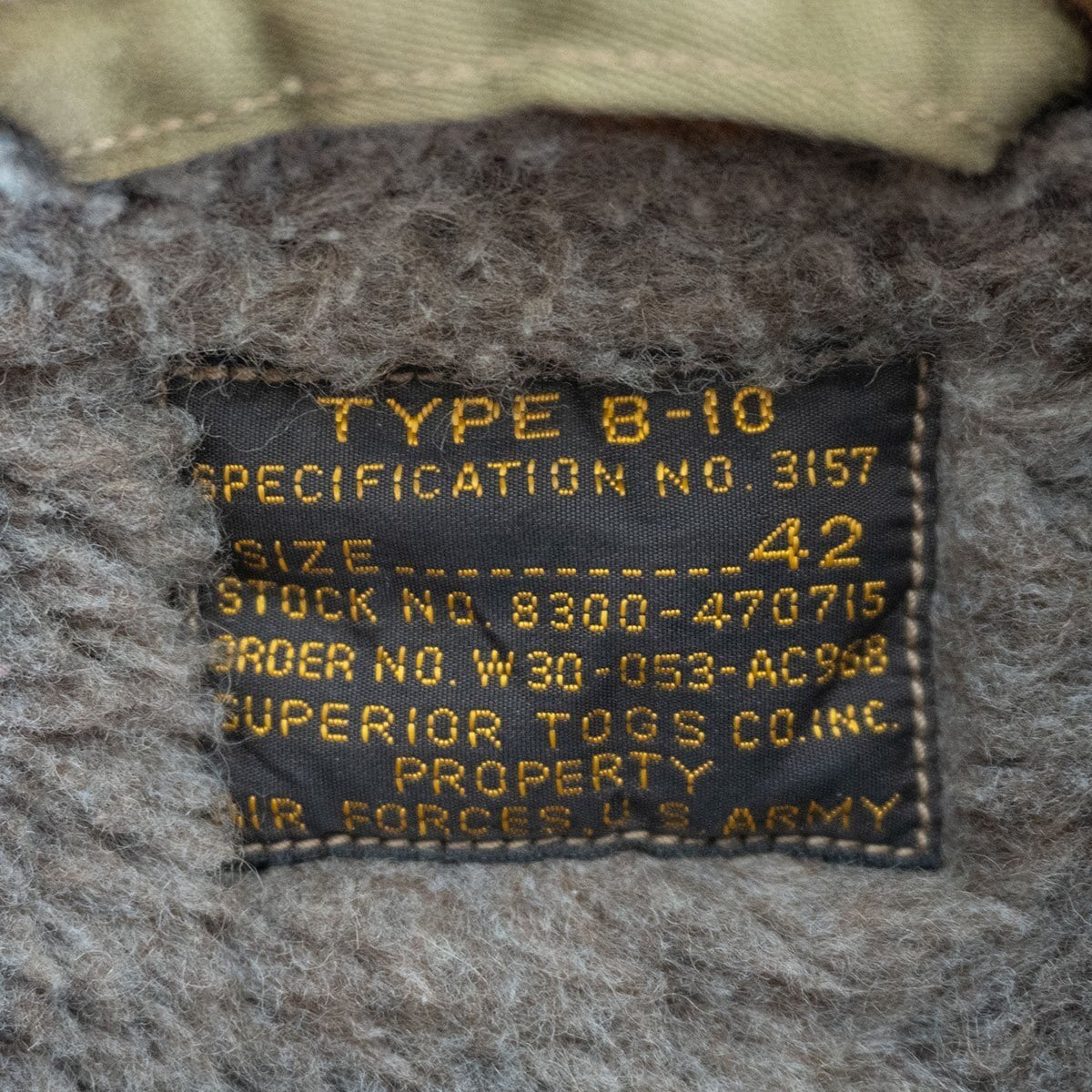 B-10は革製フライトジャケットの代替として1943年7月22日に米陸軍航空隊が正式採用した布製フライトジャケットである。ライニングにはアルパカモヘアウールパイルを使用しており保温能力が高い1着です。。お探しの方や気になる方は是非。
