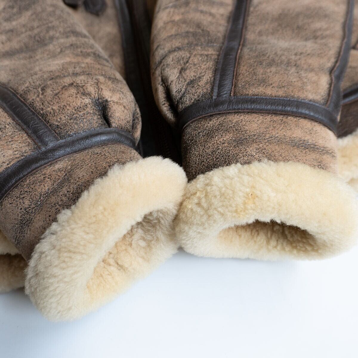 ボディには肉厚ながらモチっとした弾力性を持つ上質のシープスキン(羊革)が使用されております。裏地にはふかふかのムートンボアが敷き詰められ最高の着心地・防寒性を誇ります。エイジング加工モデルでございます。お探しの方や気になる方は是非。
