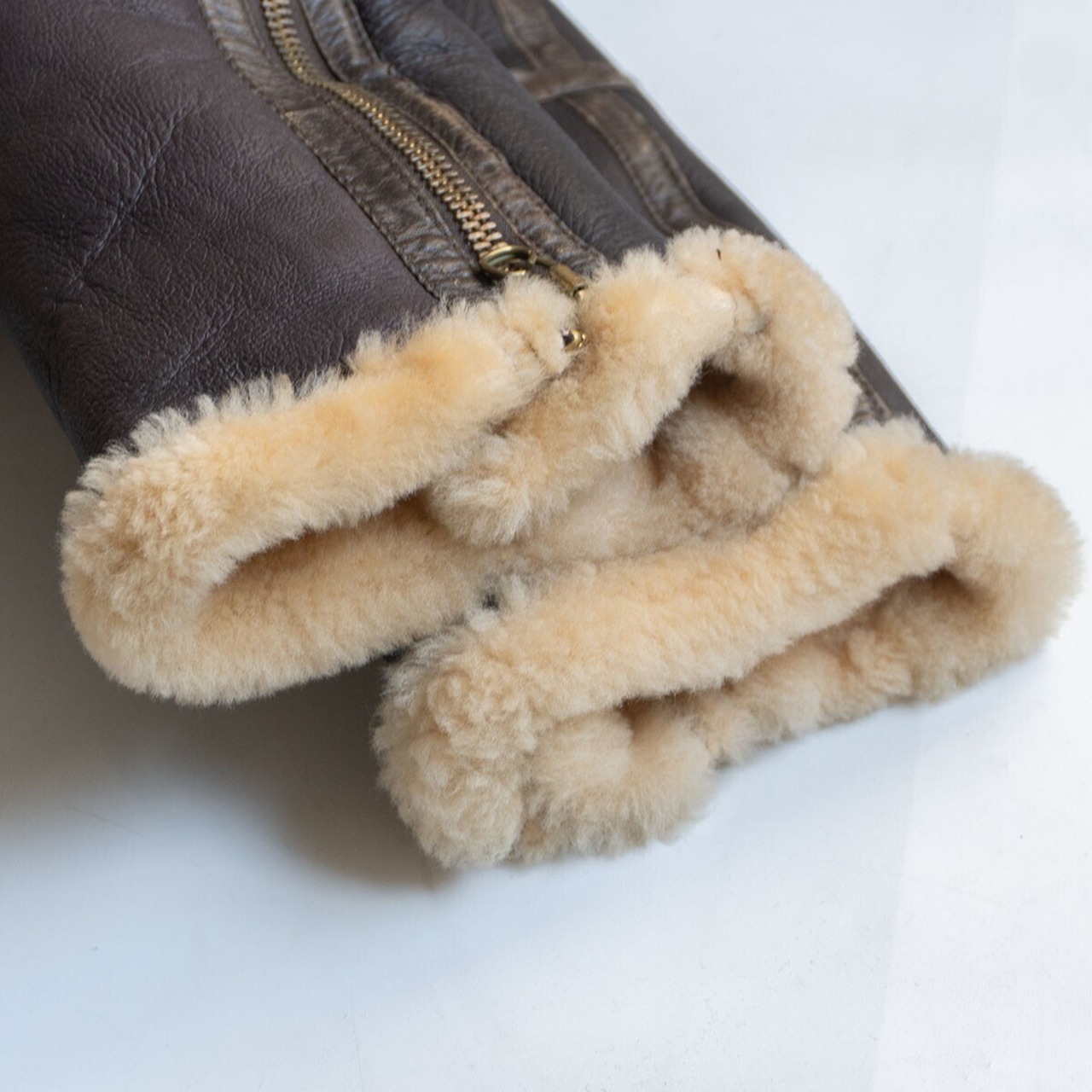 ボディには肉厚ながらモチっとした弾力性を持つ上質のシープスキン(羊革)が使用されております。裏地にはふかふかのムートンボアが敷き詰められ最高の着心地・防寒性を誇ります。こちらはRAFタイプの希少なモデルです。良いものをお探しの方は是非。