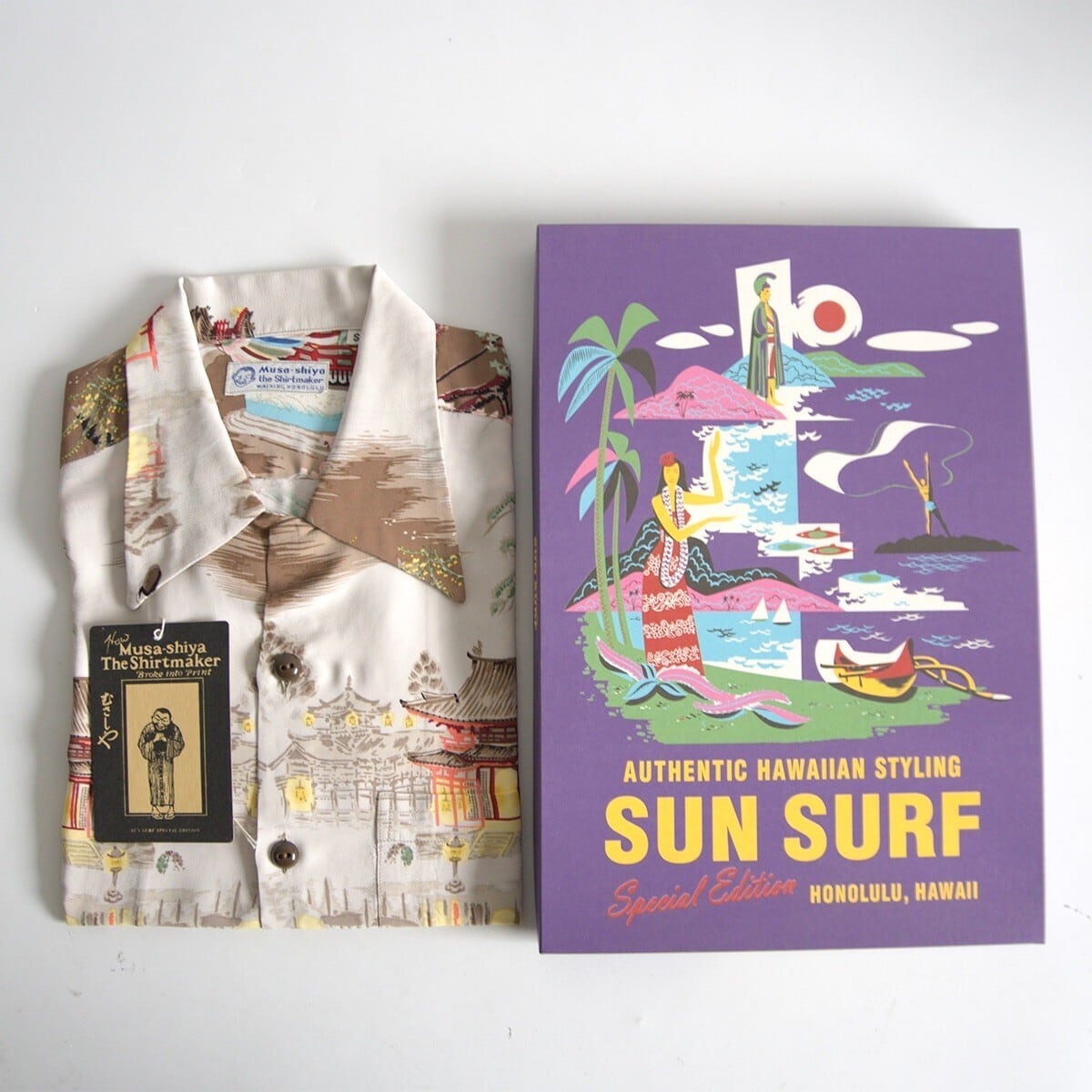 【箱付き未使用品】SUN SURF 【SS33560/MUSASHI-YA "ROYAL FLOATS & BYODOIN" アロハシャツ】S レーヨン サンサーフ 26010206