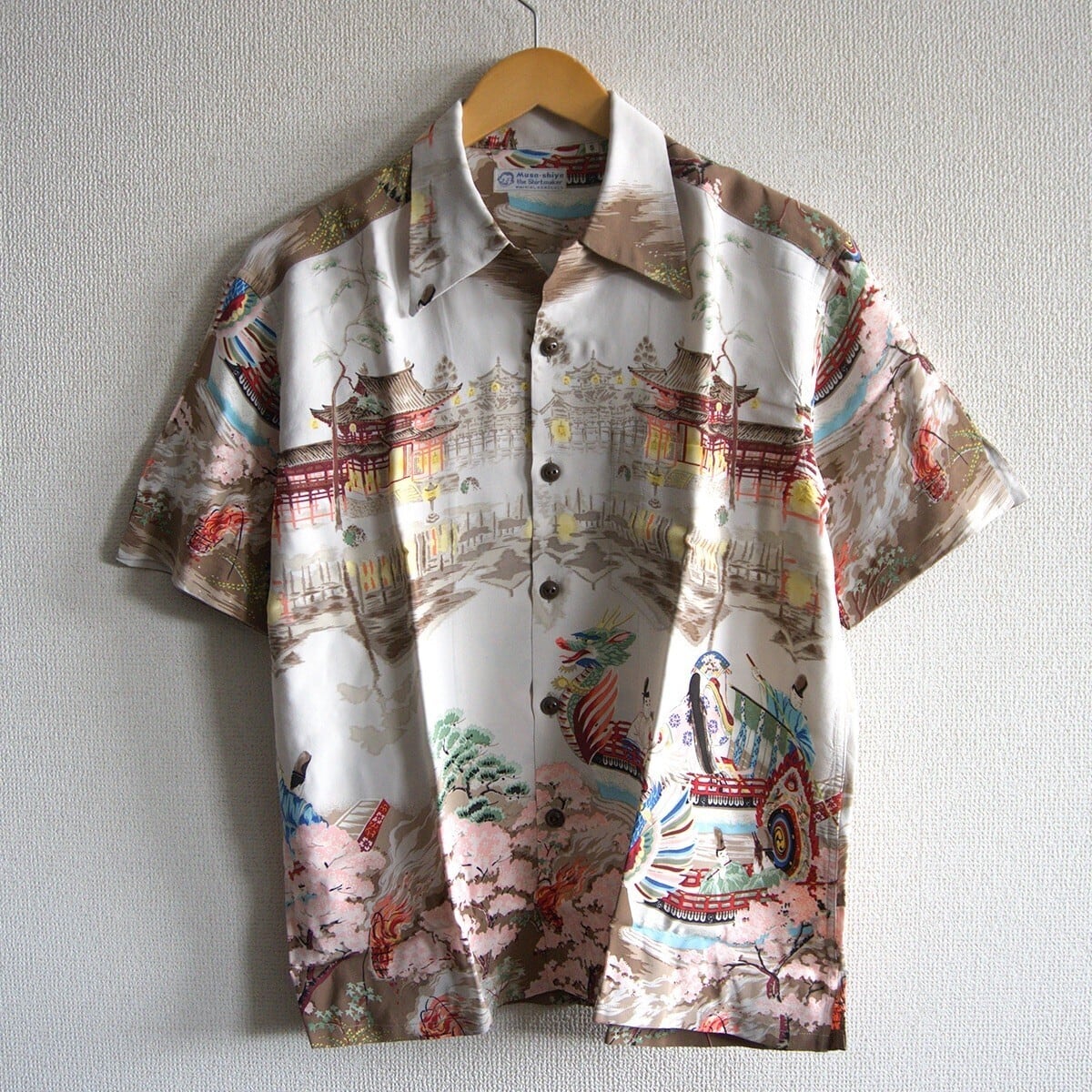 描かれているデザインは10円硬貨で有名な平等院鳳凰堂であり、その正面に広がる阿字池に浮かぶ龍頭船で雅楽に舞う官女がシャツ全体にホリゾンタルに描かれた秀逸で稀少な作品。レーヨン100%で肌触りや着心地も良いです。お探しの方や気になる方は是非。
